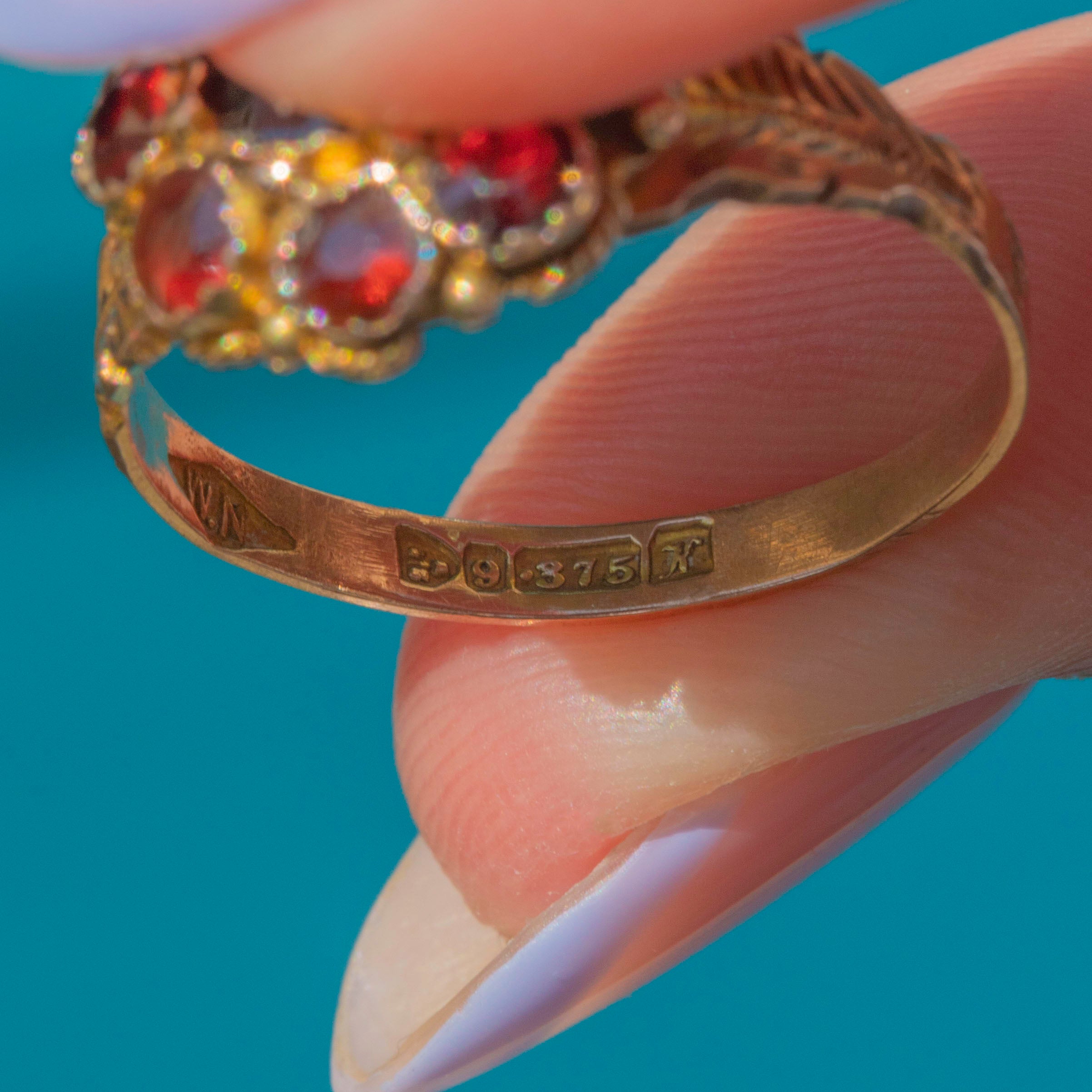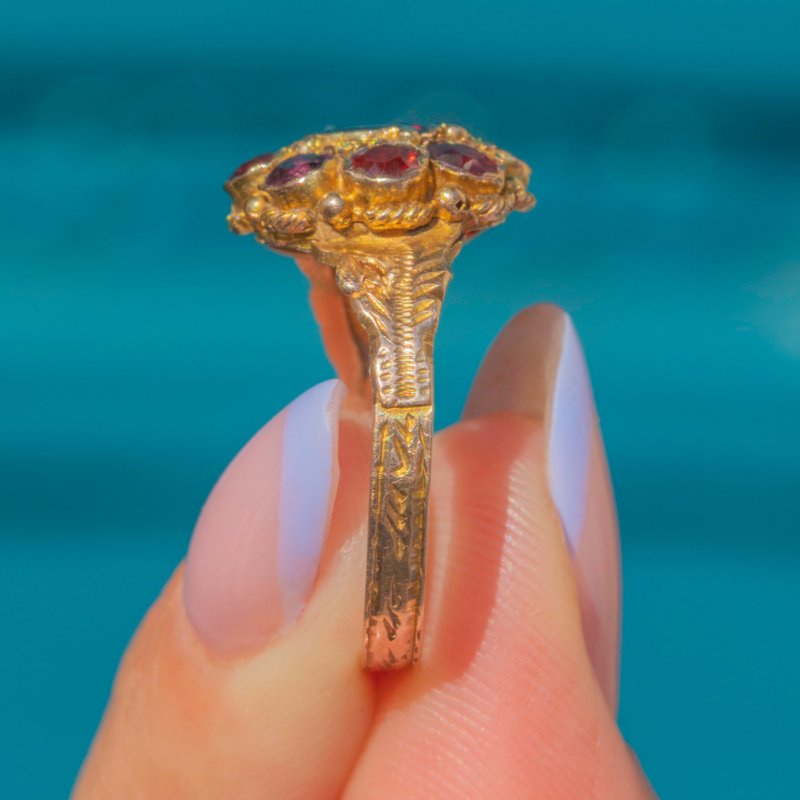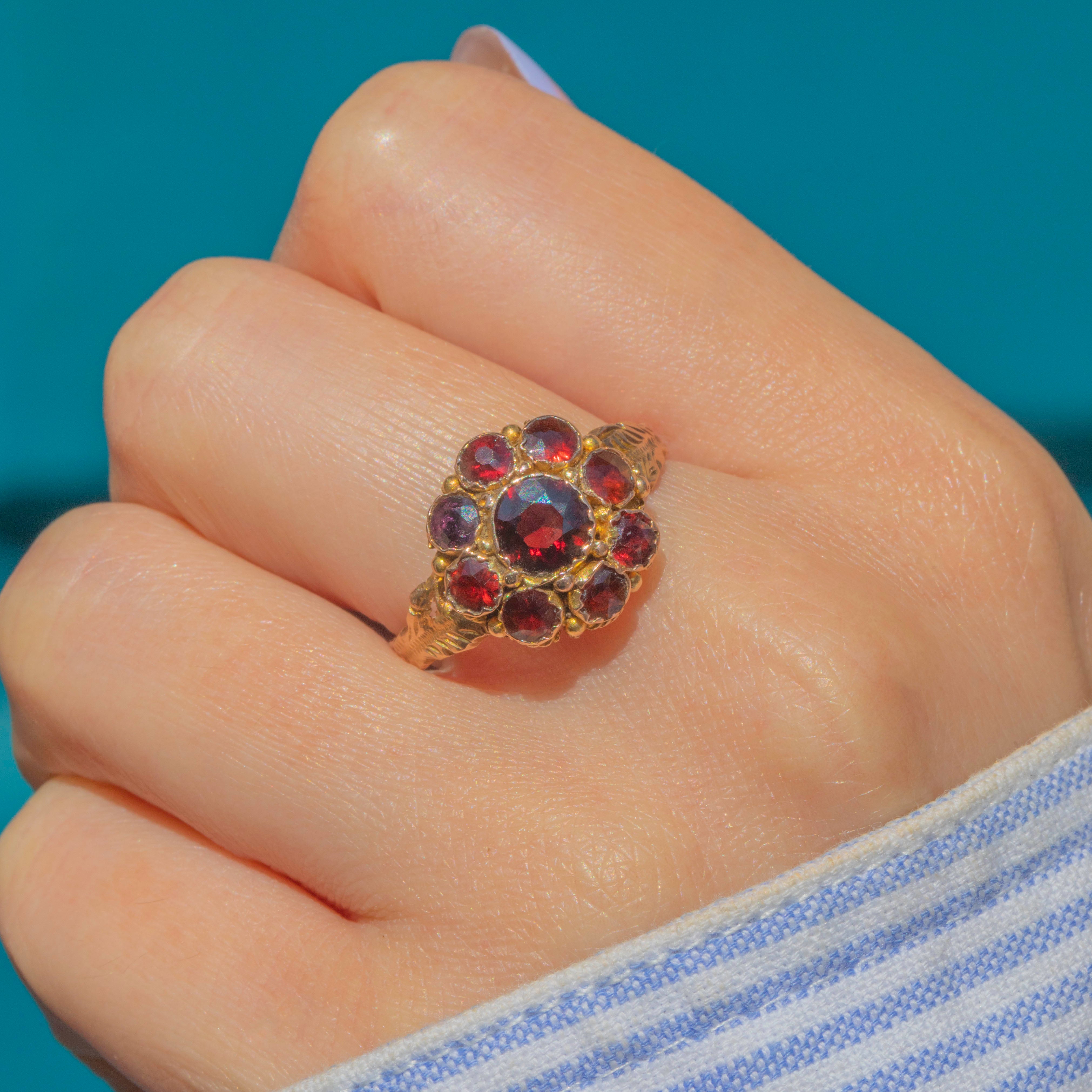 A unique antique 9ct Gold Garnet flower cluster ring for your collection. This piece has been set with a gorgeous selection of round Garnet gemstones, each one juicy and plump!