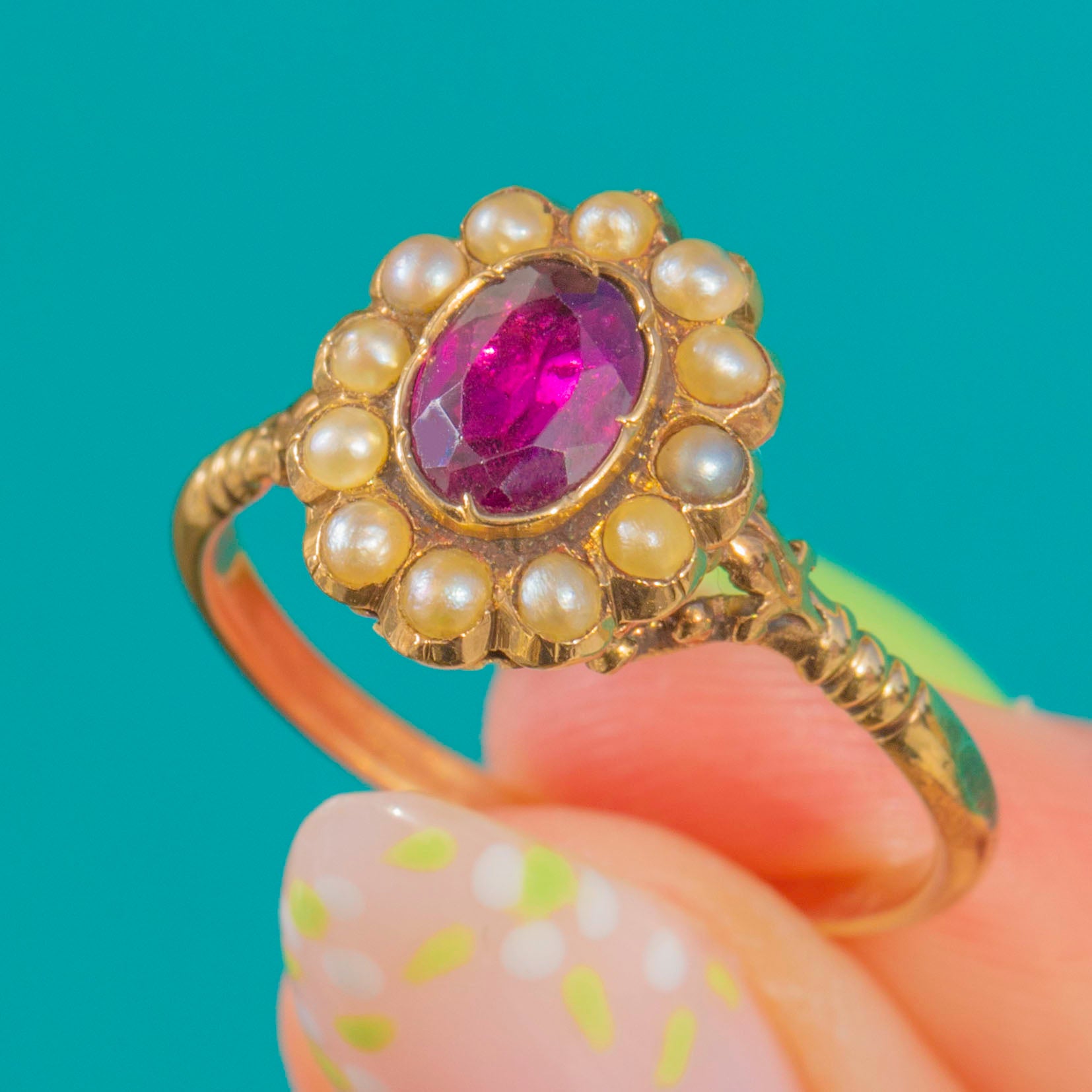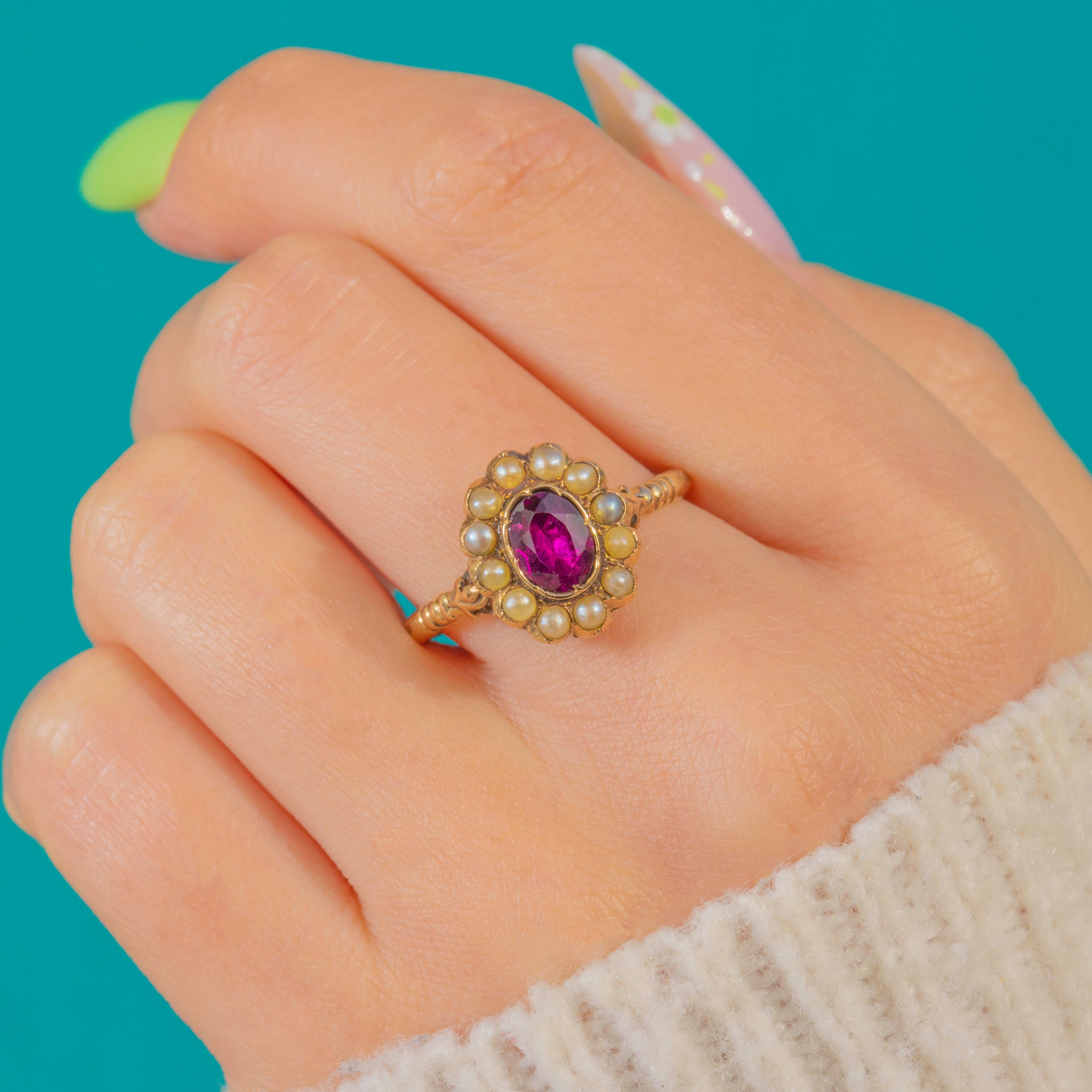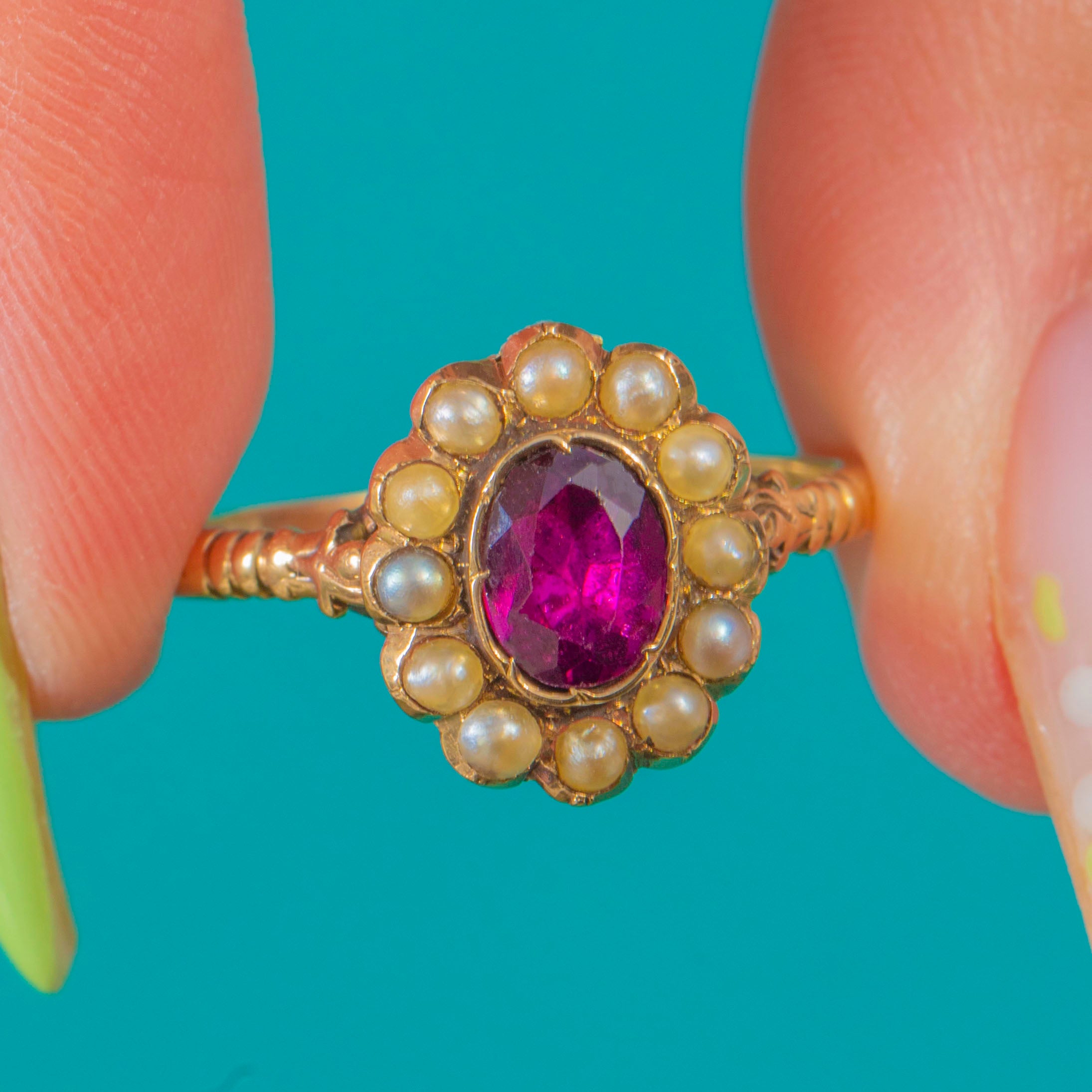 A romantic Edwardian 9ct Gold cluster ring set with a vivid oval Garnet, its rich magenta-pink tones framed by a halo of creamy Seed Pearls. The scalloped, floral-style bezel and raised closed-back collet lend graceful height and poise, while the warm Gold glows beautifully against the gemstones.