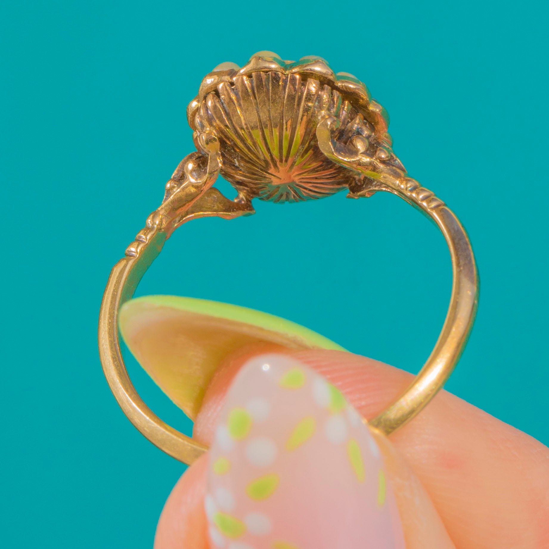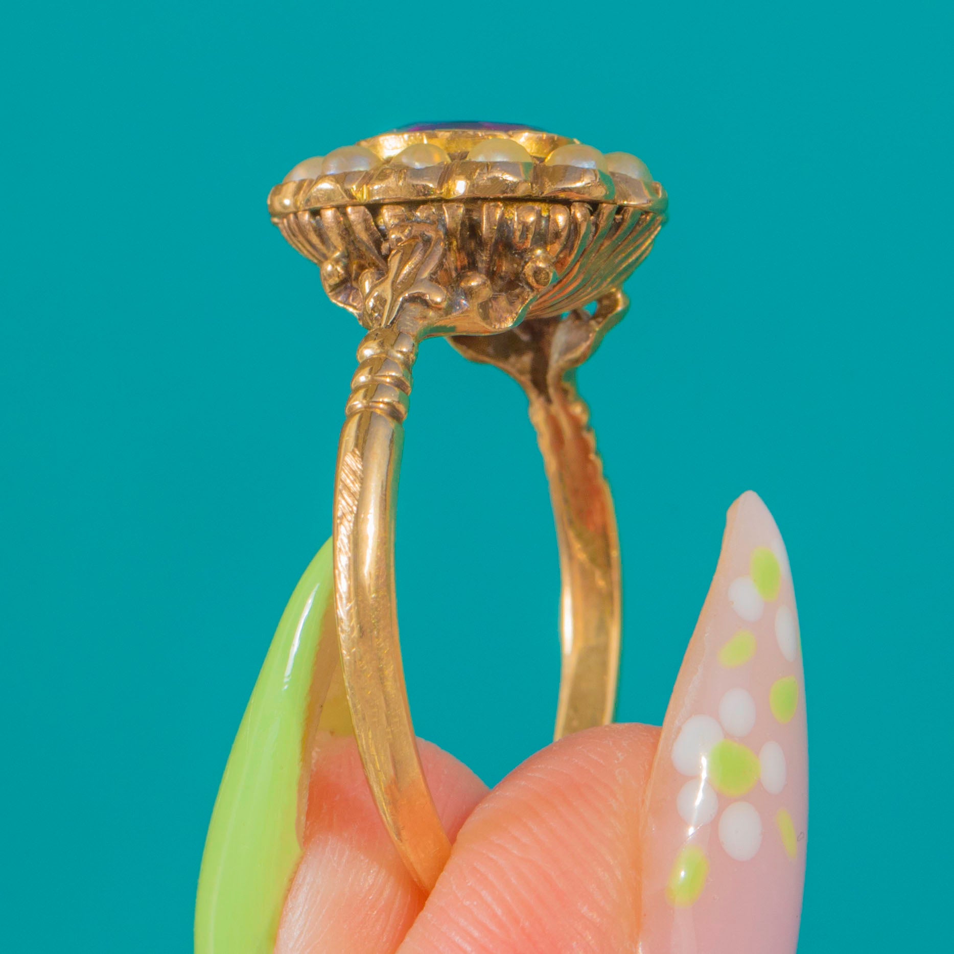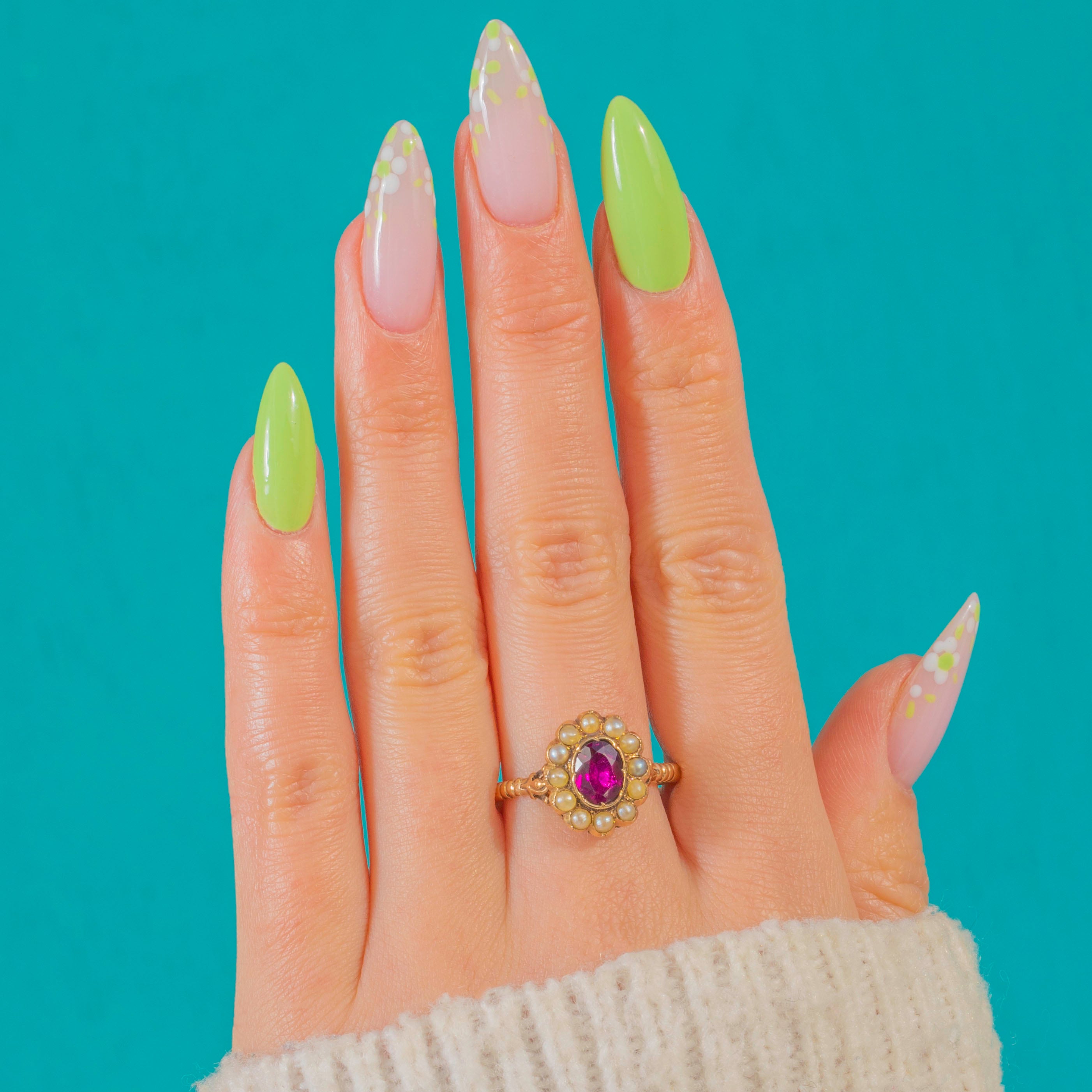 A romantic Edwardian 9ct Gold cluster ring set with a vivid oval Garnet, its rich magenta-pink tones framed by a halo of creamy Seed Pearls. The scalloped, floral-style bezel and raised closed-back collet lend graceful height and poise, while the warm Gold glows beautifully against the gemstones.