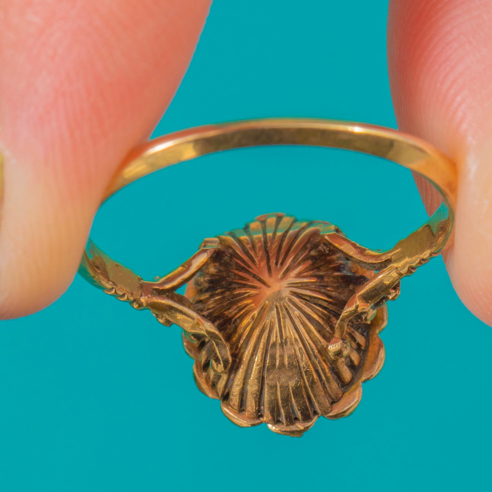 Delicate rope-twist shoulders and applied foliate scrolls lead to a slender shank, with a pretty radiating under-gallery completing the antique craftsmanship. Elegant and feminine, this classic Garnet-and-Pearl combination offers a timeless flourish of colour for every day or occasion wear.