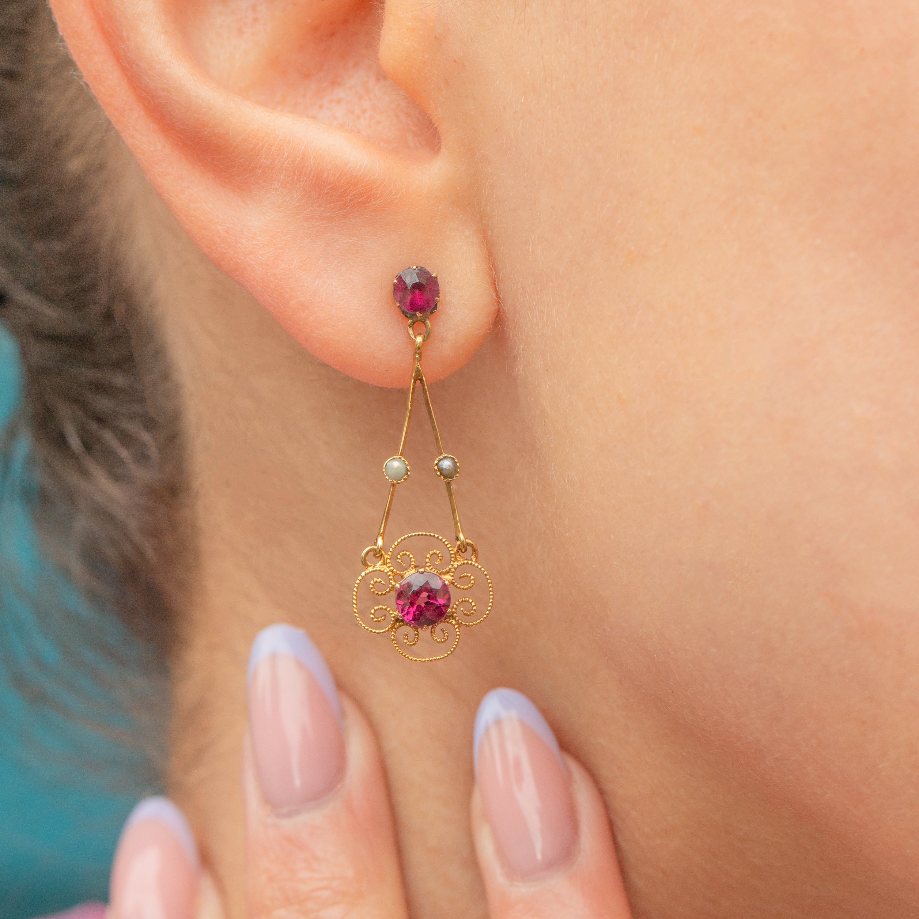 These stunning antique 9ct Gold Garnet Pearl floral drop earrings feature rich and bright berry-toned Garnets surrounded by delicate Seed Pearls in a charming floral cluster design. Edwardian era and crafted in 9ct Gold, their elegant drop style adds graceful movement and timeless appeal.