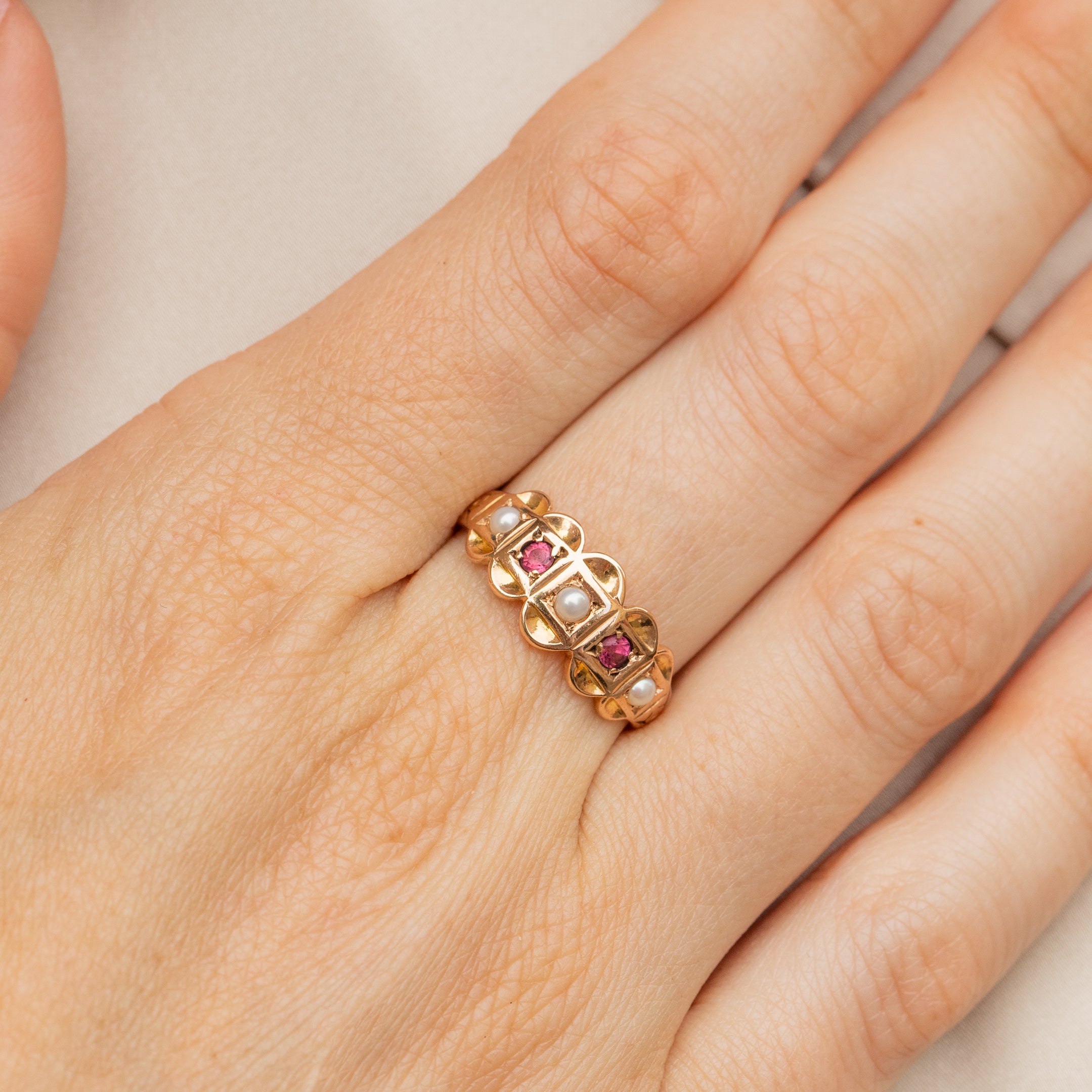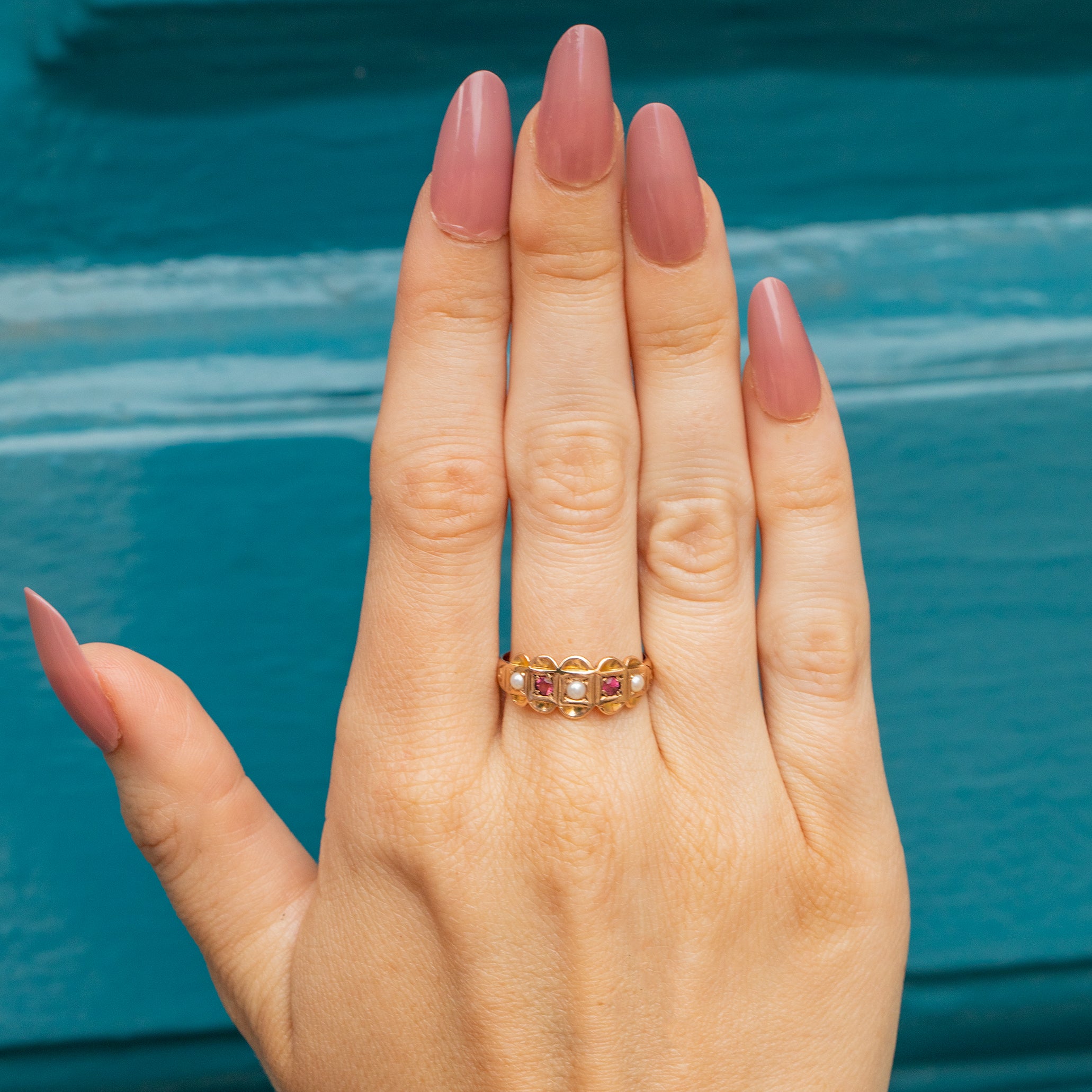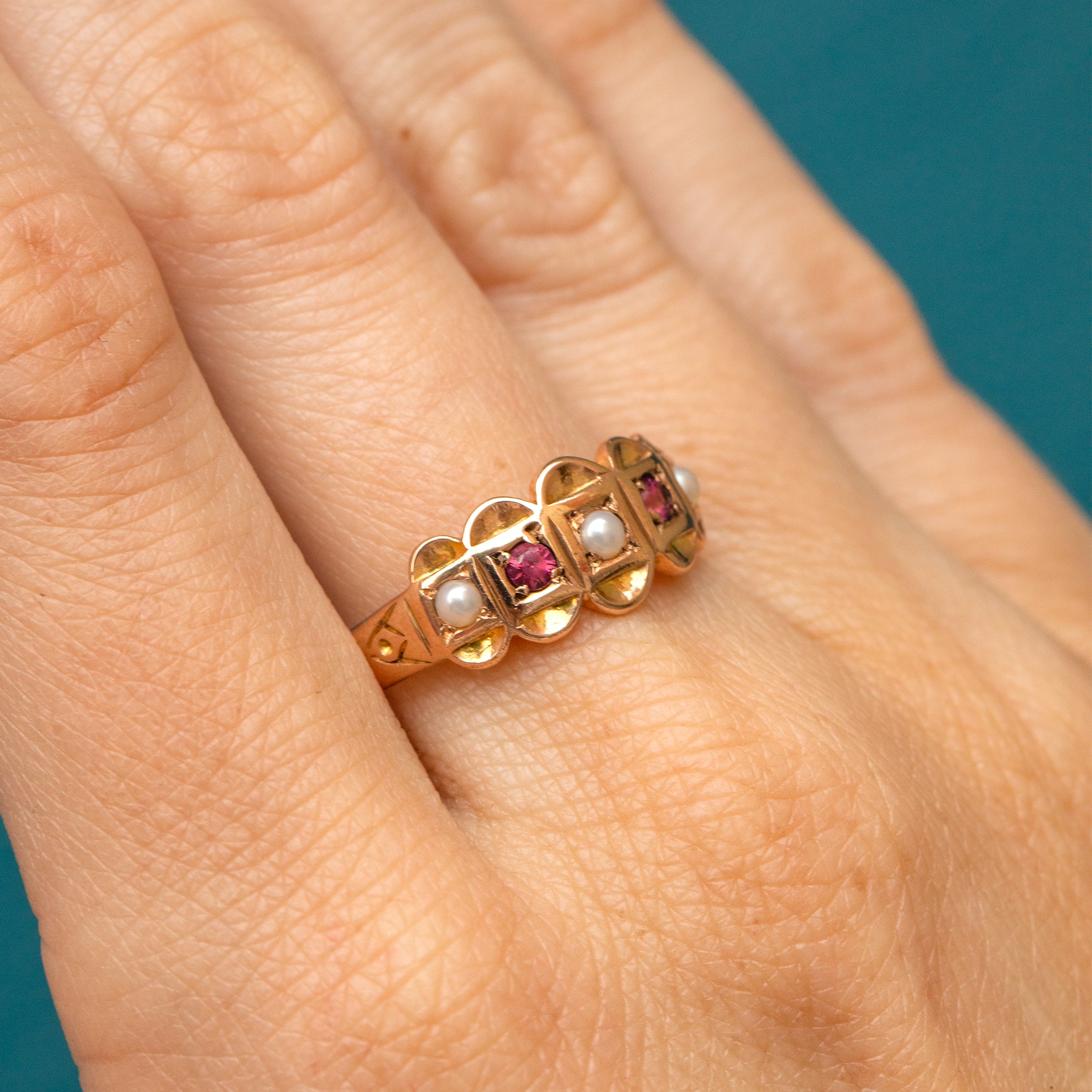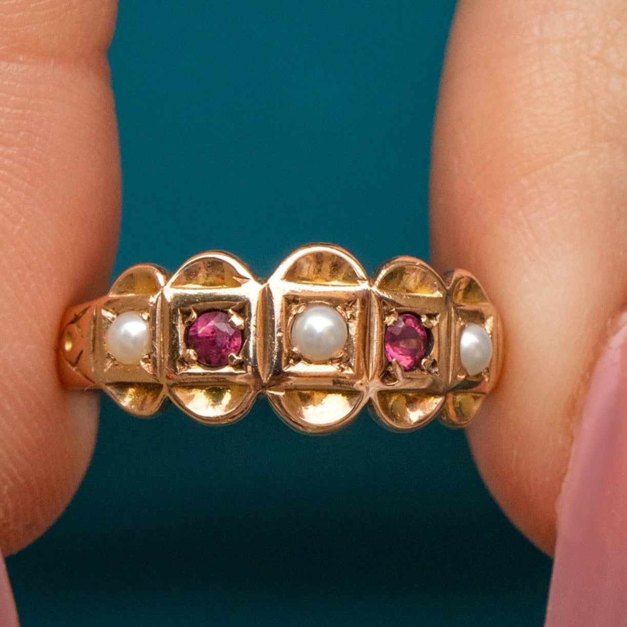 Antique 9ct Gold Garnet Pearl Ring, Scallop Edge
