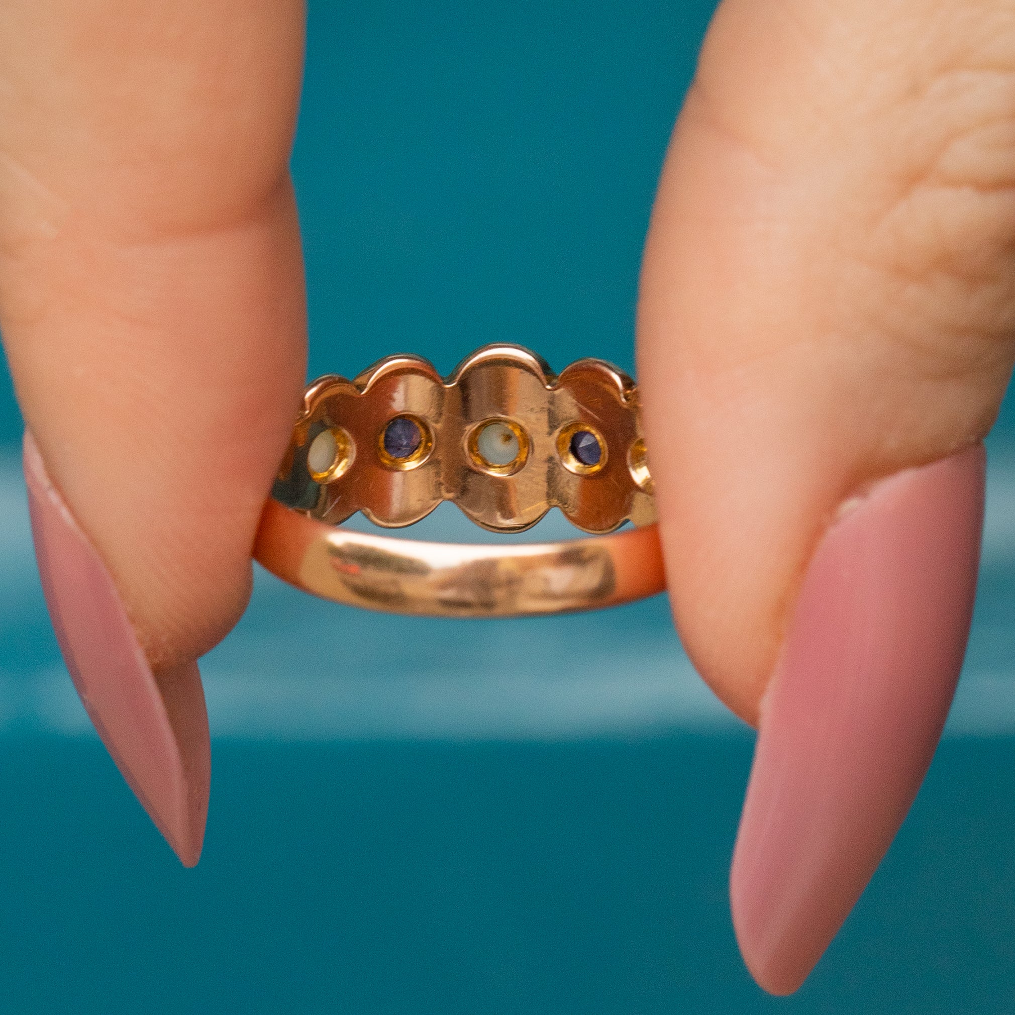 This antique 9ct Gold Garnet Pearl ring is such a delightful find! The ring face displays an alternating pattern of Garnets and Pearls, framed by a scalloped edge border making her a unique addition to your collection.