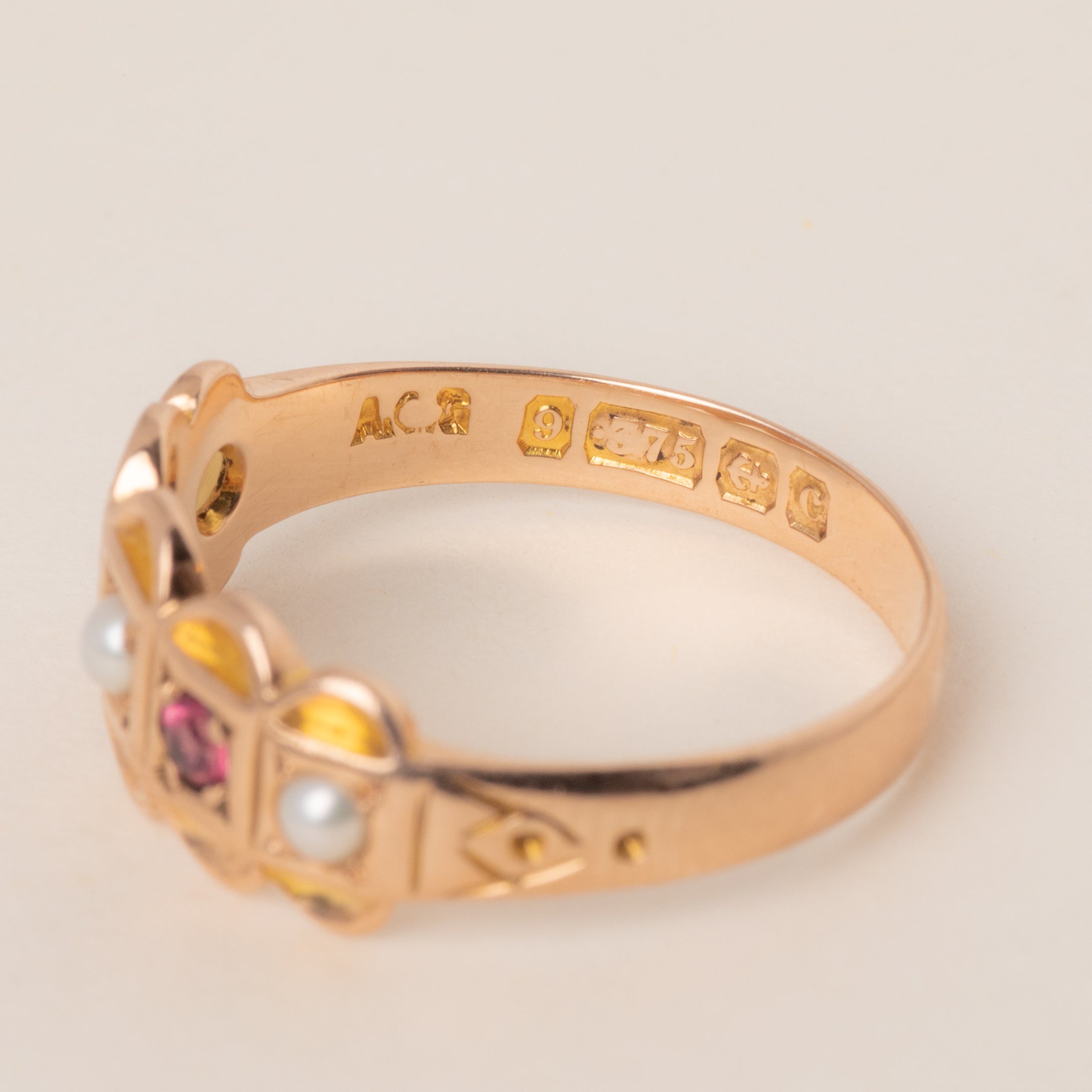 EXCELLENT. In excellent condition, this antique 9ct Gold Garnet Pearl ring can be thoroughly enjoyed. The gemstones are all securely set, and the scallop edge is so nice and smooth to the touch. The inside of the band has a full set of English antique hallmarks, and the band is smooth and comfortable to wear. What's not to love?!