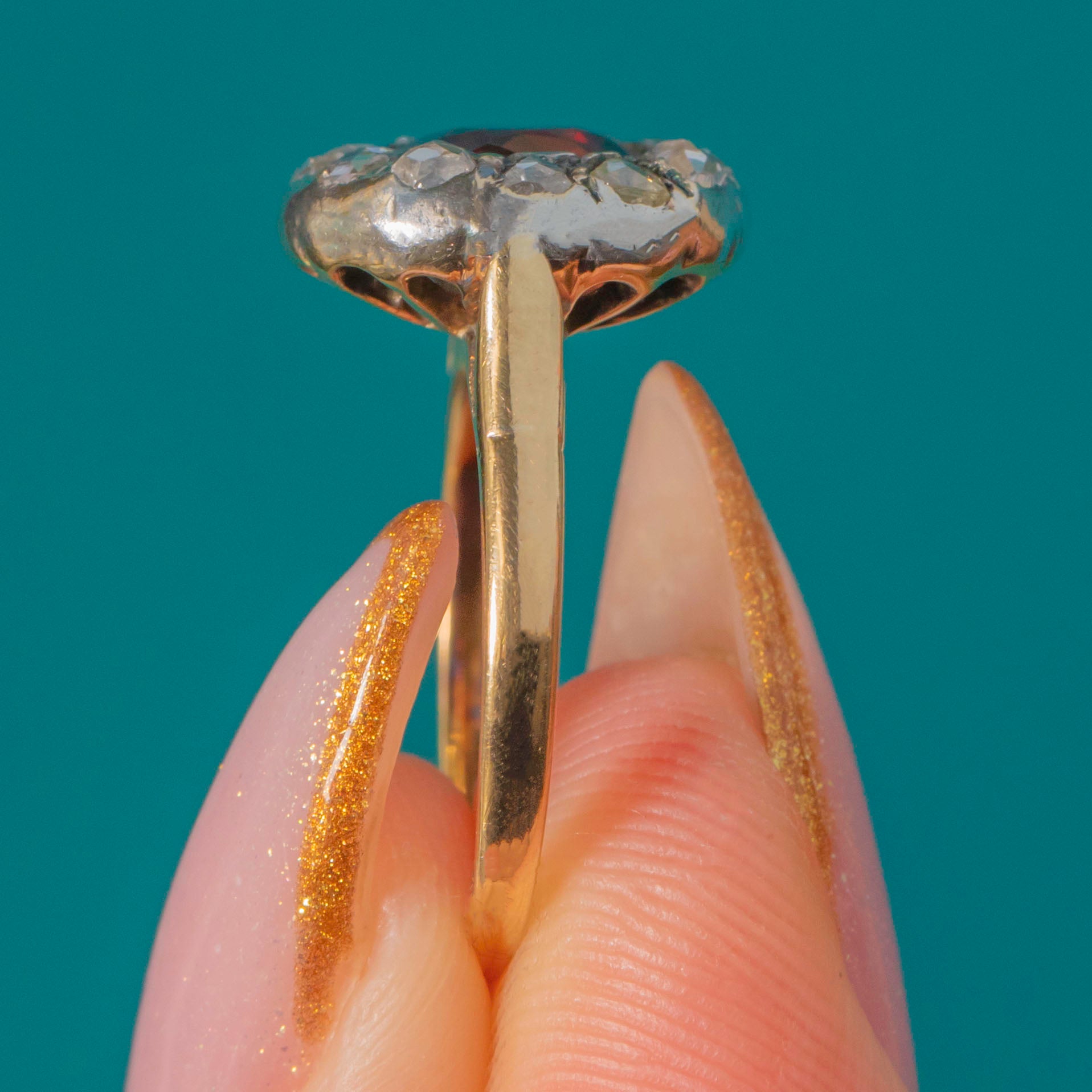 The centre Garnet is approximately 0.70ct, its deep hue intensified by the handmade antique setting. Around it, twelve petite rose-cuts (approx. 0.25ct combined) twinkle with that distinctive old-world sparkle. We love the pretty floral, openwork gallery—an elegant finishing touch that looks as beautiful from the side as it does from the top.
