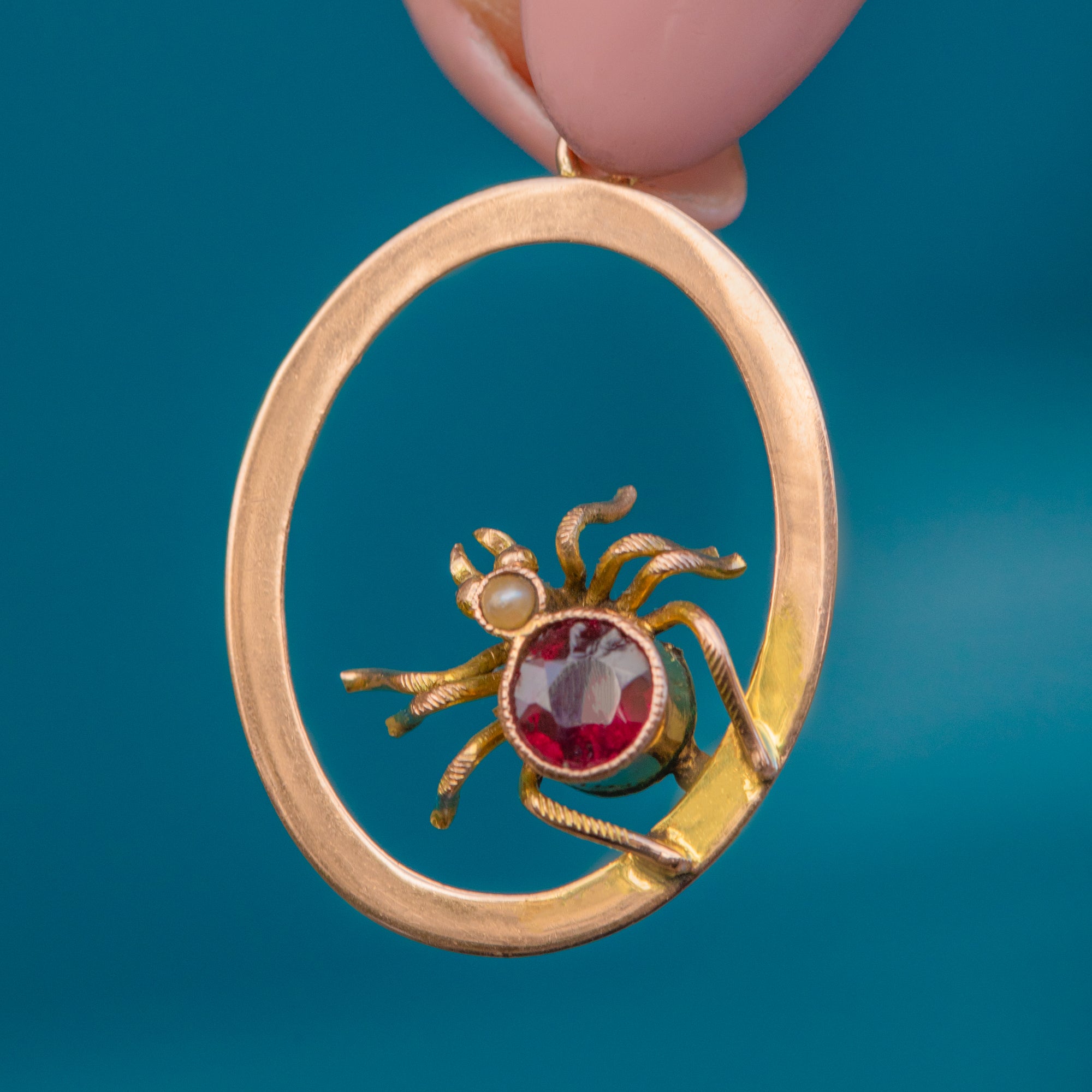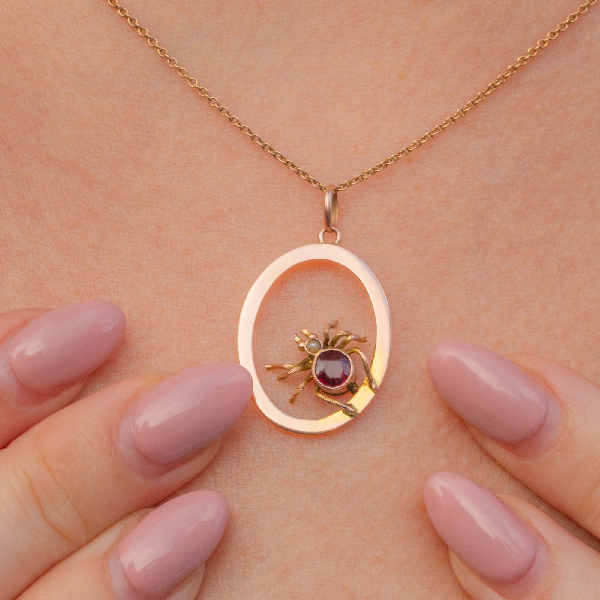 There is nothing creepy about this exceptionally beautiful Antique 9ct Gold Garnet Spider Pendant with 15" Chain. Possessing a mysterious allure, her Spider is composed of a wonderfully faceted Garnet, accented with a lustrous seed Pearl.
