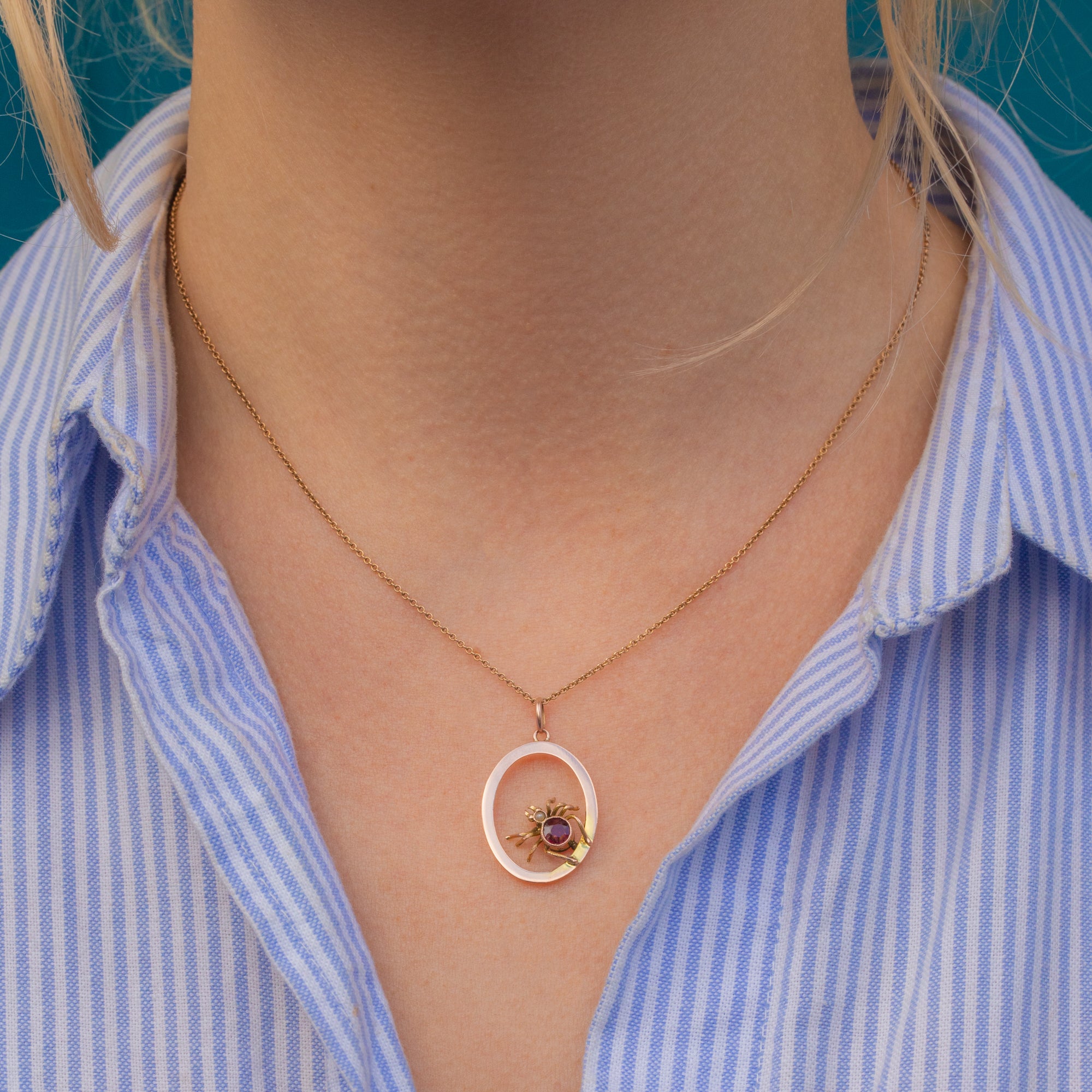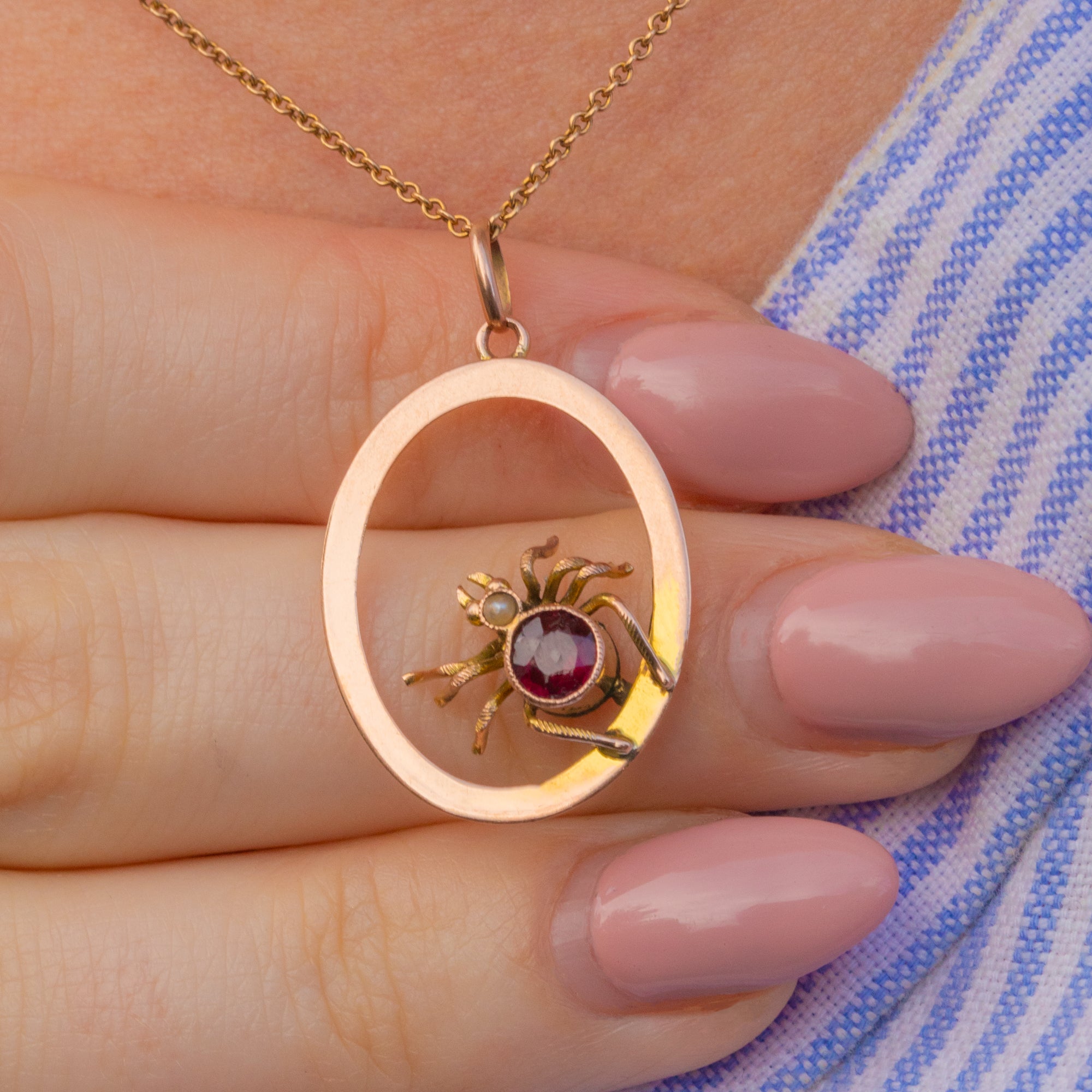 Exuding sangria red hues, her Garnet magically twinkles in the light. Such a wearable size, this Edwardian spider pendant will charm its way into becoming your new favourite piece. Who knew that spiders could look so desirable?!
