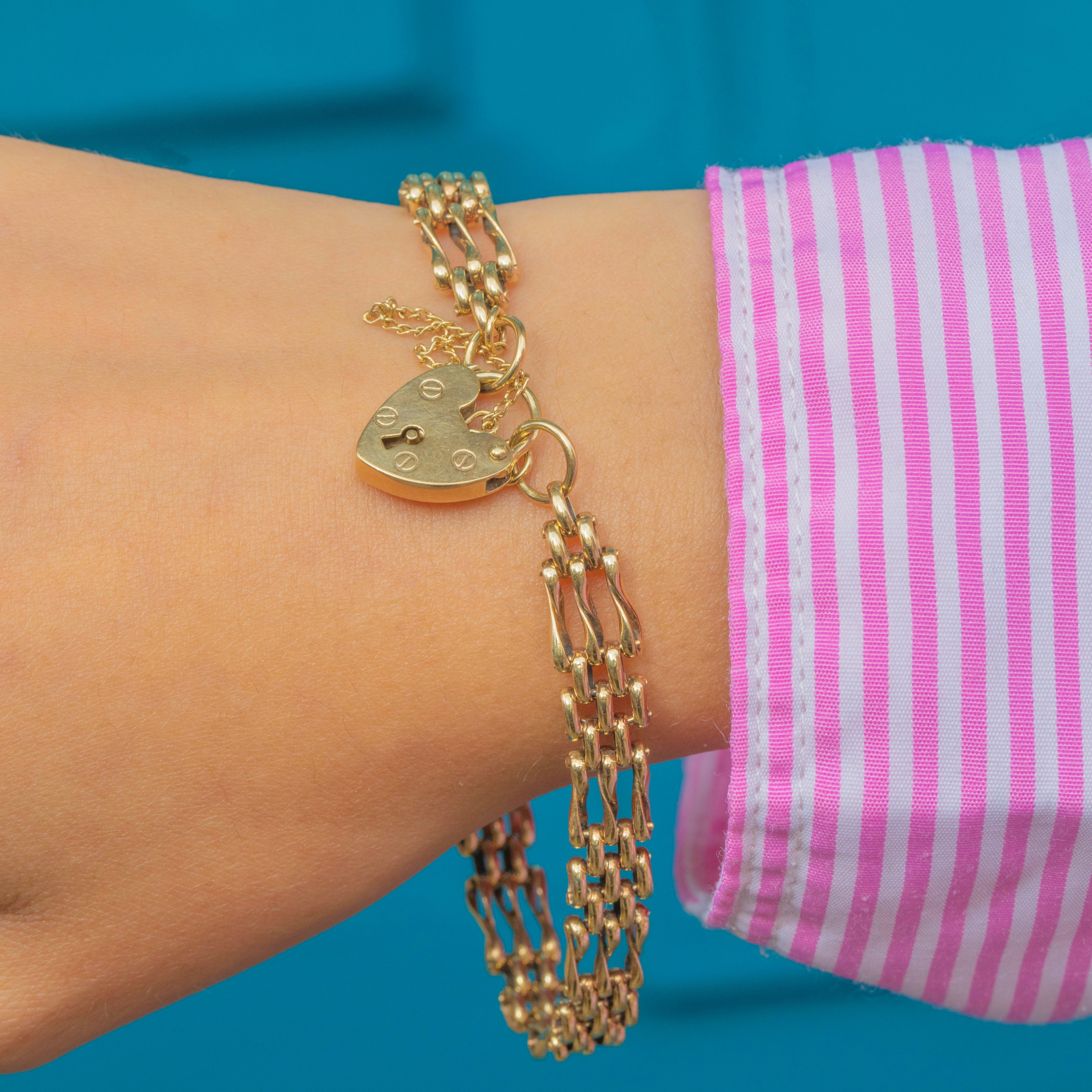 Antique 9ct Gold Gate Bracelet, Heart Padlock Clasp, 13.1g