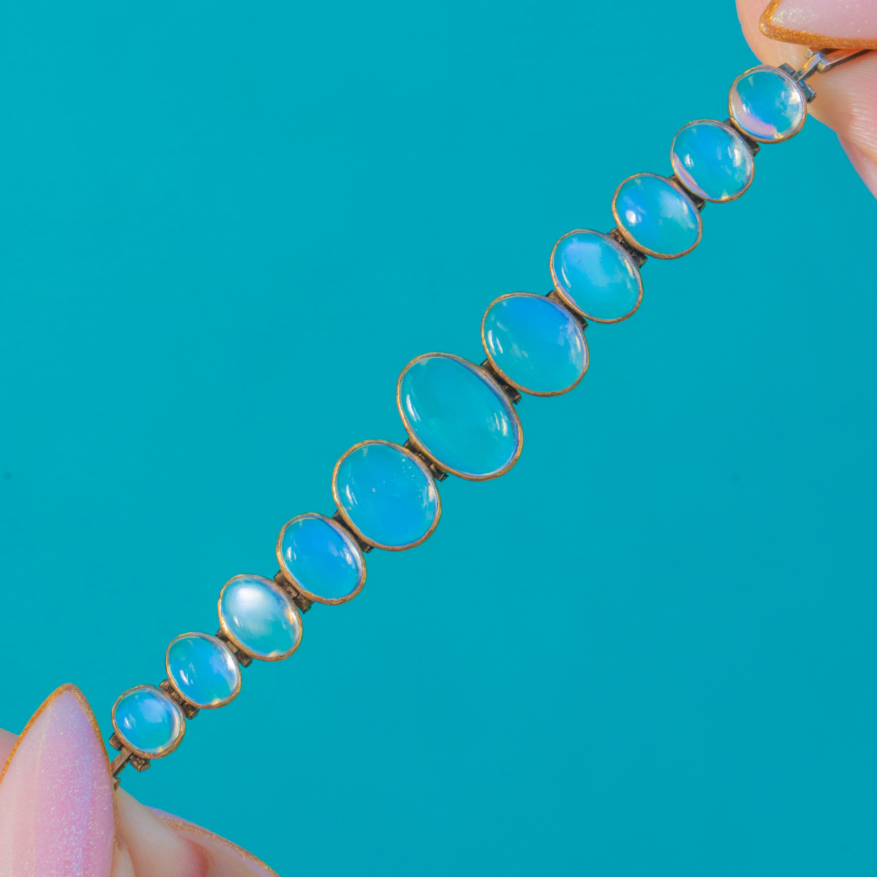 This dreamy Antique Art Deco bracelet is set with a beautiful line of Ceylon Moonstones, softly graduating in size around the wrist. The centre stone is a glowing oval cabochon, with the Moonstones gently tapering to almost-round gems at the ends for a wonderfully fluid, elegant look.