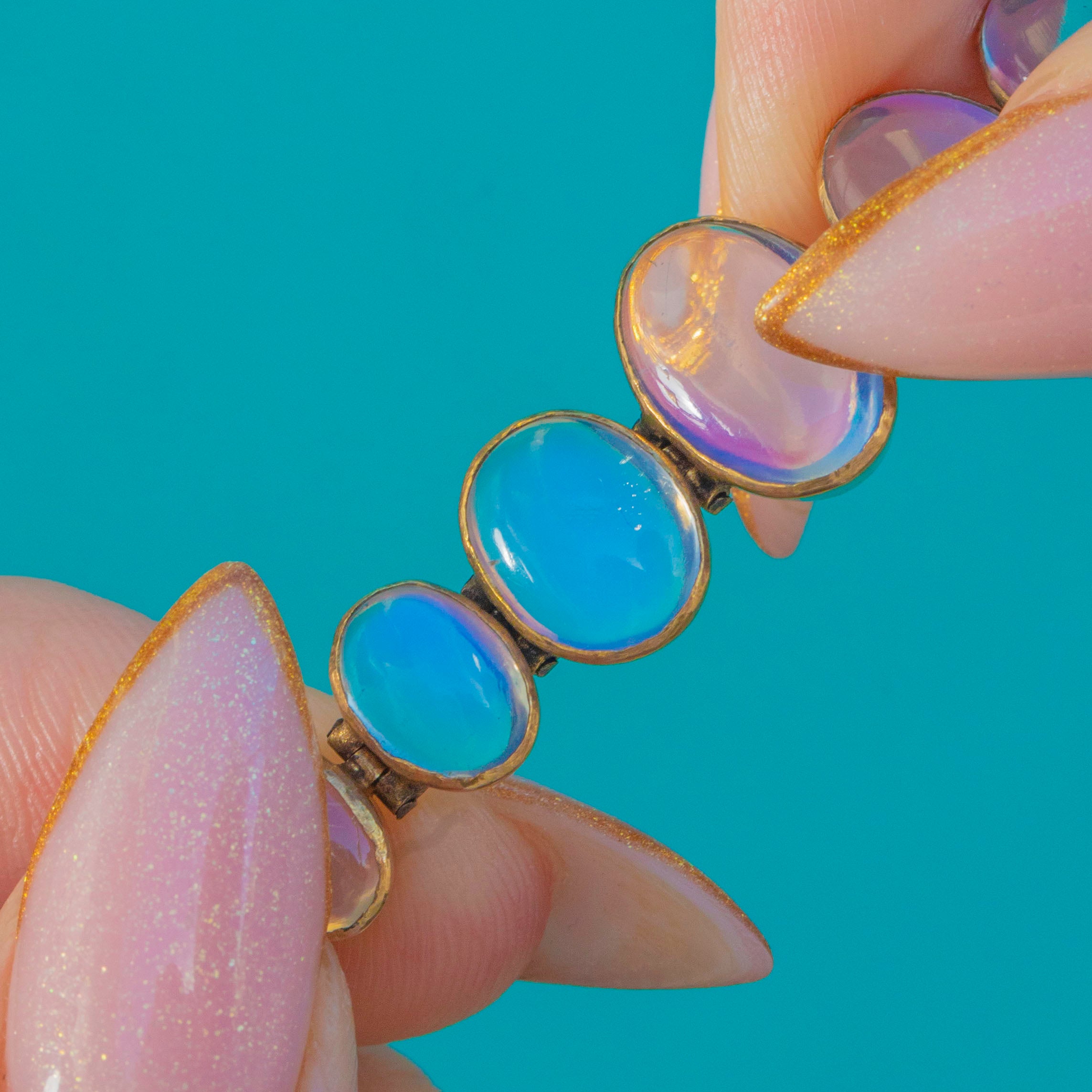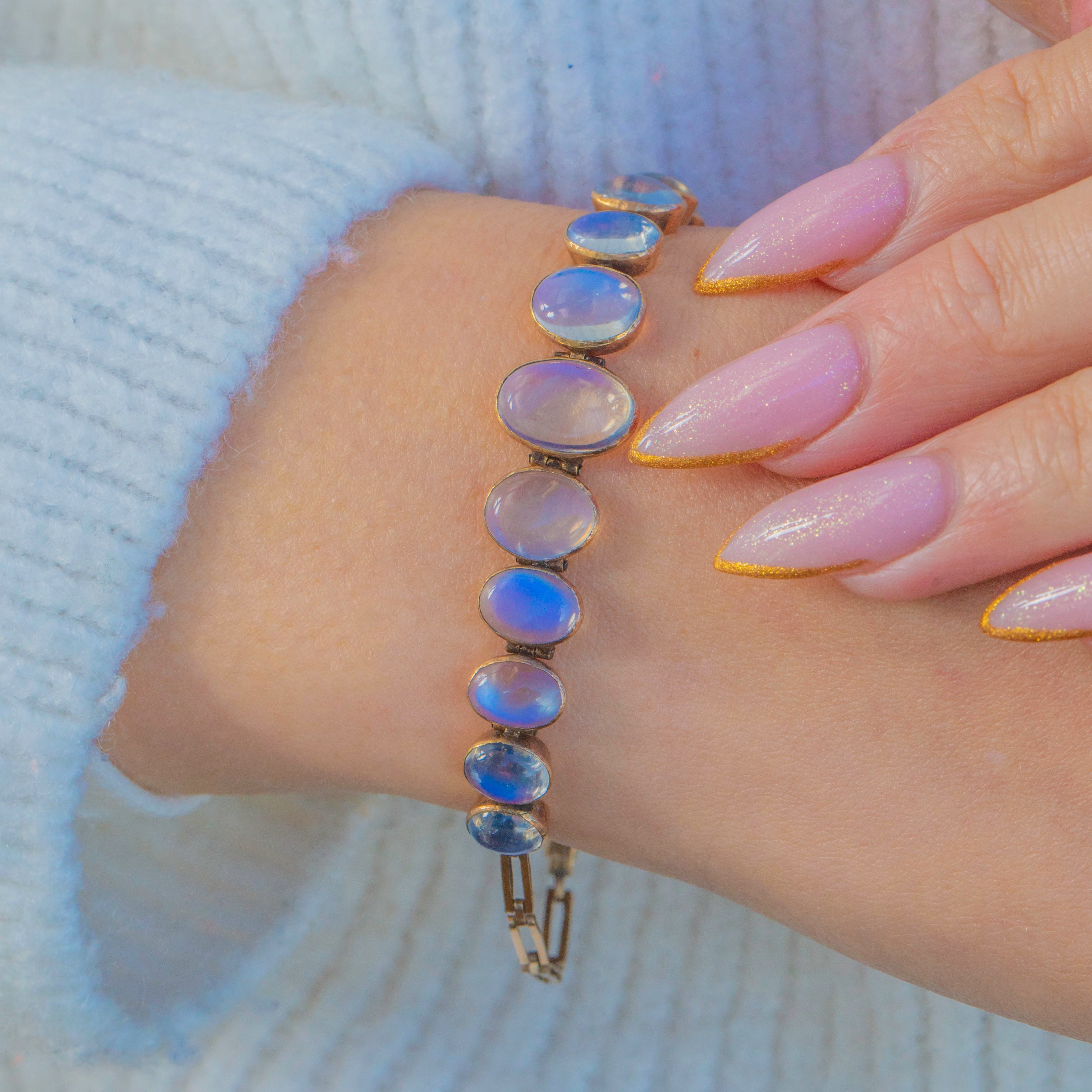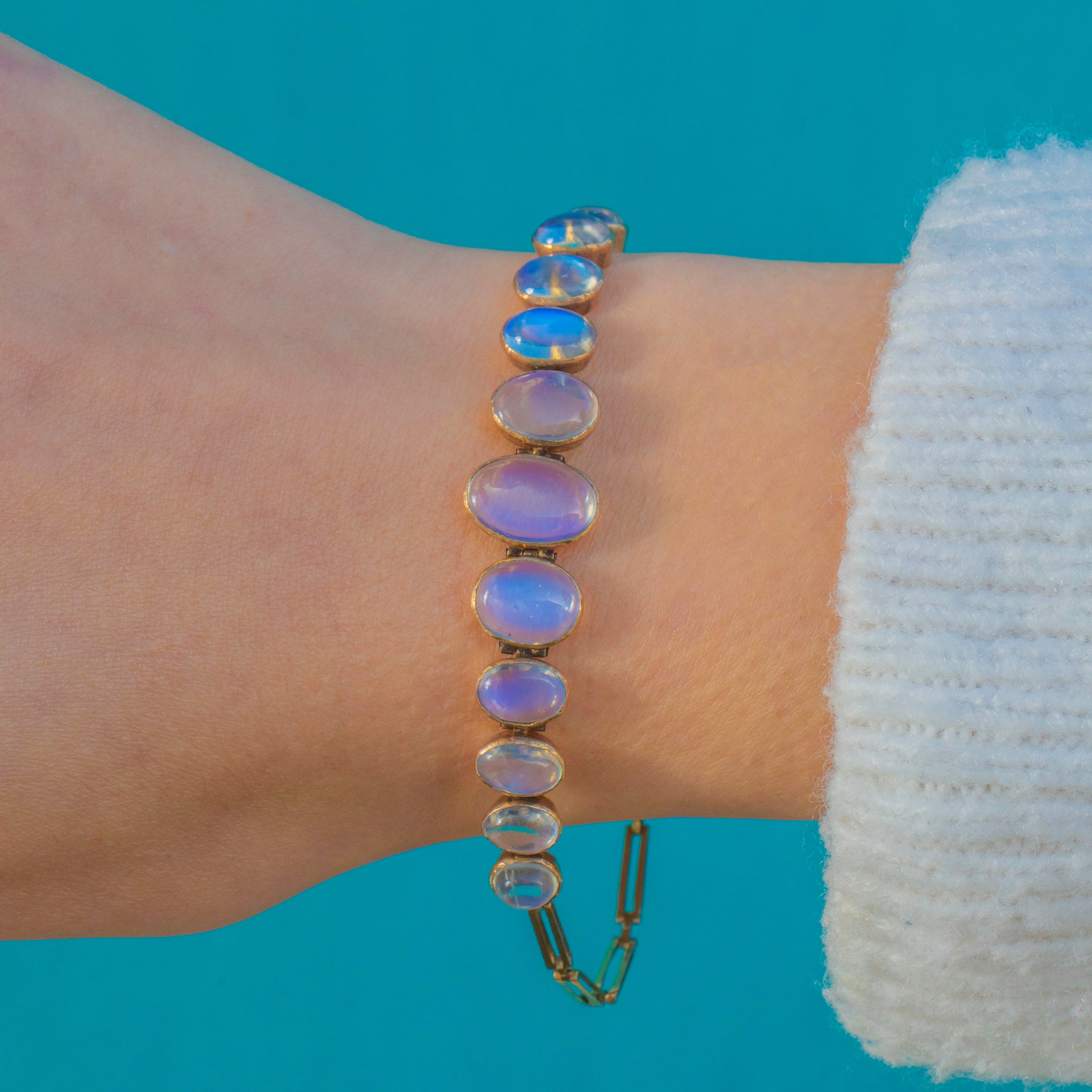 EXCELLENT: The Moonstones are smooth, glossy and well-matched, with no chips or cracks and lovely adularescence throughout. The 9ct Gold settings and links are secure with only light surface wear consistent with age. Clasps and connections are in strong working order, making the bracelet ready for regular wear.