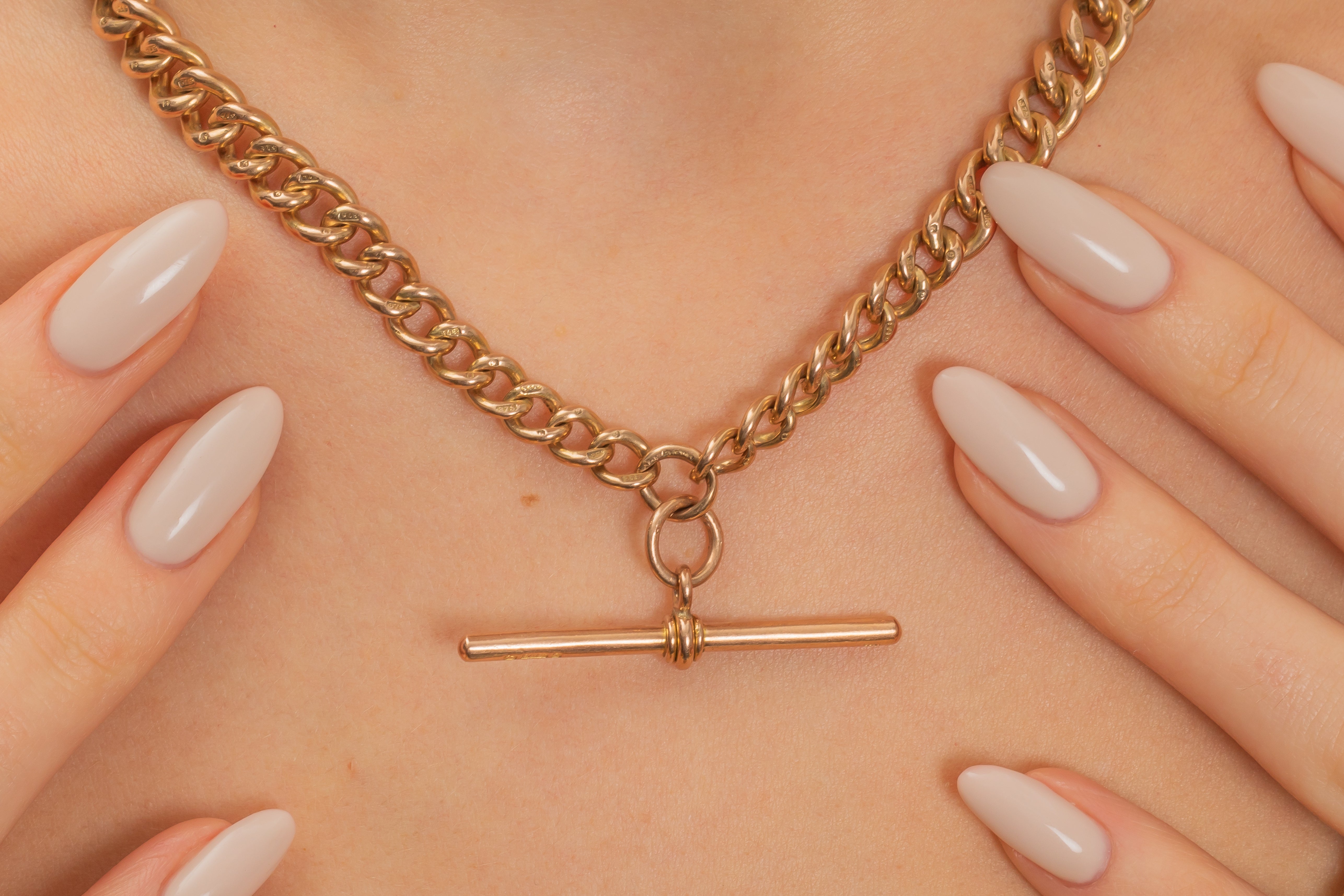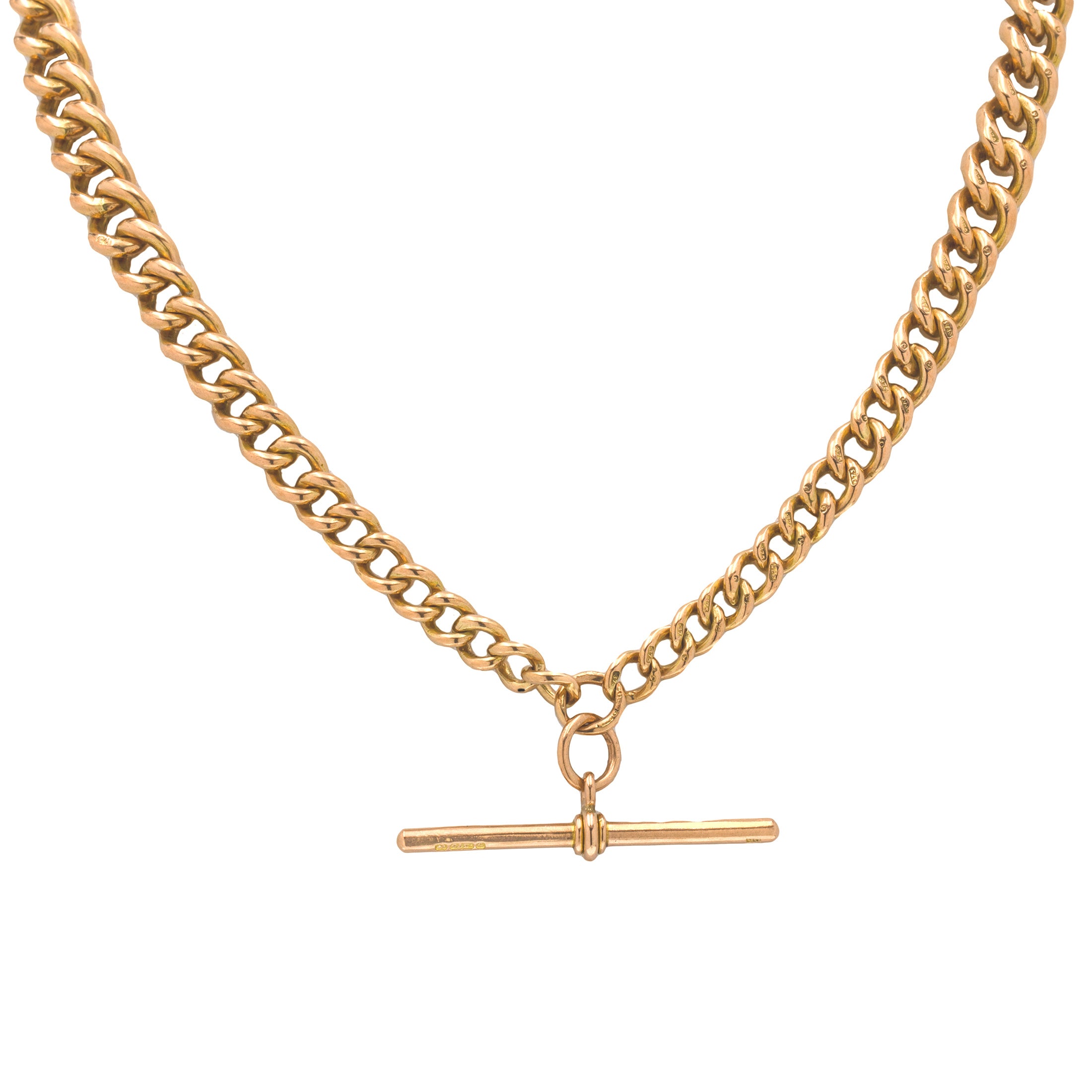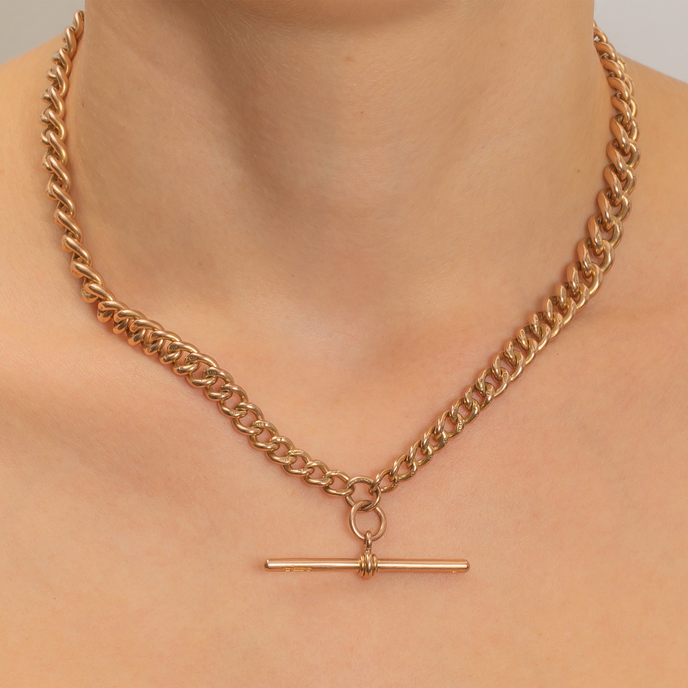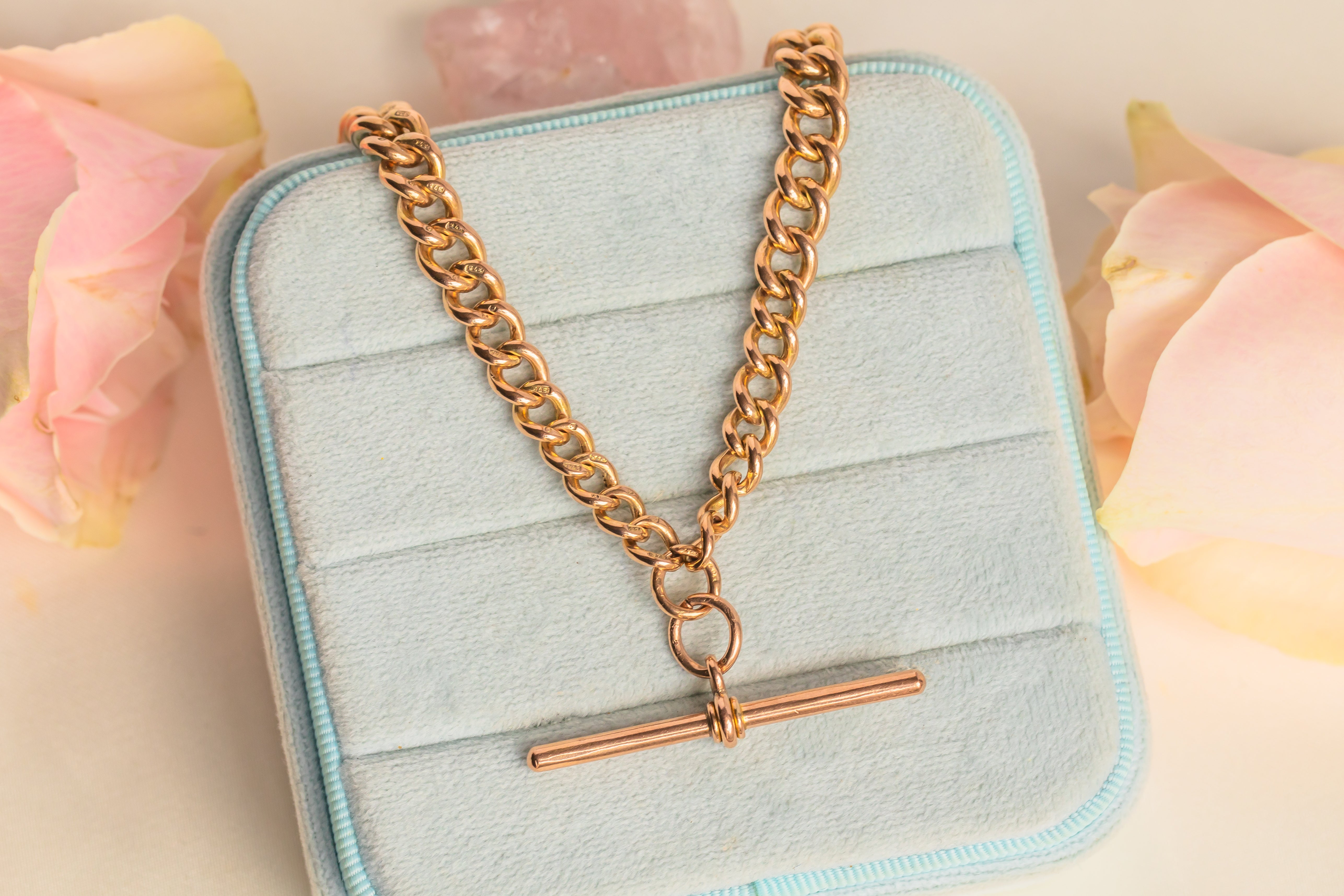 Nothing says statement like this antique 9ct Gold graduating Albert chain, featuring a solid Gold T-Bar. Composed of 52 grams of blushed 9ct Gold, her heartwarming tones radiate across your décolletage as her 16-inch length falls perfectly along your collarbones.