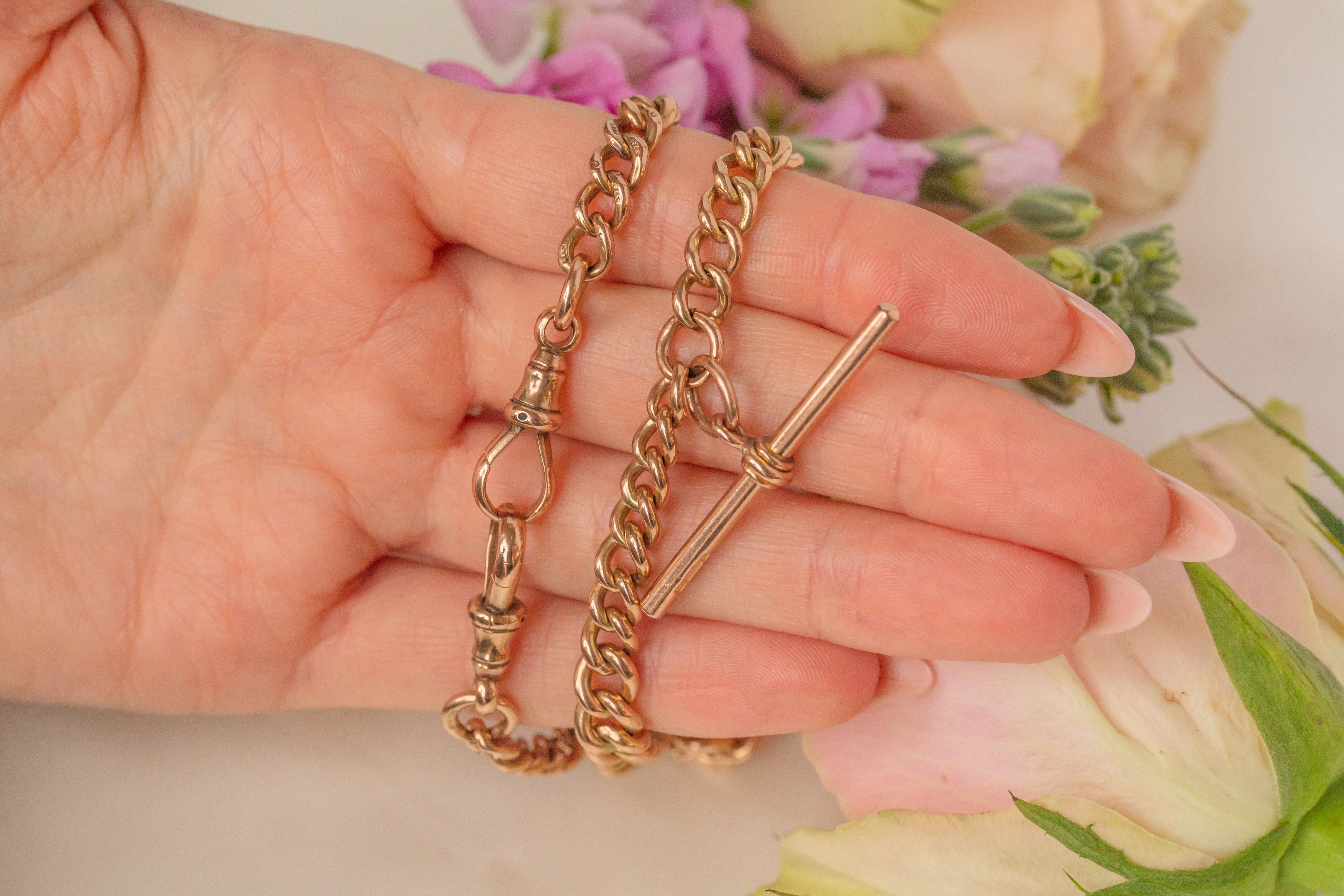 EXCELLENT. This antique 9ct Gold graduating Albert chain is in excellent condition. The 9ct Gold is sun-kissed with each link securely connected and a steady graduation throughout. The dog clips are matching and in perfect working order, making this Victorian Gold chain all the more desirable. The T-Bar is a lovely, traditional Victorian feature making her a truly irresistible antique Gold chain!