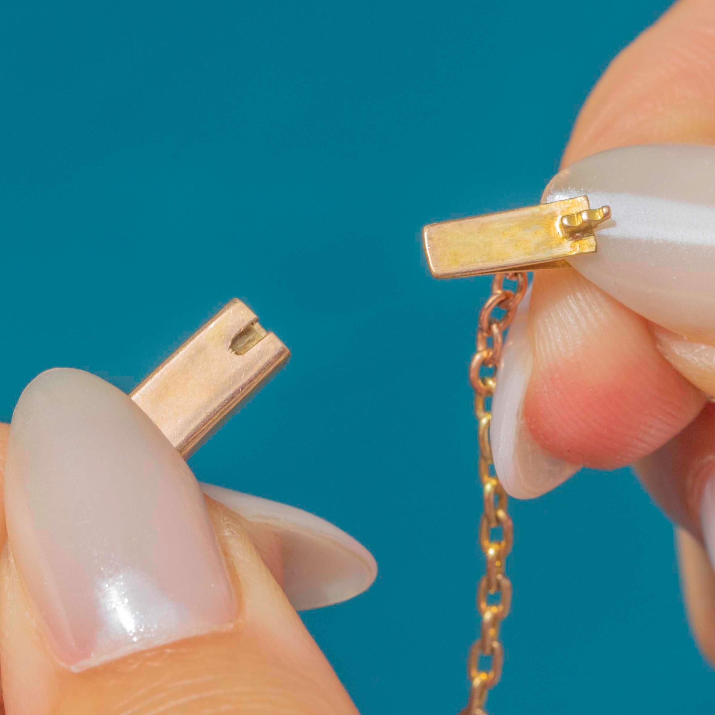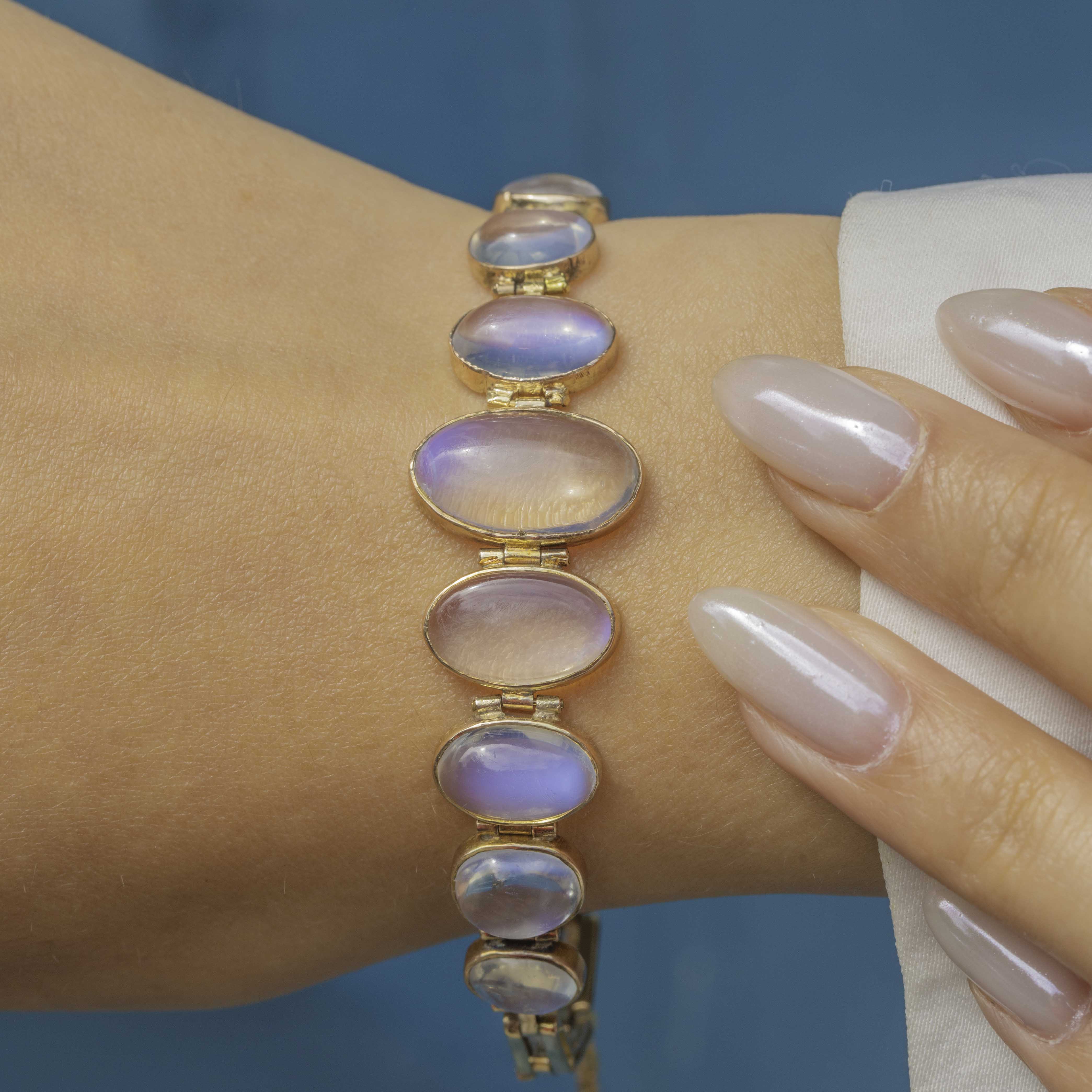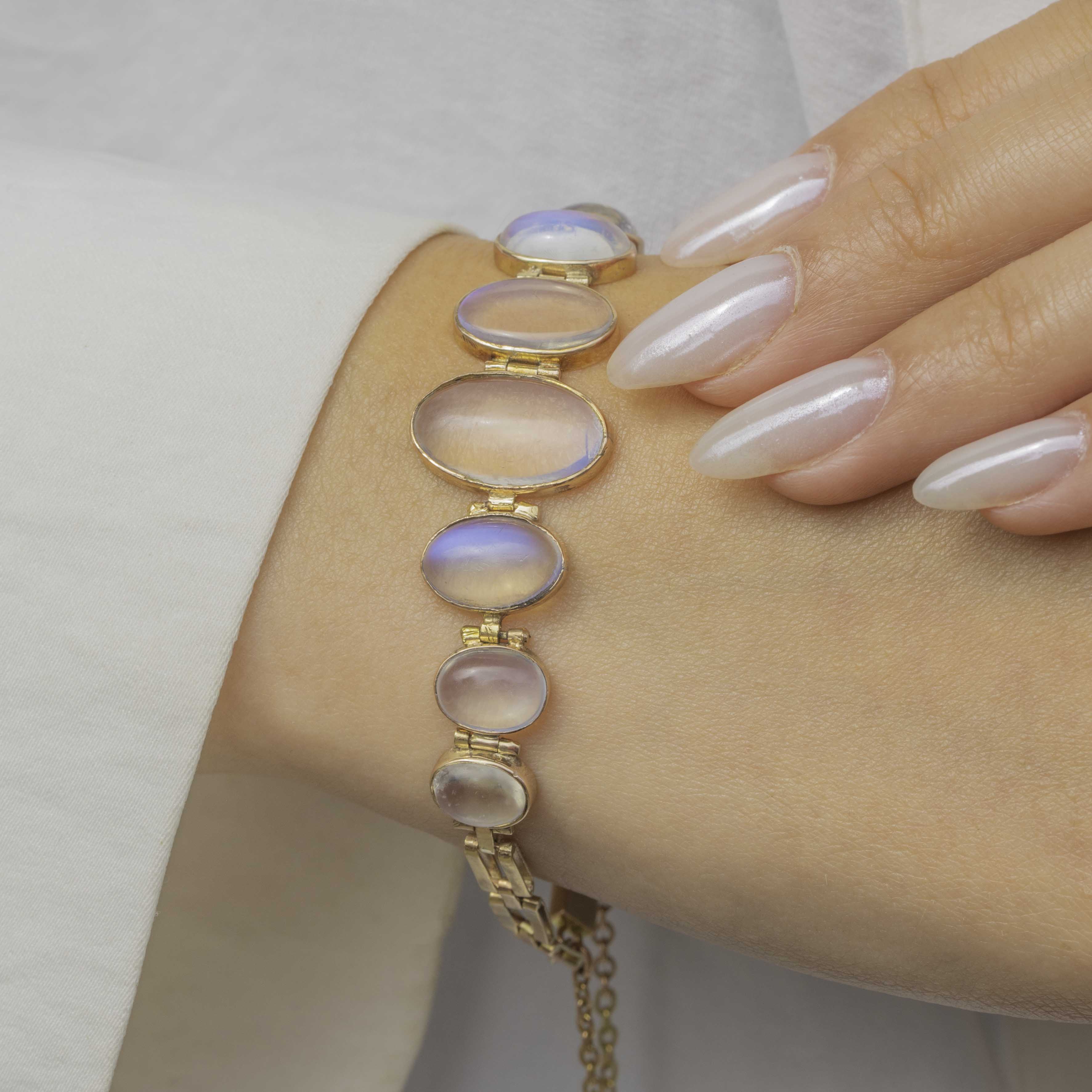 VERY GOOD-EXCELLENT: Each luminous Moonstone is secure within its settings, and the matching chain links are uniform and secure. There is surface wear present including some minor scratches and fleabites to the Moonstones, though this is to be expected with age. Complete with a safety chain for added security, this antique bracelet can be worn with utmost confidence.
