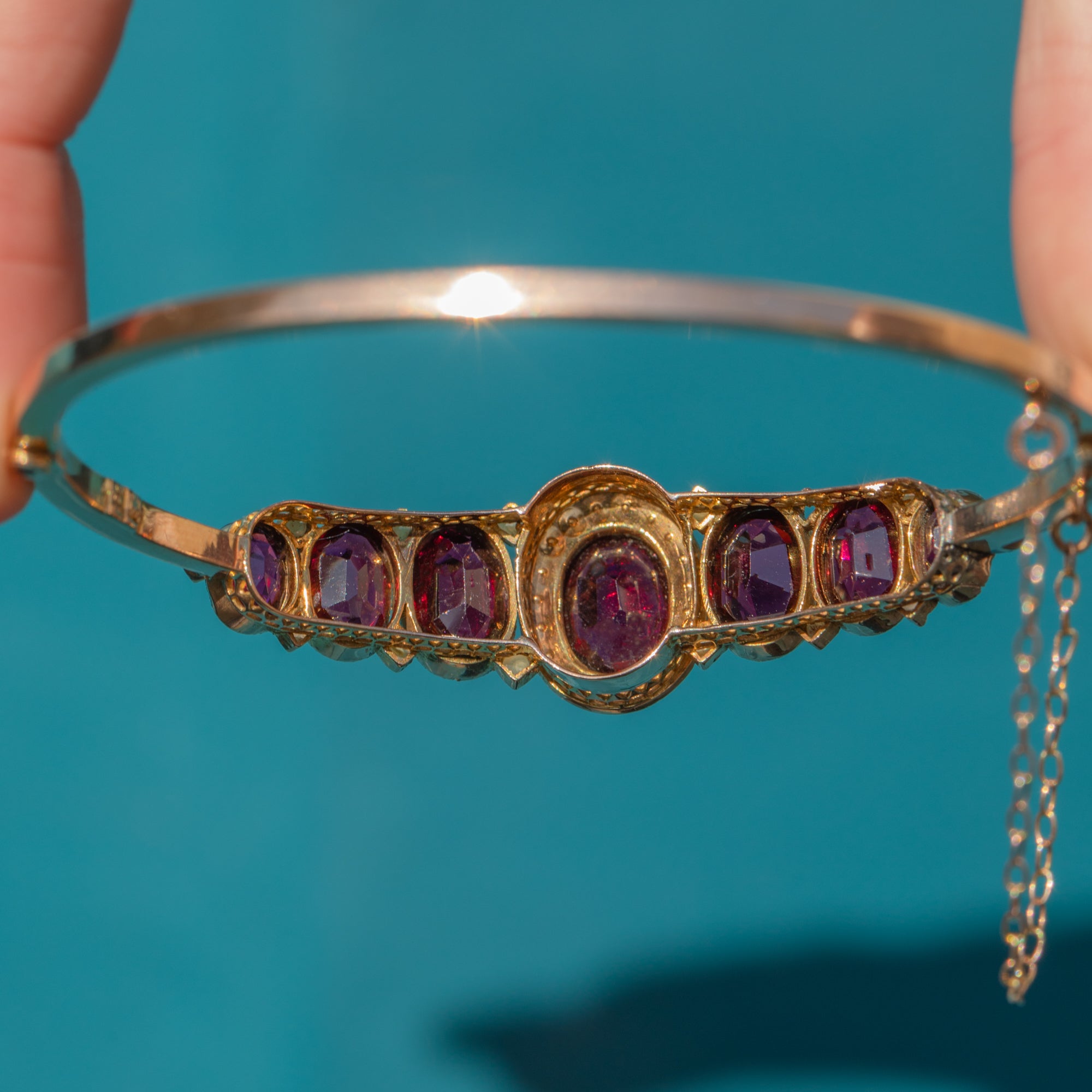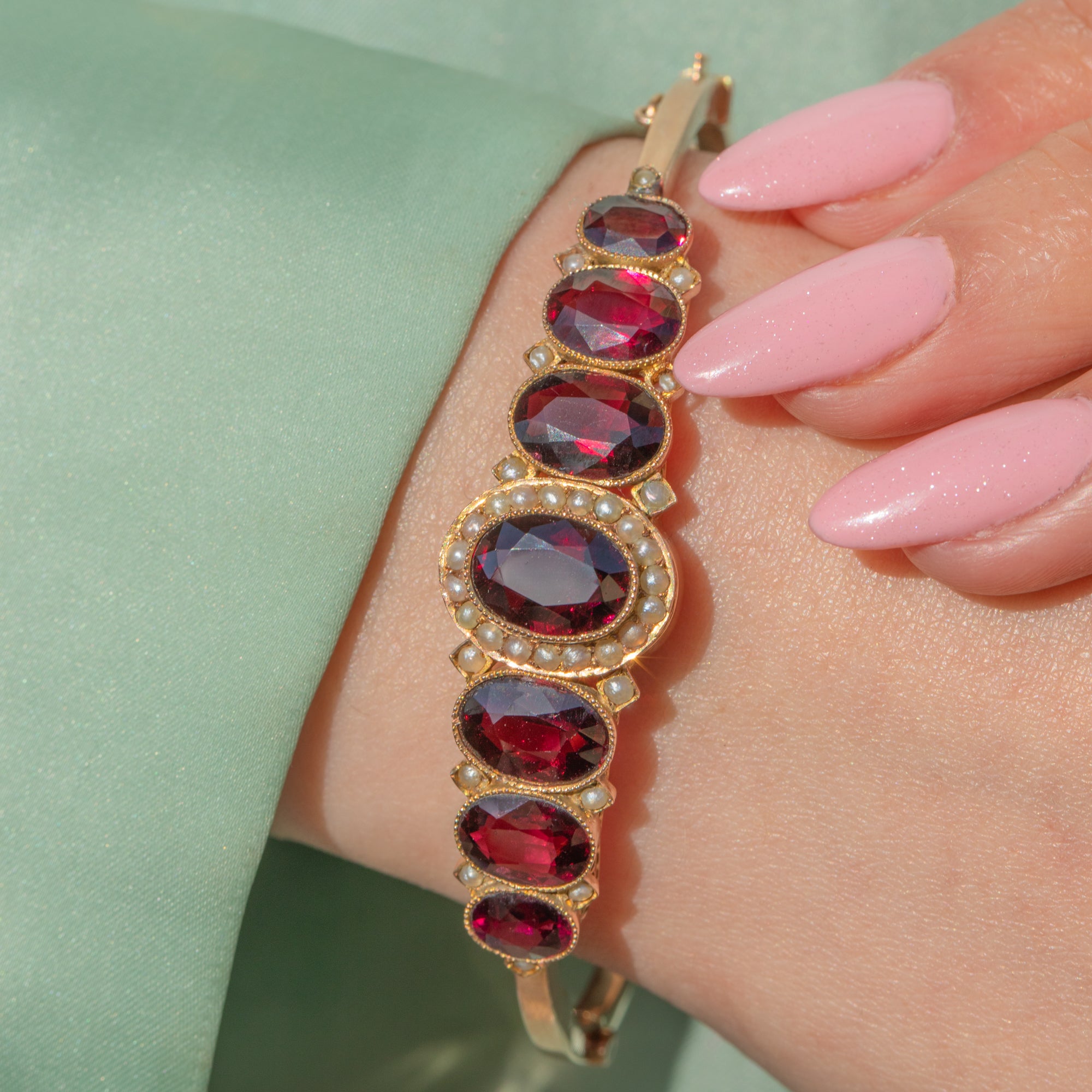 VERY GOOD: This antique 9ct Gold graduating Garnet and Pearl bangle is presented in very good condition. The Gold is bright and buttery and rhe Garnets are in wonderful condition, displaying a rich colour and vibrant sparkle. There is some light wear around the edges of the Garnets and the Gold, with a few minor cracks to the settings, though all stones remain secure. The Seed Pearls are all present with only some wear to their lustre, but they still retain a beautiful, subtle sheen. The bangle shuts securely and also includes a chic safety chain for reliable, secure wear. She is ready to be worn and enjoyed for years to come!
