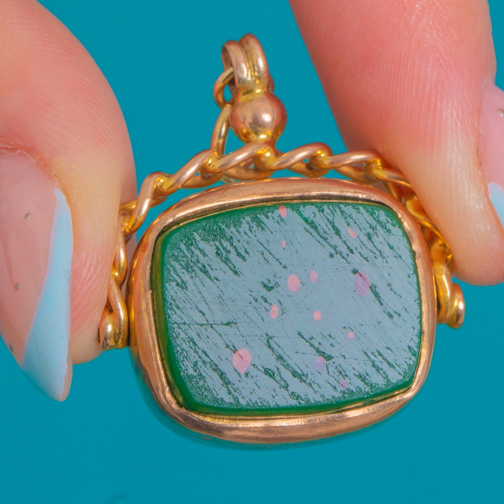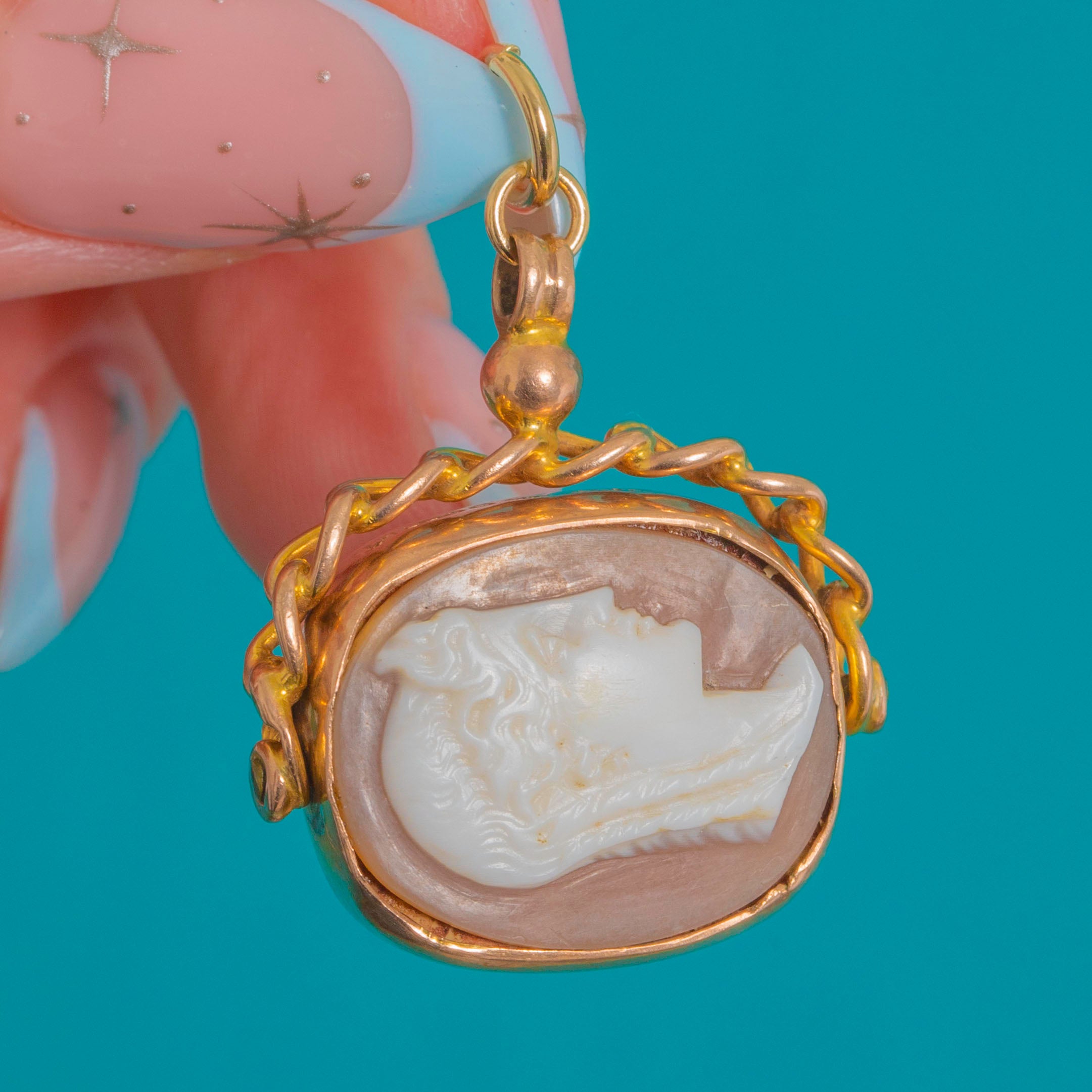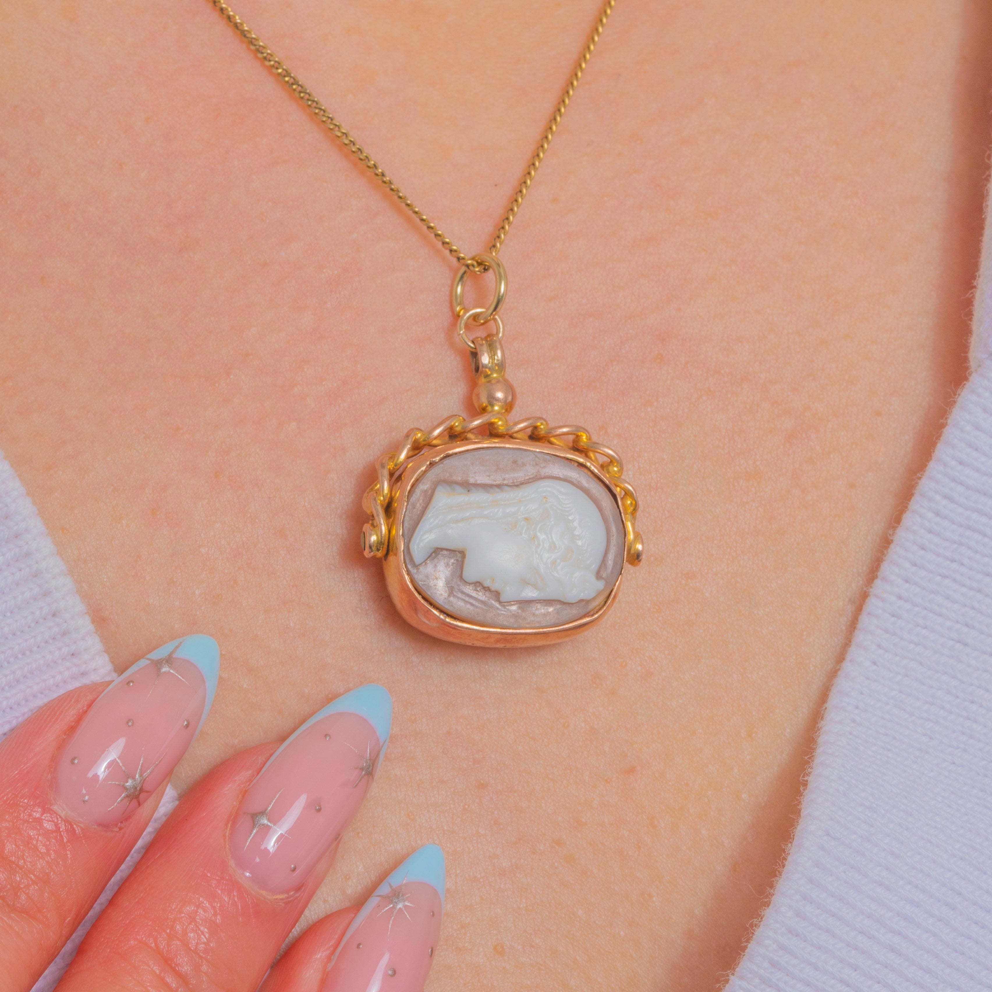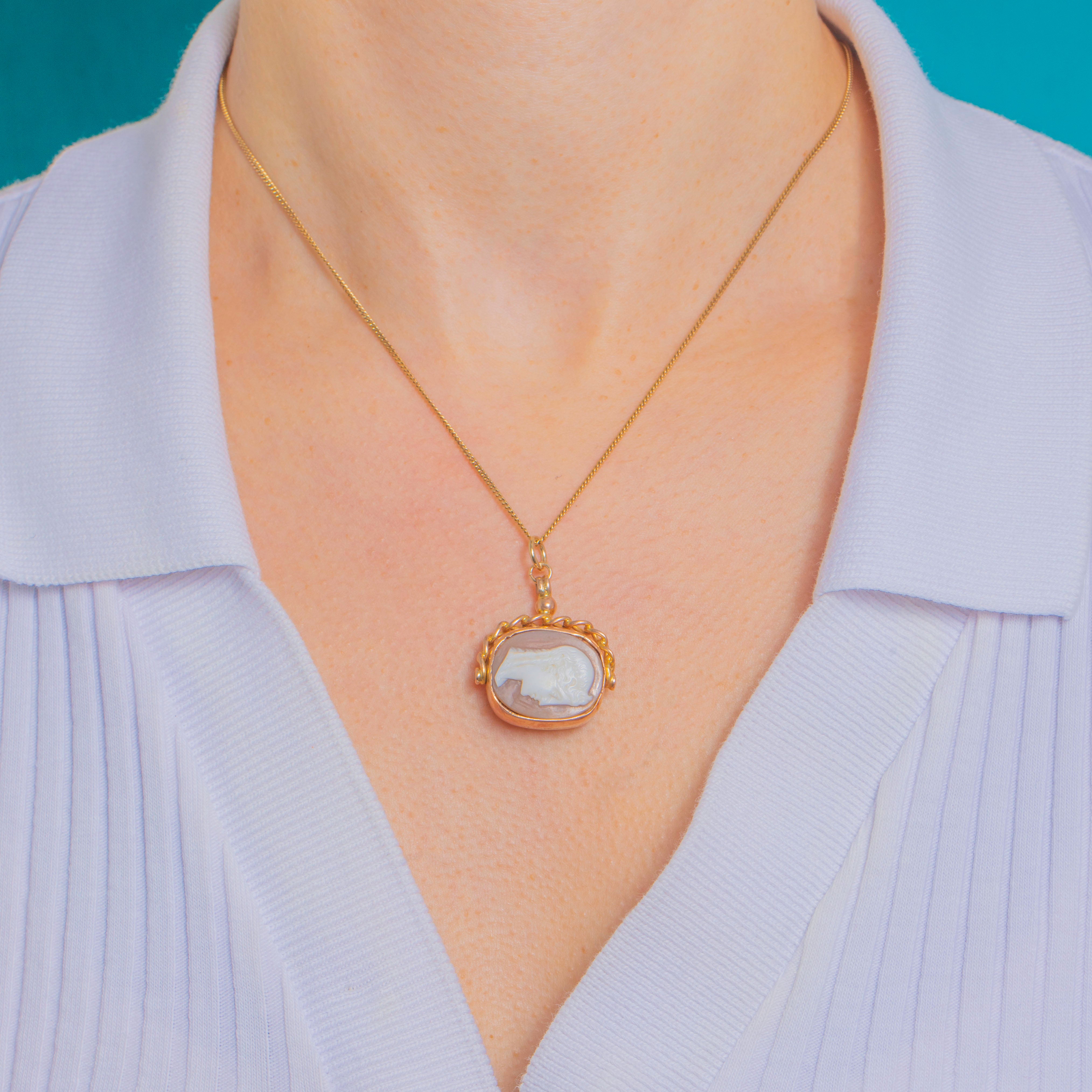 A refined antique swivel fob pendant in 9ct Gold, designed with a curb chain handle and domed knop. Double-sided for versatile styling, one face is a crisp Bull's Shell cameo portrait, the other a Bloodstone showing deep green tones flecked with red. Understated yet luxurious, the articulated swivel turns cleanly and offers that classic watch-fob silhouette.