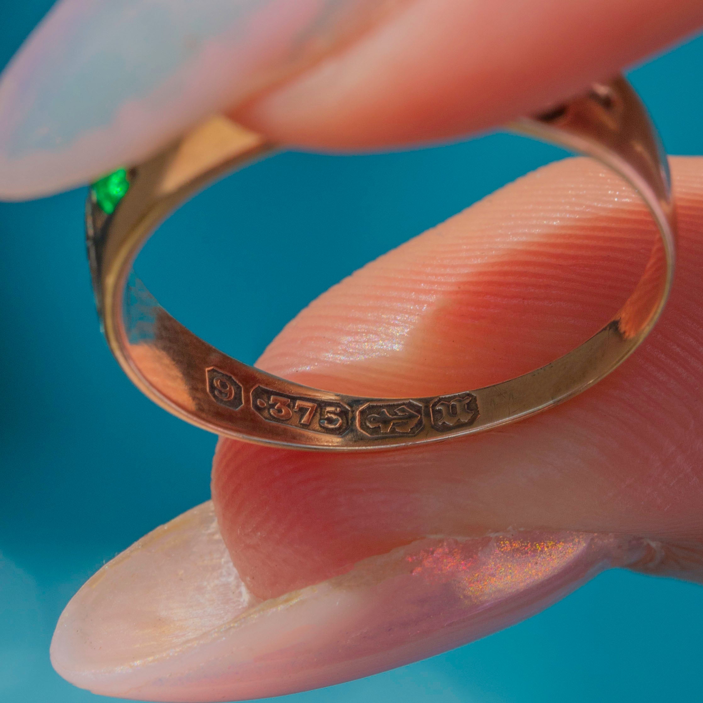 This gorgeous Victorian Gold gypsy ring, inlaid with a dainty Seed Pearl flanked by vibrant green Paste, will bring a fresh pop of colour to your curated ring stack!