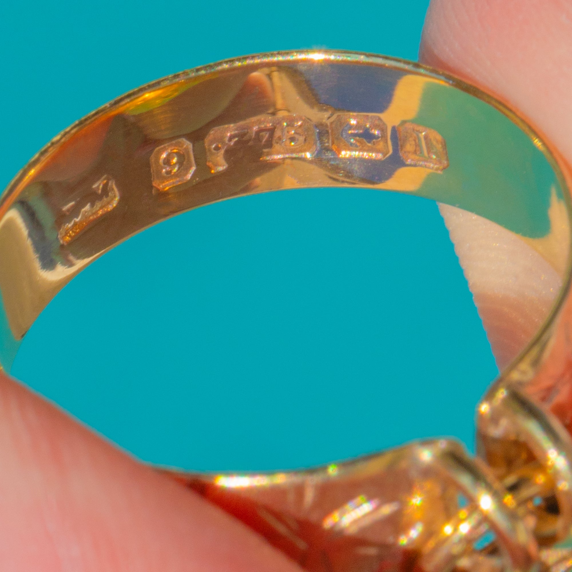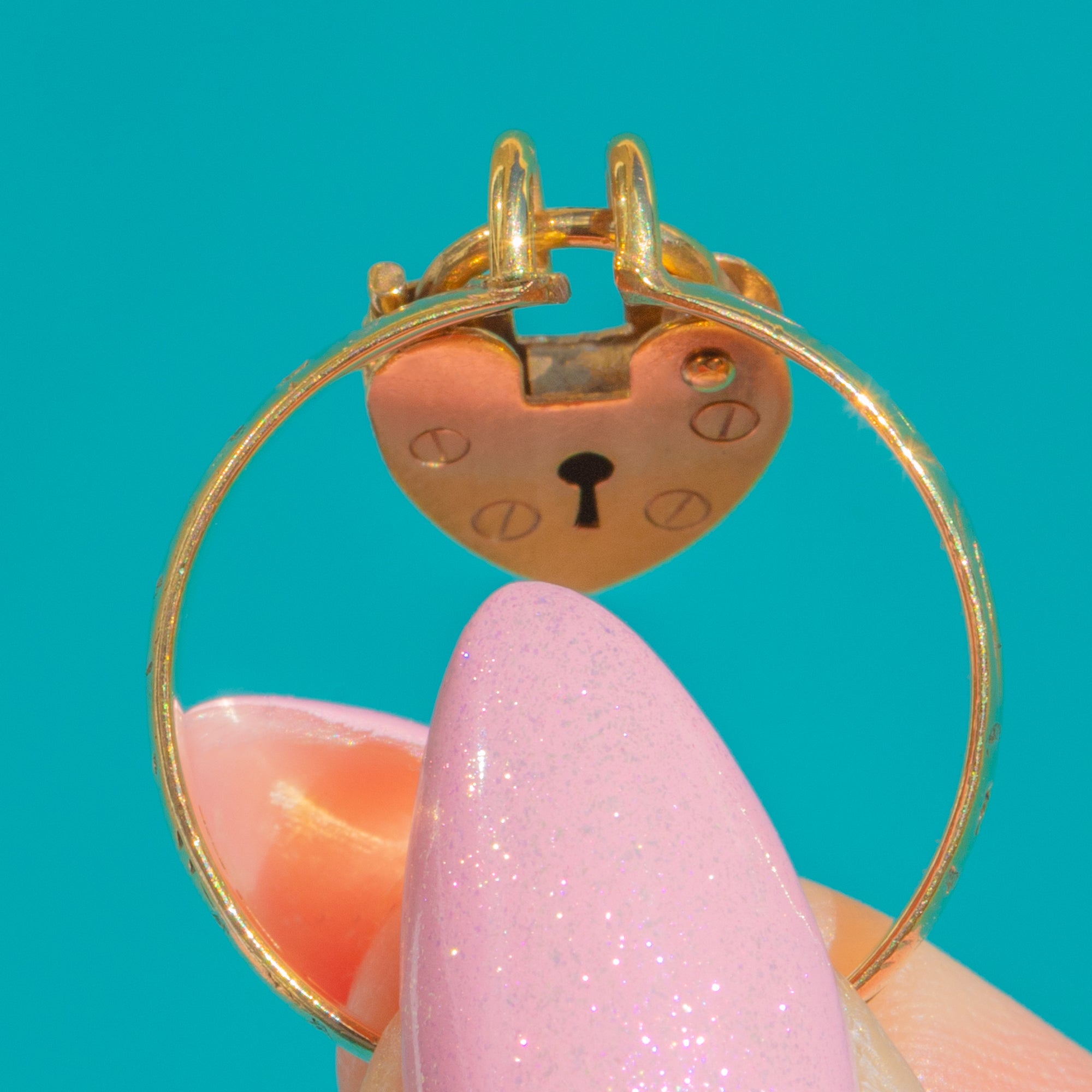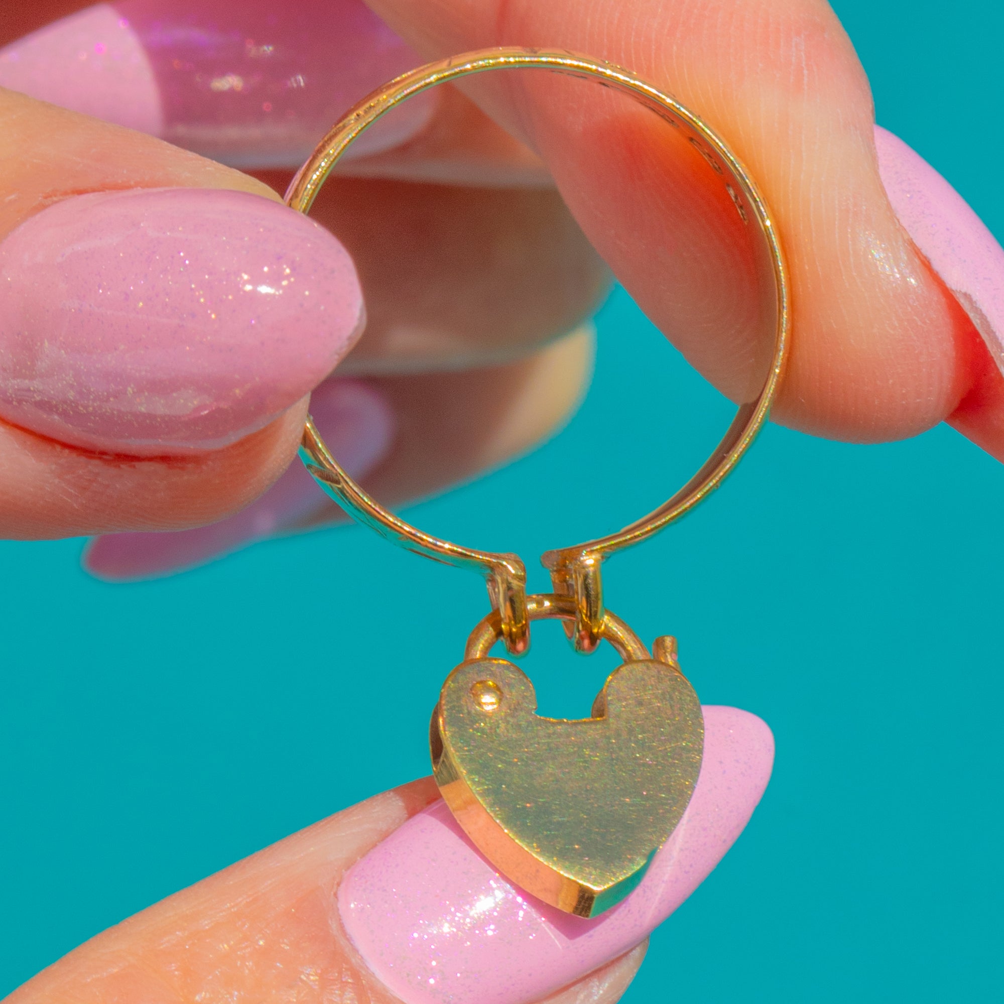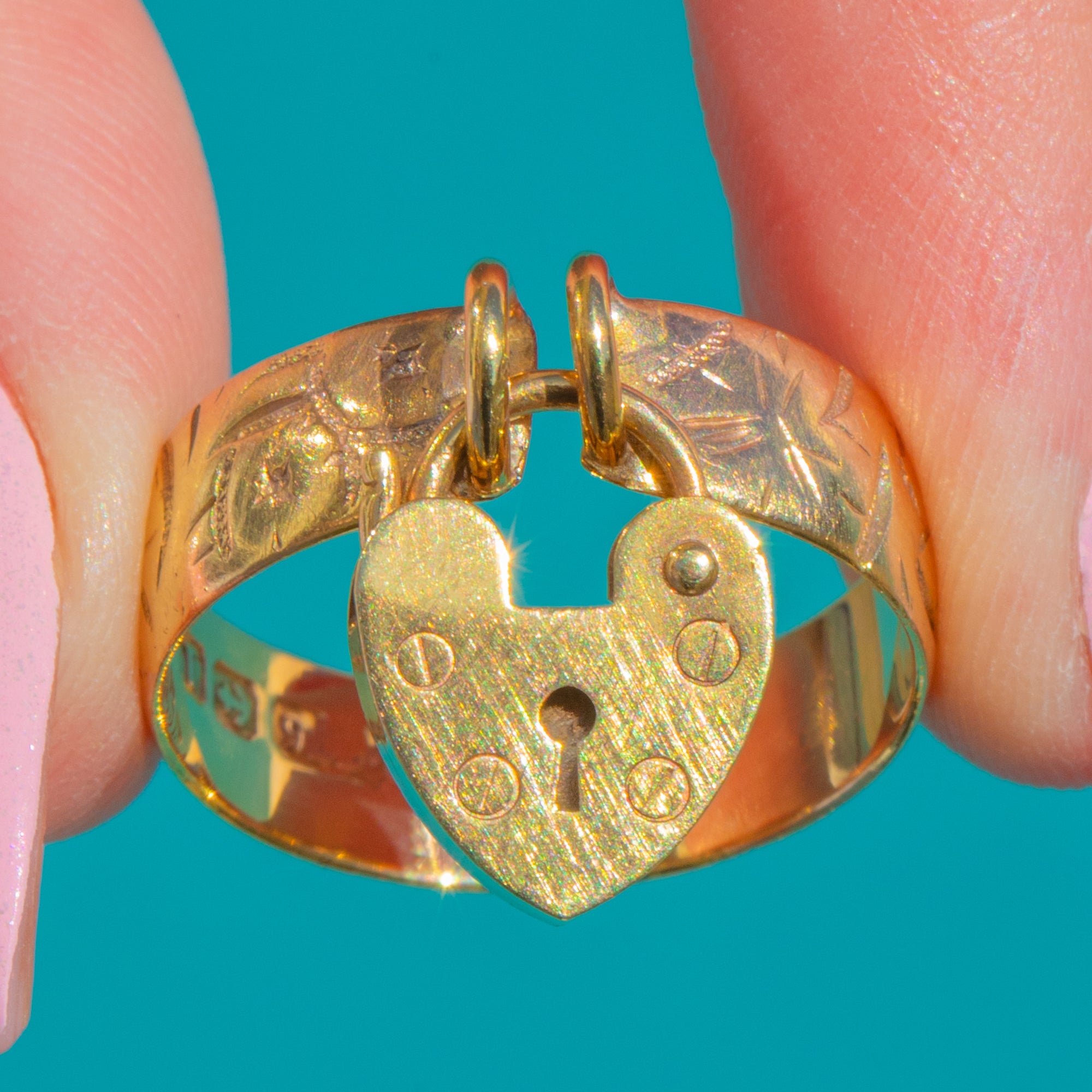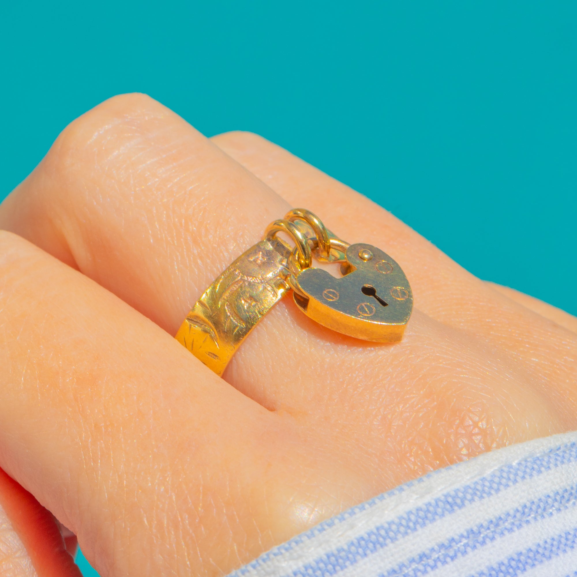 A romantic treasure in 9ct Gold, this charming ring pairs a finely chased band with a suspended heart padlock that dances with every movement. The band is richly engraved with foliate and tiny star motifs, their softened edges speaking to more than a century of love and wear, while the padlock is detailed with sweet dotted accents and a central keyhole for a touch of sentimentality.