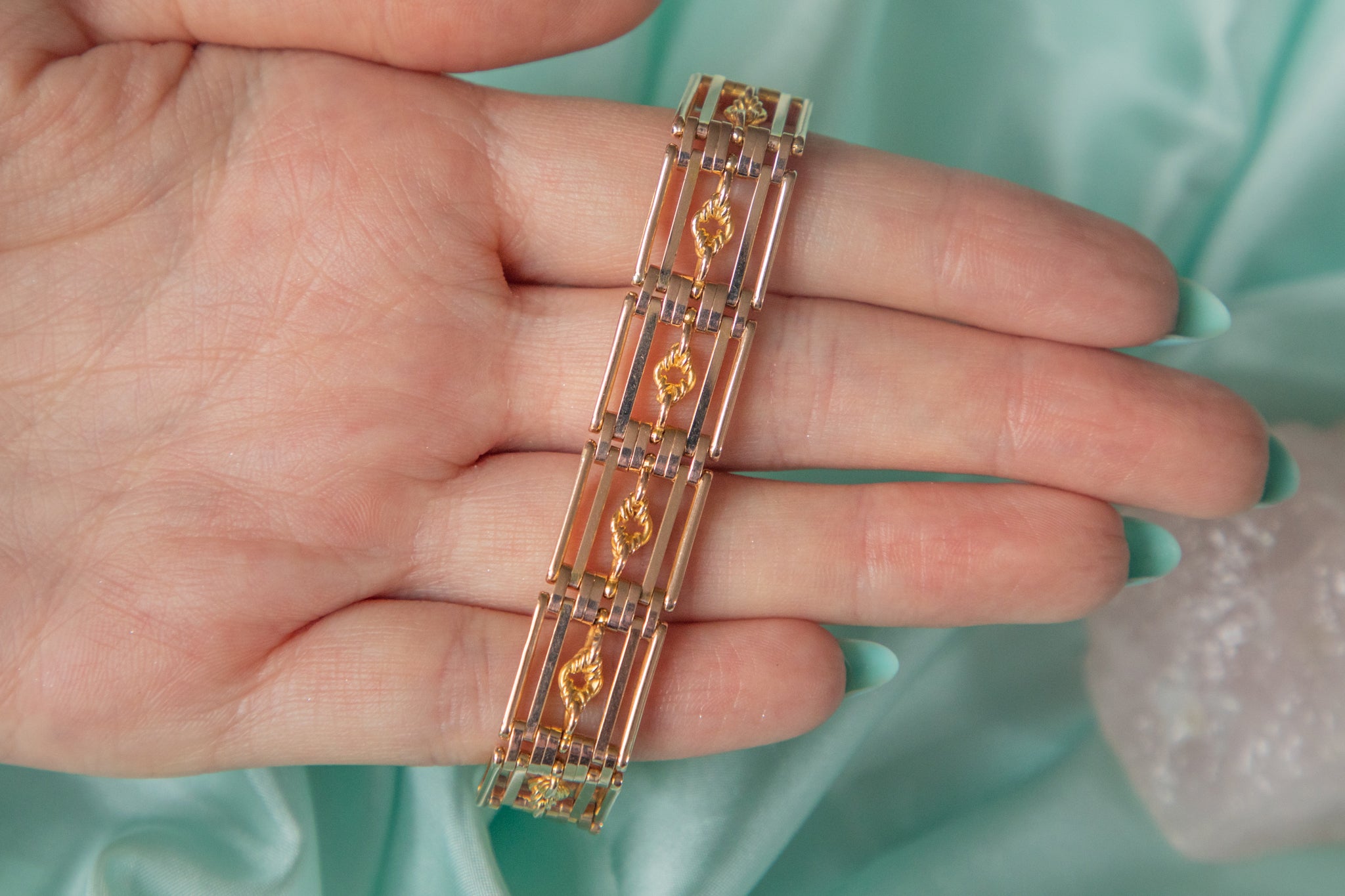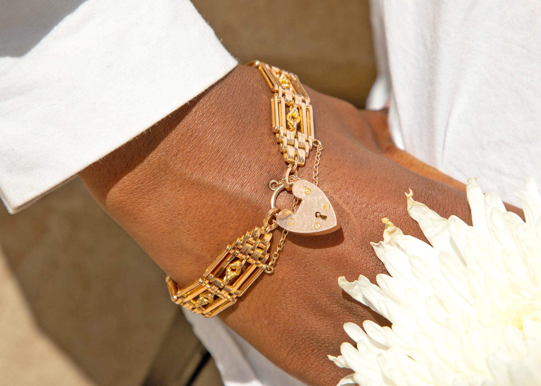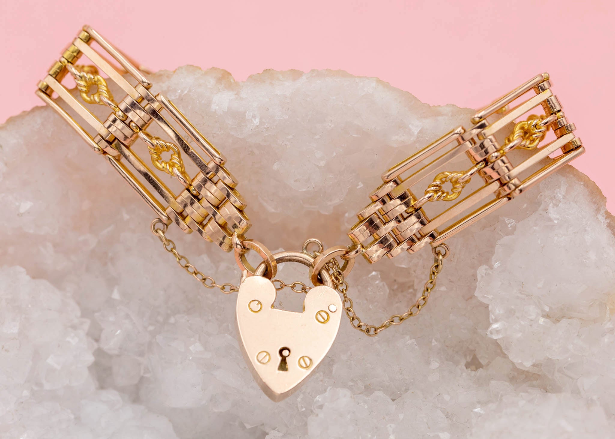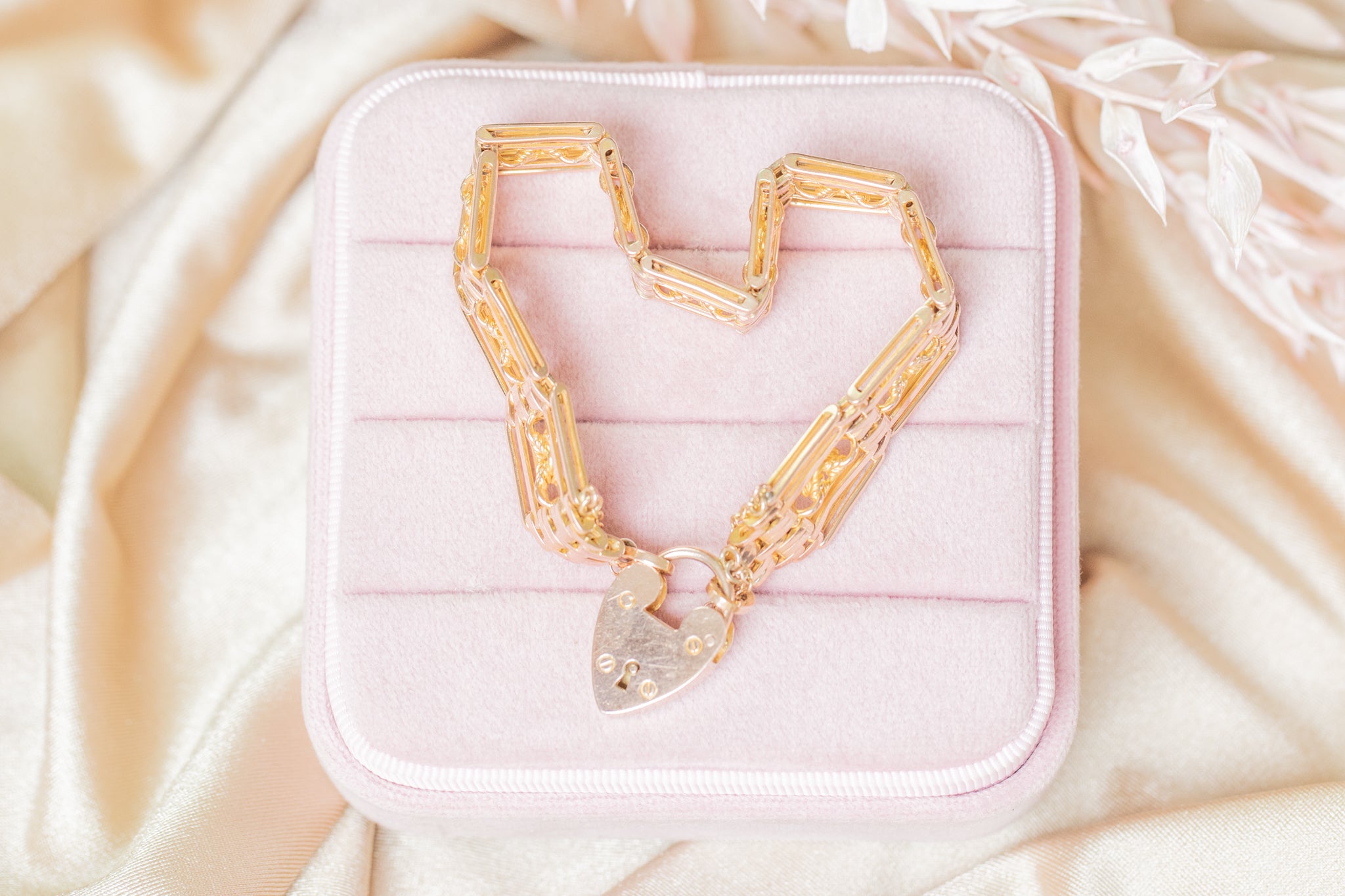 A splendid antique 9ct Gold lover's knot gate bracelet, complete with an adorable heart padlock charm. From her intricate lover's knot details to her sturdy gate links, she flaunts a subtle rosé hue which will marry perfectly with all your favourite clothes!