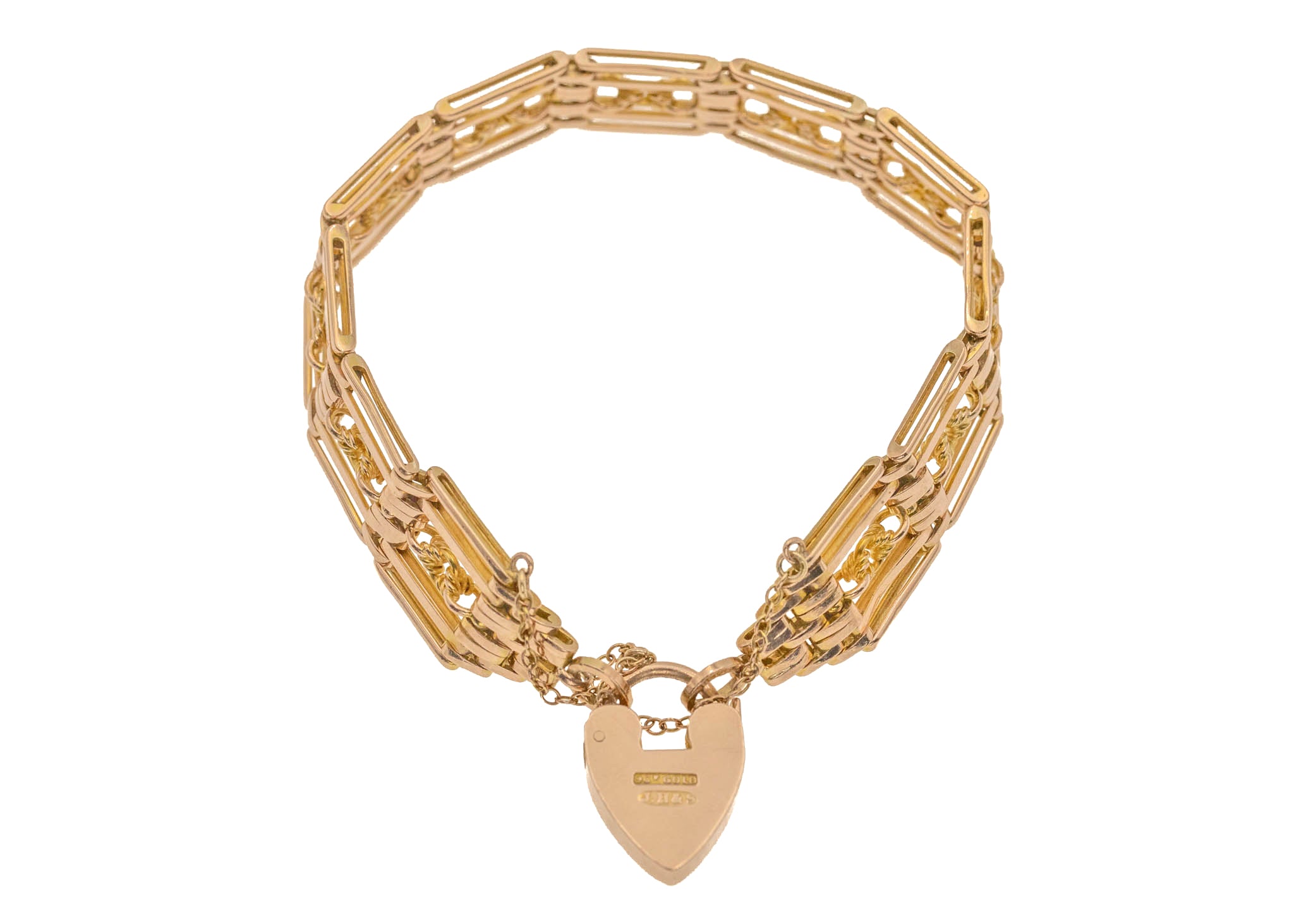 7" Antique 9ct Gold Lover's Knot Gate Bracelet with Heart Padlock, 26.4g