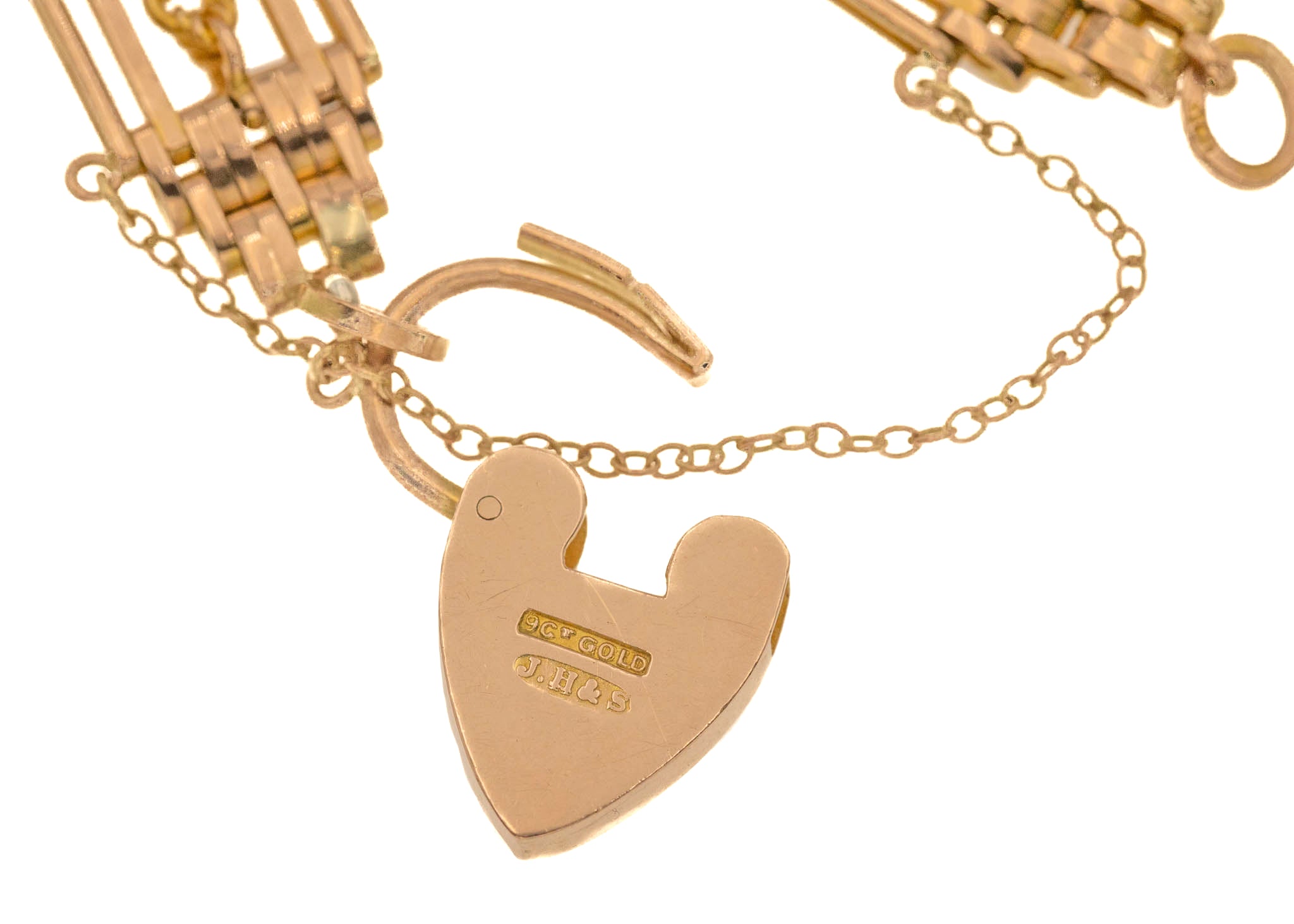 STAMPS & HALLMARKS: '9CT GOLD' , 'J.H&S' maker's mark on the padlock, '9CT' on the jump-ring by the padlock.
