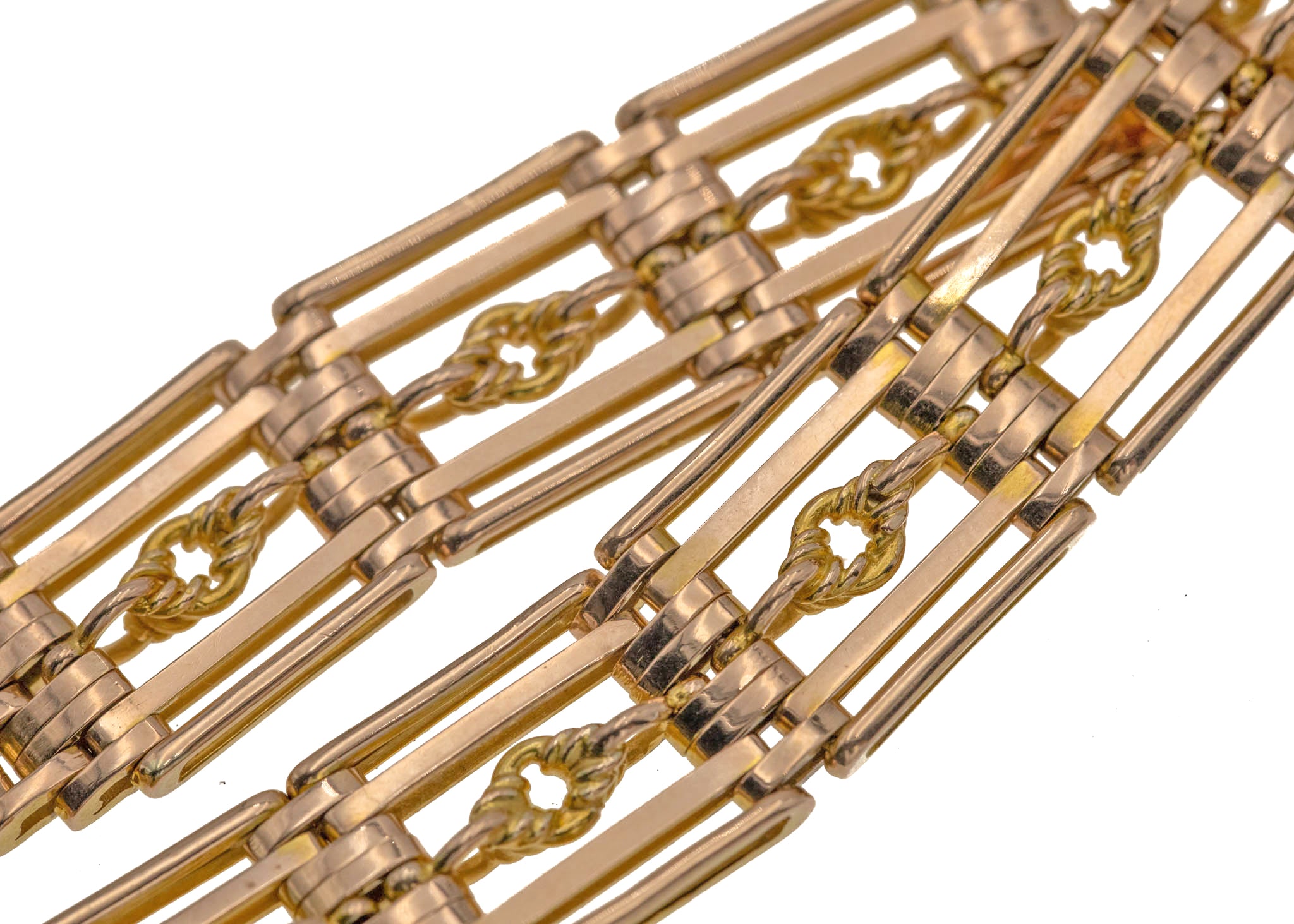 VERY GOOD-EXCELLENT. This antique 9ct Gold lover's knot gate bracelet is offered in fabulous condition. All of her links are securely connected and have kept their shape beautifully over the years. The Gold is bright and glossy throughout, and there is only the lightest signs of wear to the piece, commensurate with age. Her heart padlock is firmly affixed to the bracelet, and her hinge mechanism is in fine working order too.