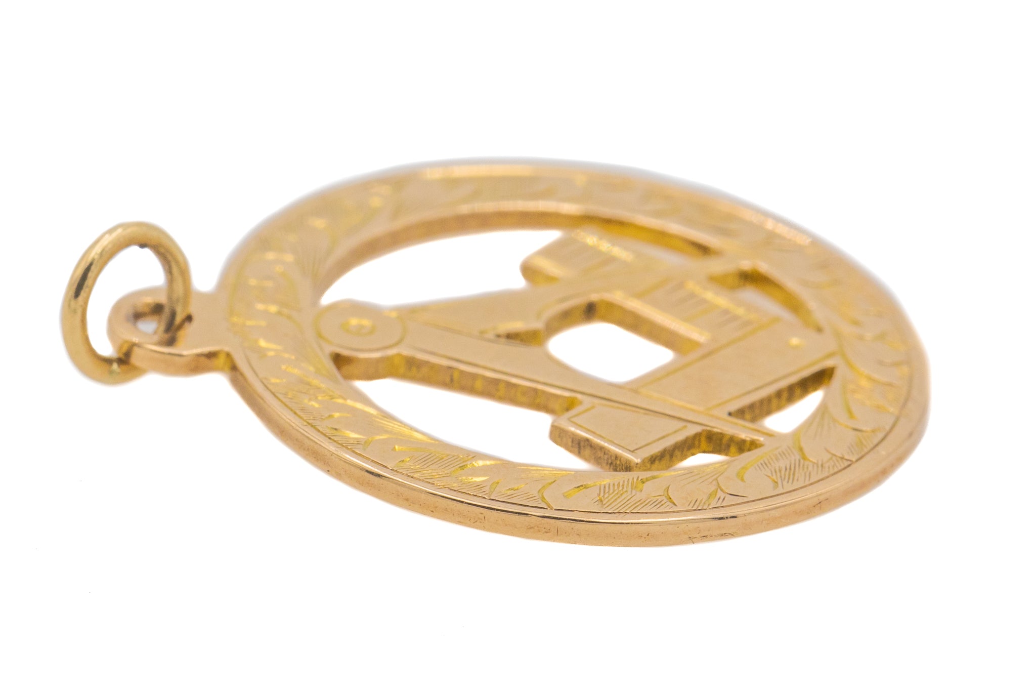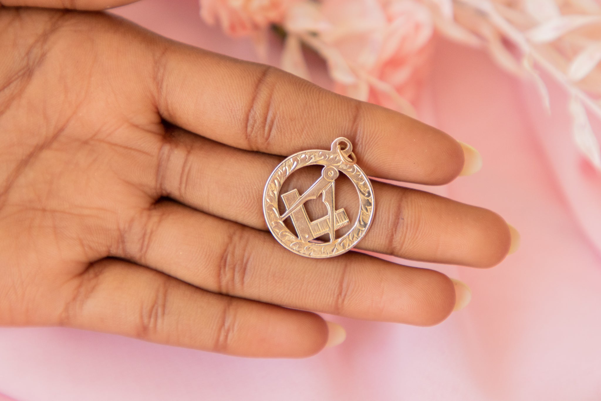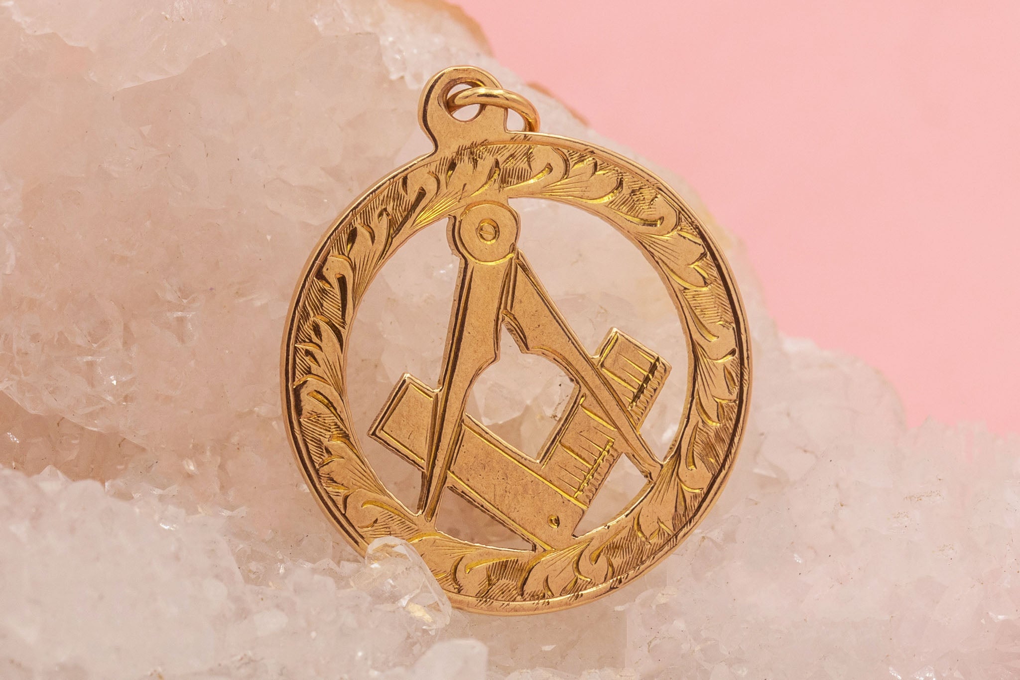 VERY GOOD. This antique 9ct Gold masonic compass pendant is in very good condition. The hallmarks are crisp and the front of the piece has been beautifully engraved. There is very minimal wear to the piece overall, and she can be worn with a Gold chain with ease!
