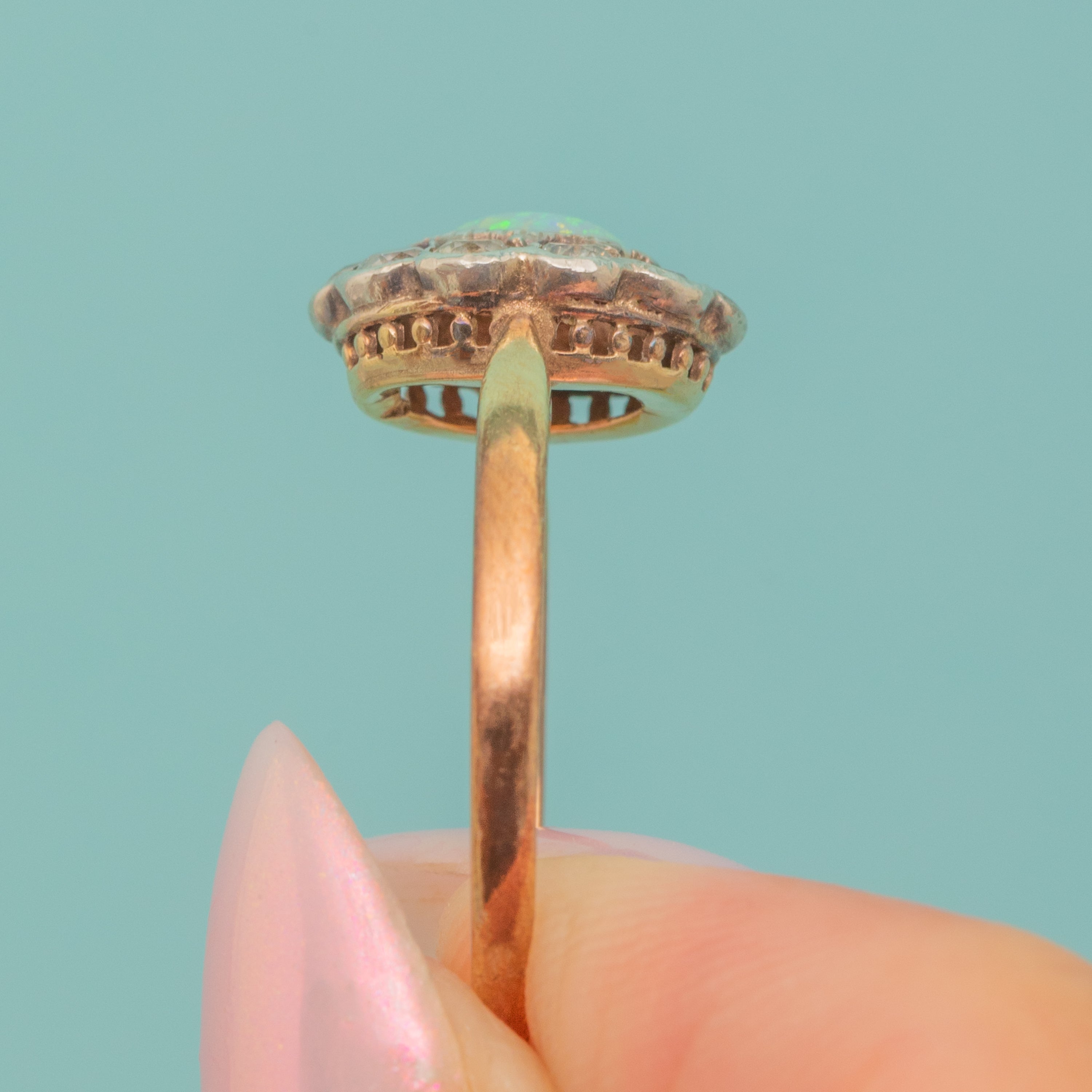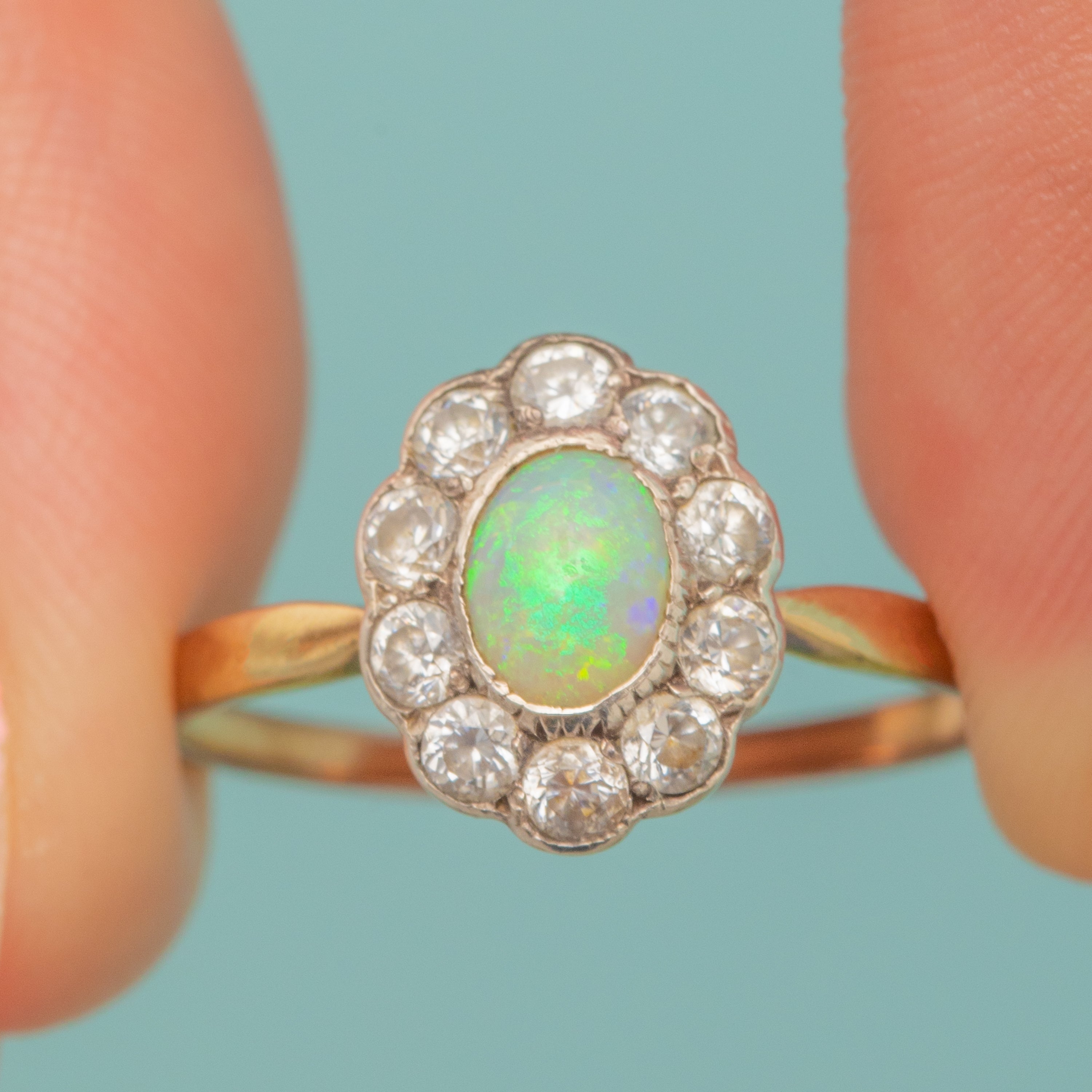 VERY GOOD: This antique 9ct Gold Opal & Paste cluster ring is in very good condition throughout. The Opal itself is free from chips or nibbles, and while there is a little wear to the setting, she is set securely. There is also some discolouration and a resize mark to the ring band, which has accrued a satisfying rosy colour over time. She is a delightful little piece that will be worn and enjoyed for years to come!