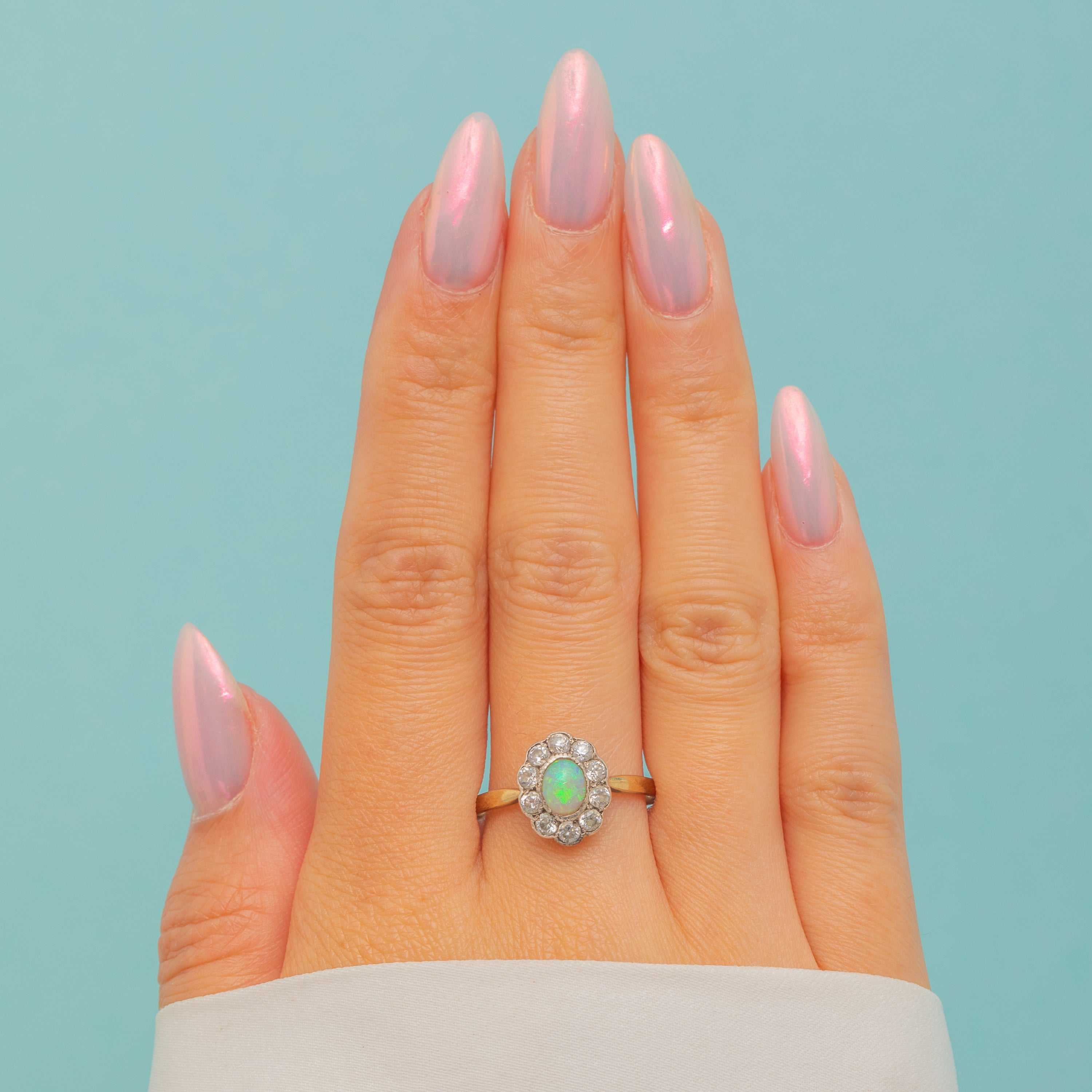 Her iridescent pastel Opal flaunts flashes of neon green and yellow, crowned by glittering Diamond Paste gemstones- what a gorgeous combination!