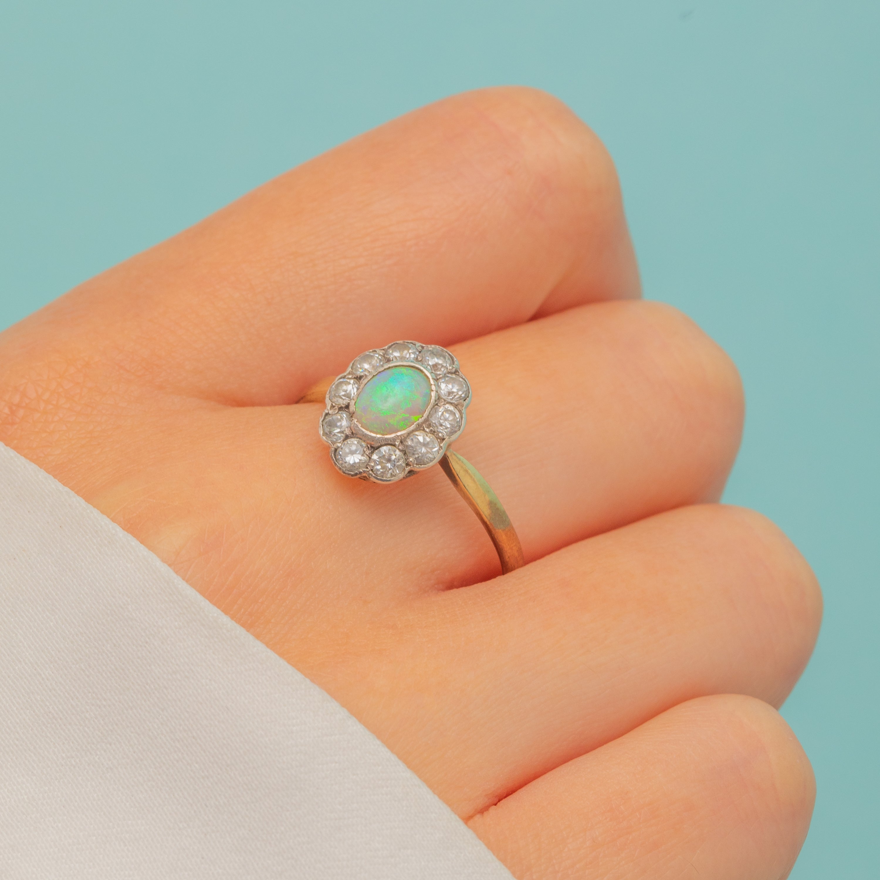 This antique 9ct Gold Opal & Paste cluster ring is simply superb! Inlaid with a natural Opal with a halo of bright white Paste gems, this antique ring will make a gorgeous addition to your collection, just imagine her with a coupé of champagne accompanying your favourite dress!