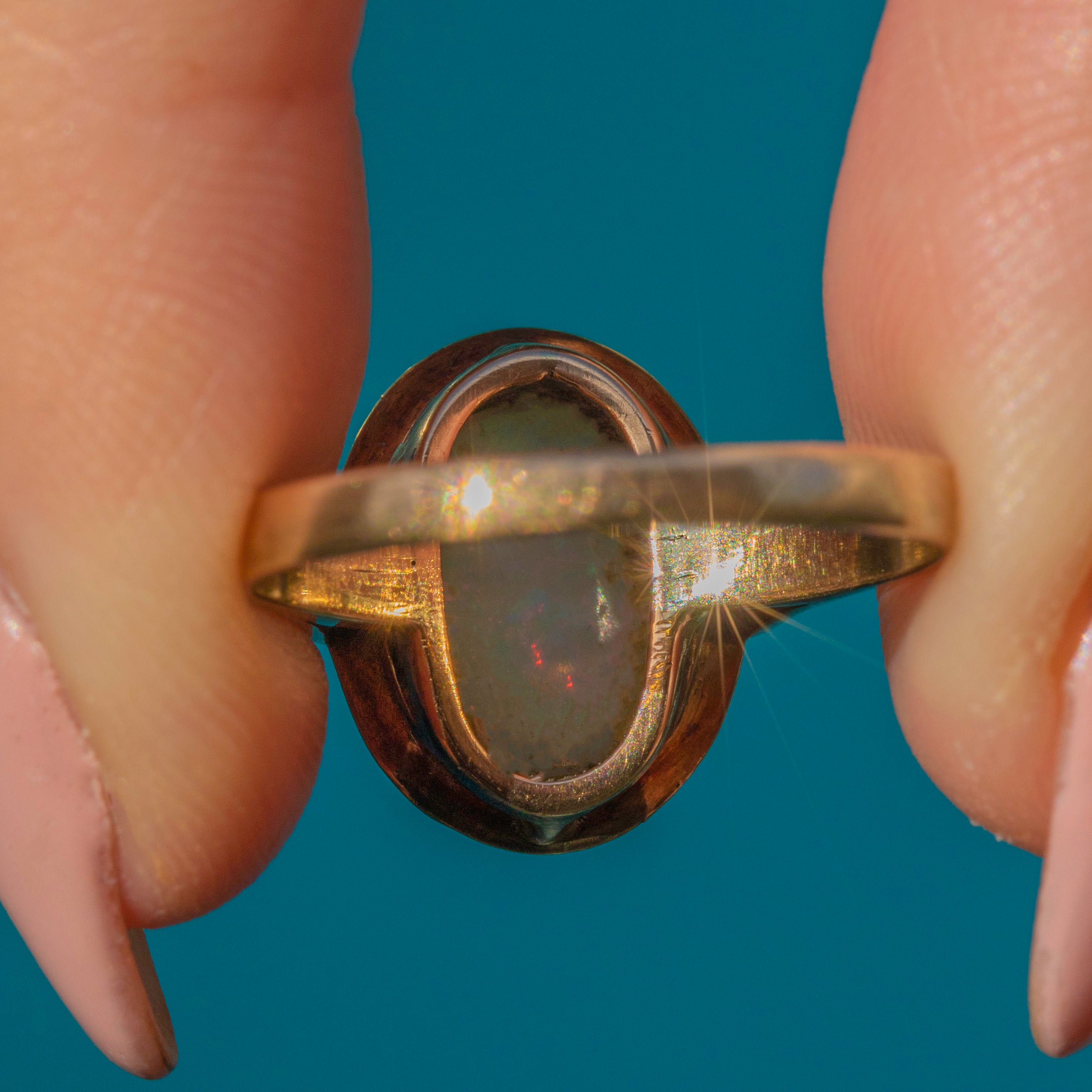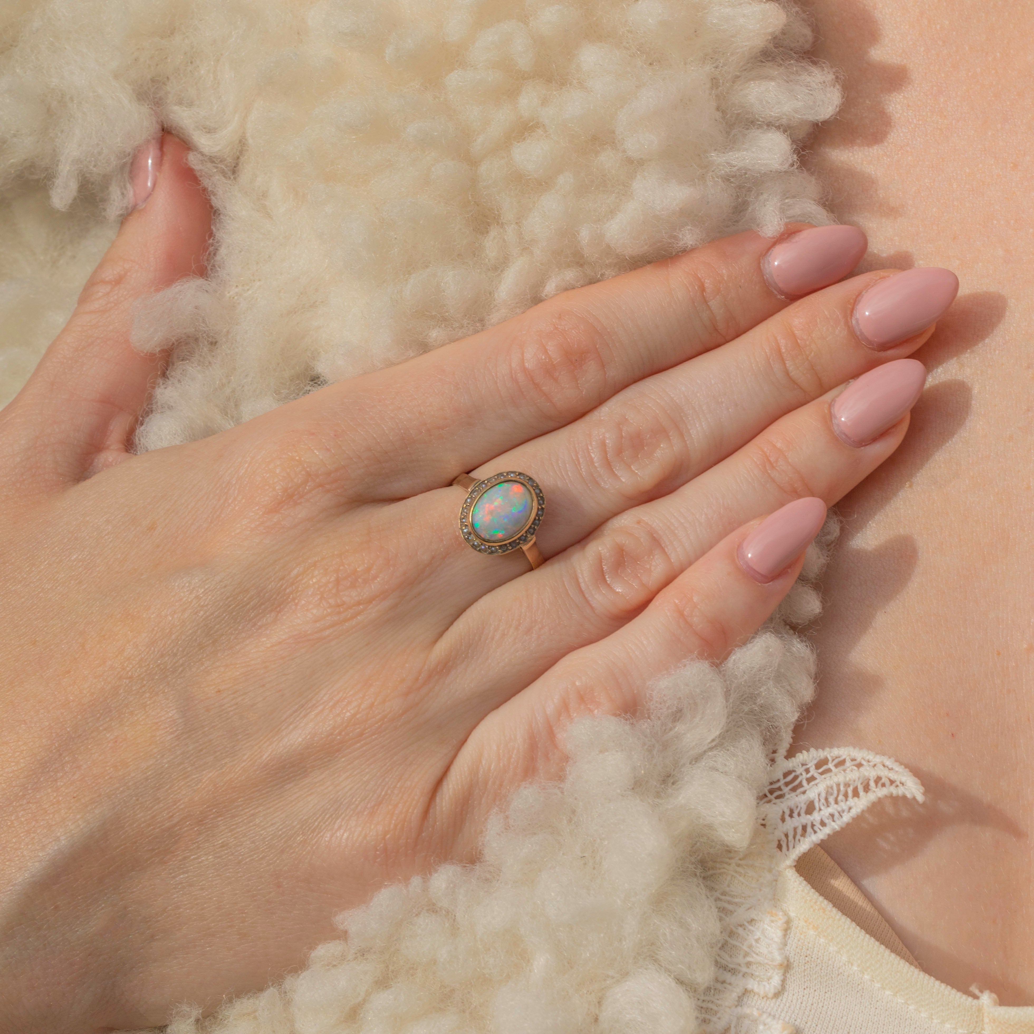 This Gold cluster ring provides a bold statement with her Opal encased in a chunky bezel setting, crafted from solid 9ct Gold along with her ring shank too. With Opals said to bring hope, this Opal Pearl ring will bring good fortune to your jewellery box.