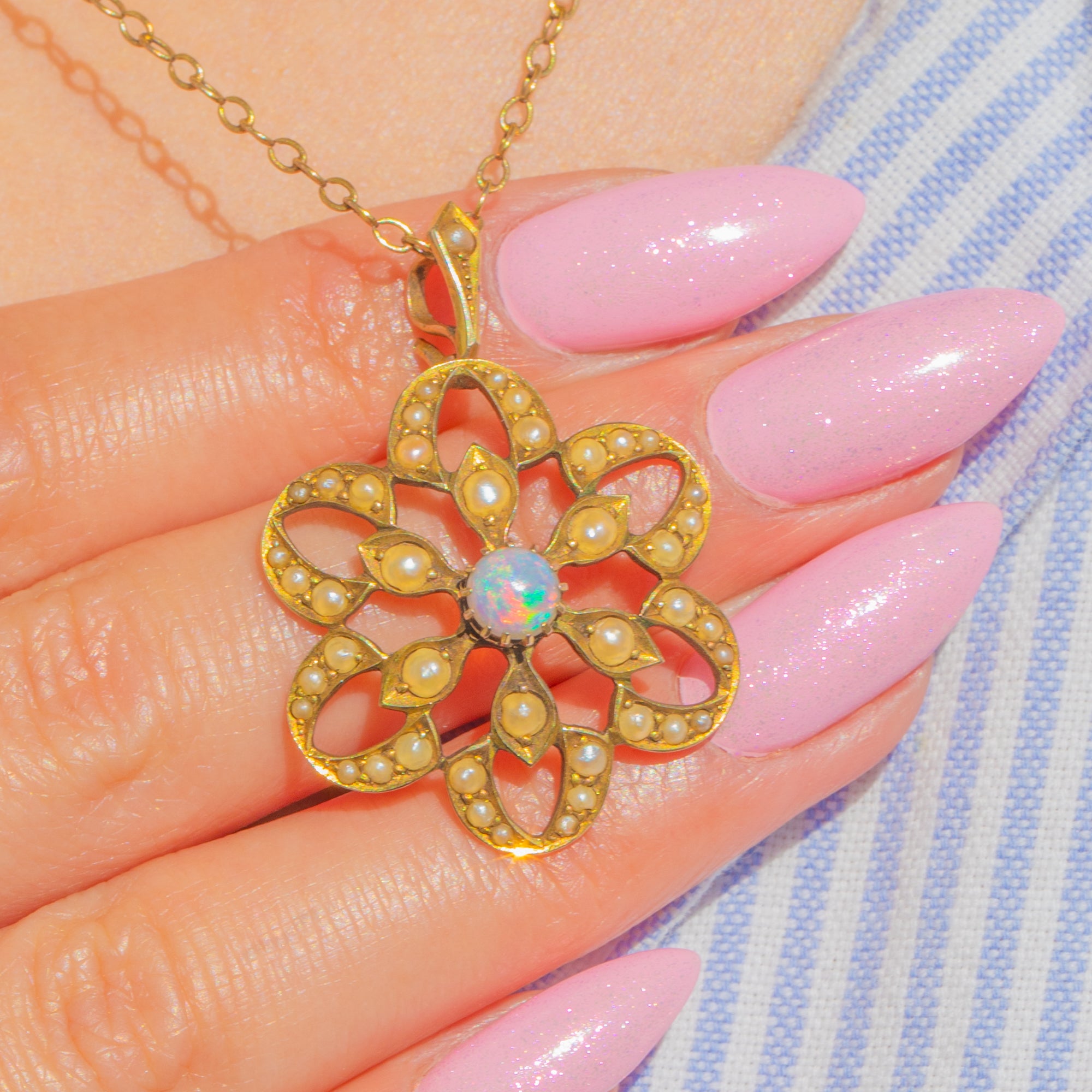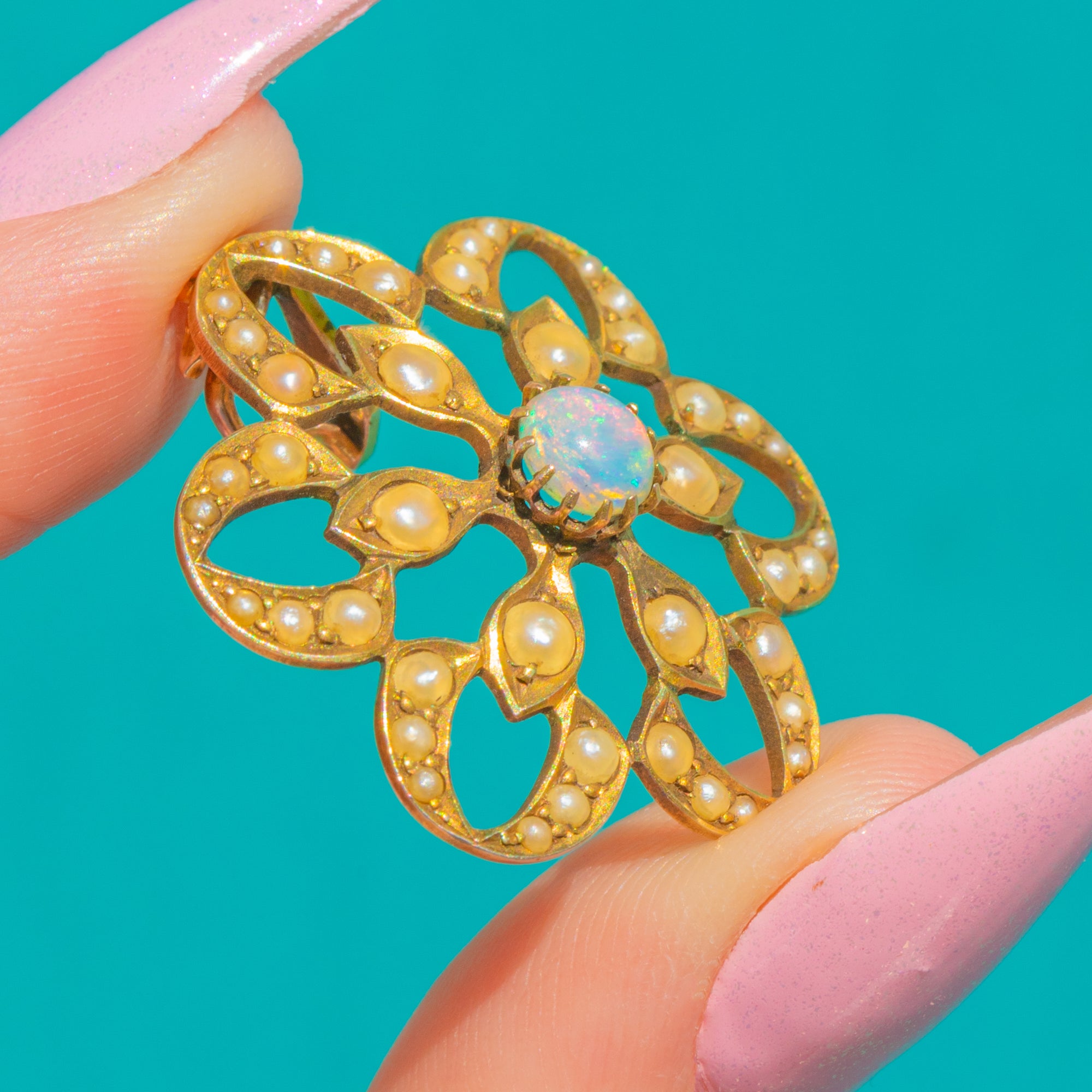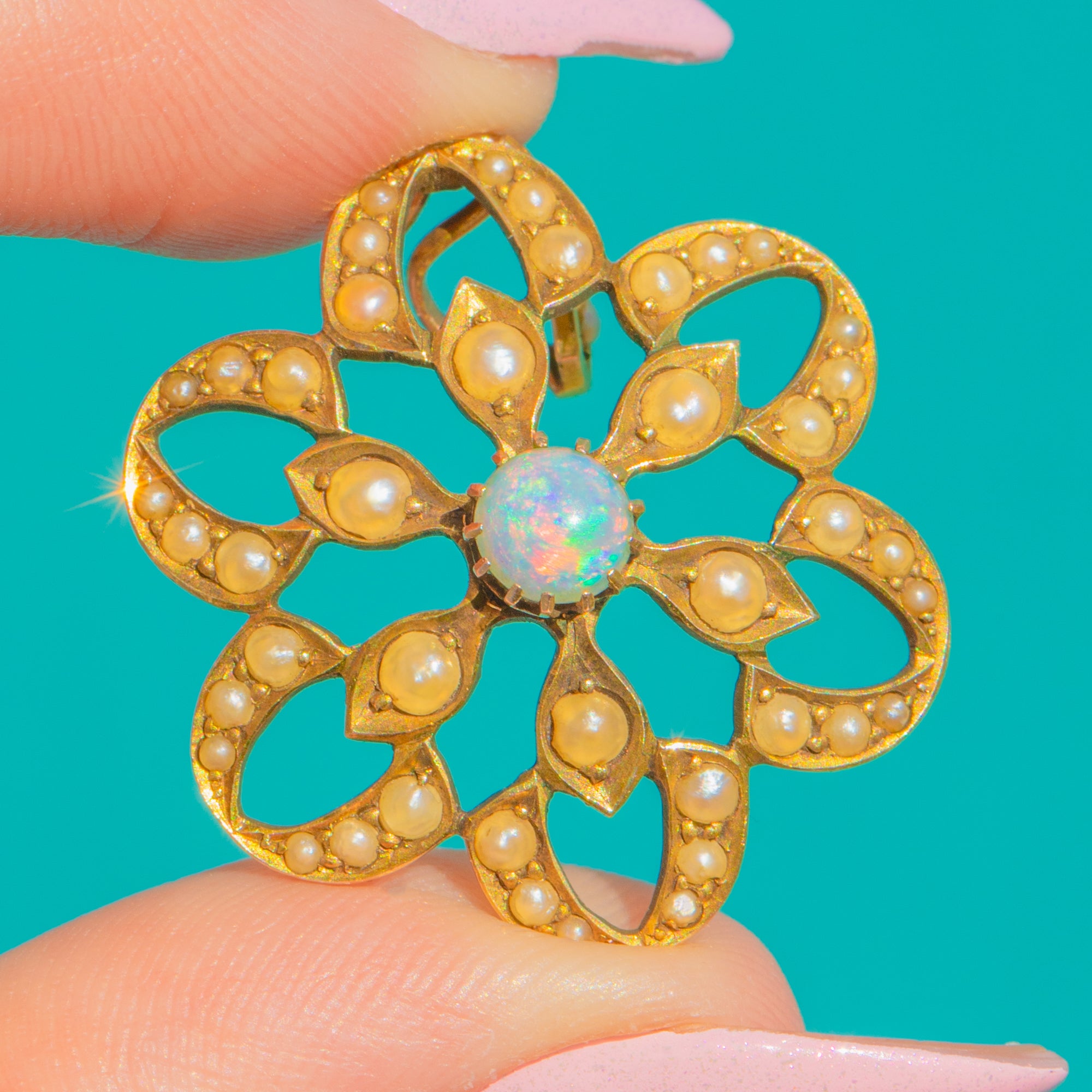 A romantic flourish from the Edwardian era, this 9ct Gold flower pendant celebrates delicacy and detail. At its heart sits a luminous 5mm round cabochon Opal, shimmering with ethereal flashes of pink, blue and green. Petal-like openwork unfurls around the centre in a lace-like rosette, edged with fine beading and framed by a halo of creamy Seed Pearls for a soft, glowing finish.