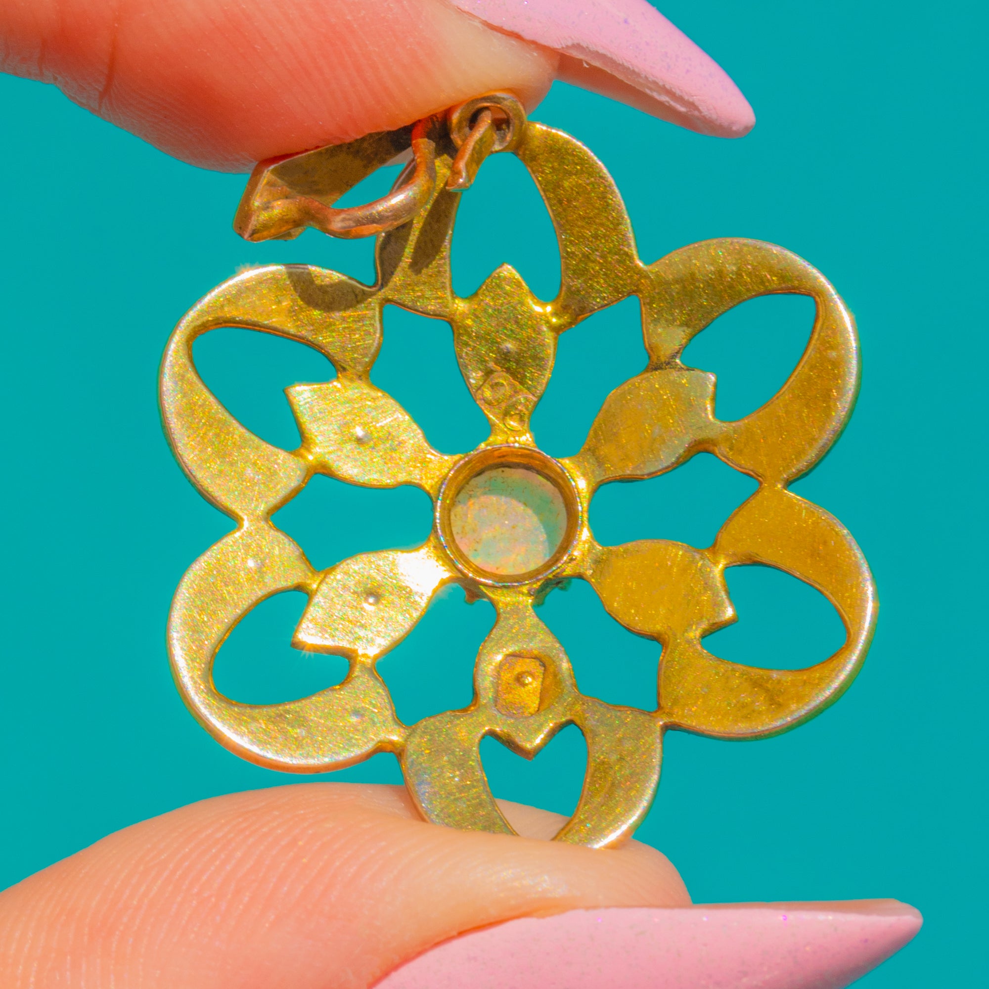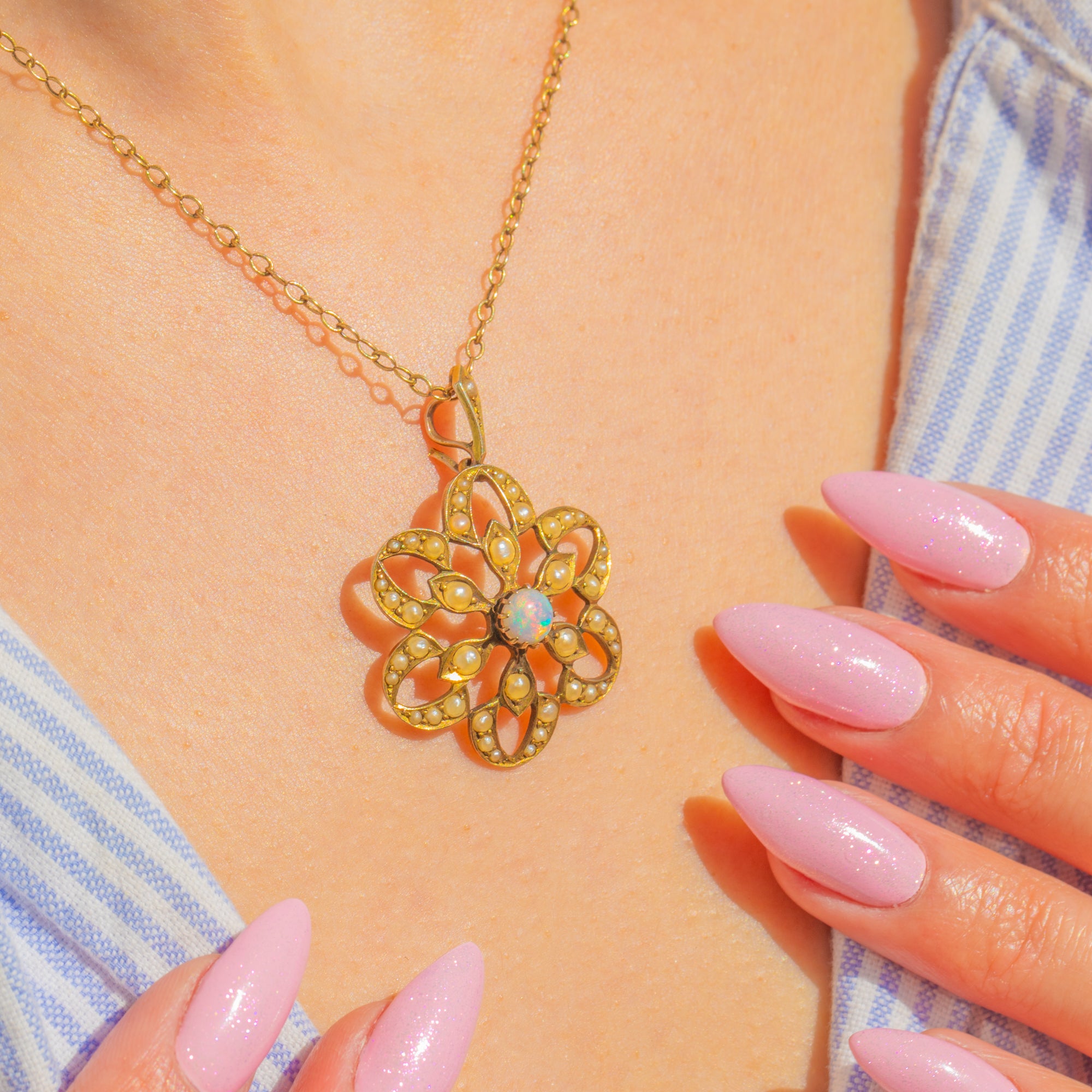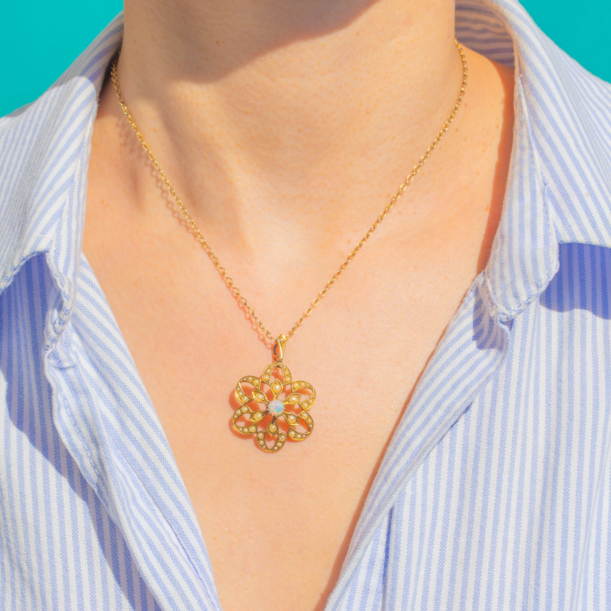 A romantic flourish from the Edwardian era, this 9ct Gold flower pendant celebrates delicacy and detail. At its heart sits a luminous 5mm round cabochon Opal, shimmering with ethereal flashes of pink, blue and green. Petal-like openwork unfurls around the centre in a lace-like rosette, edged with fine beading and framed by a halo of creamy Seed Pearls for a soft, glowing finish.