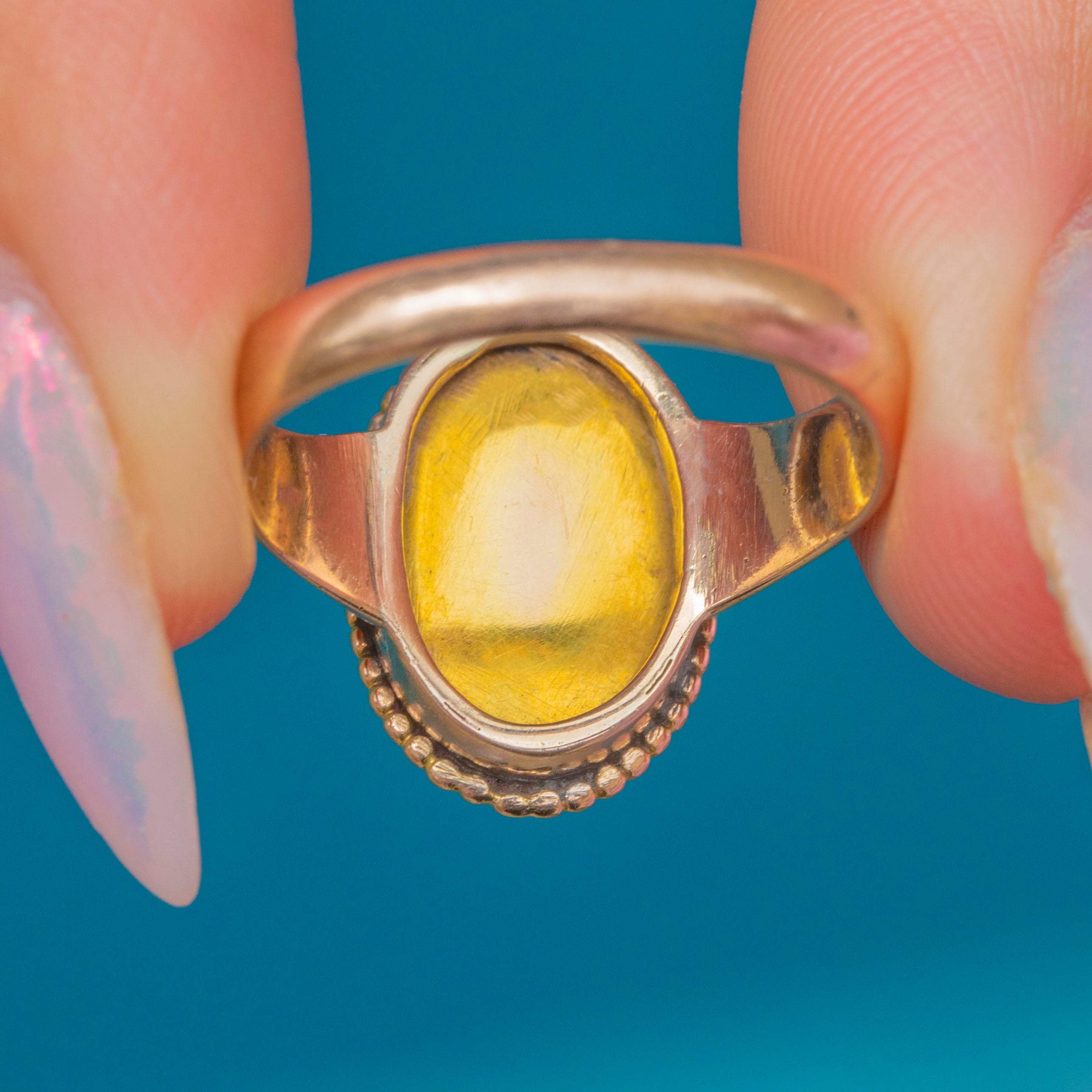 The chunky, glossy 9ct Gold mount provides exceptional finger coverage as well as being very comfortable to wear, and we love the textured oval bezel!
