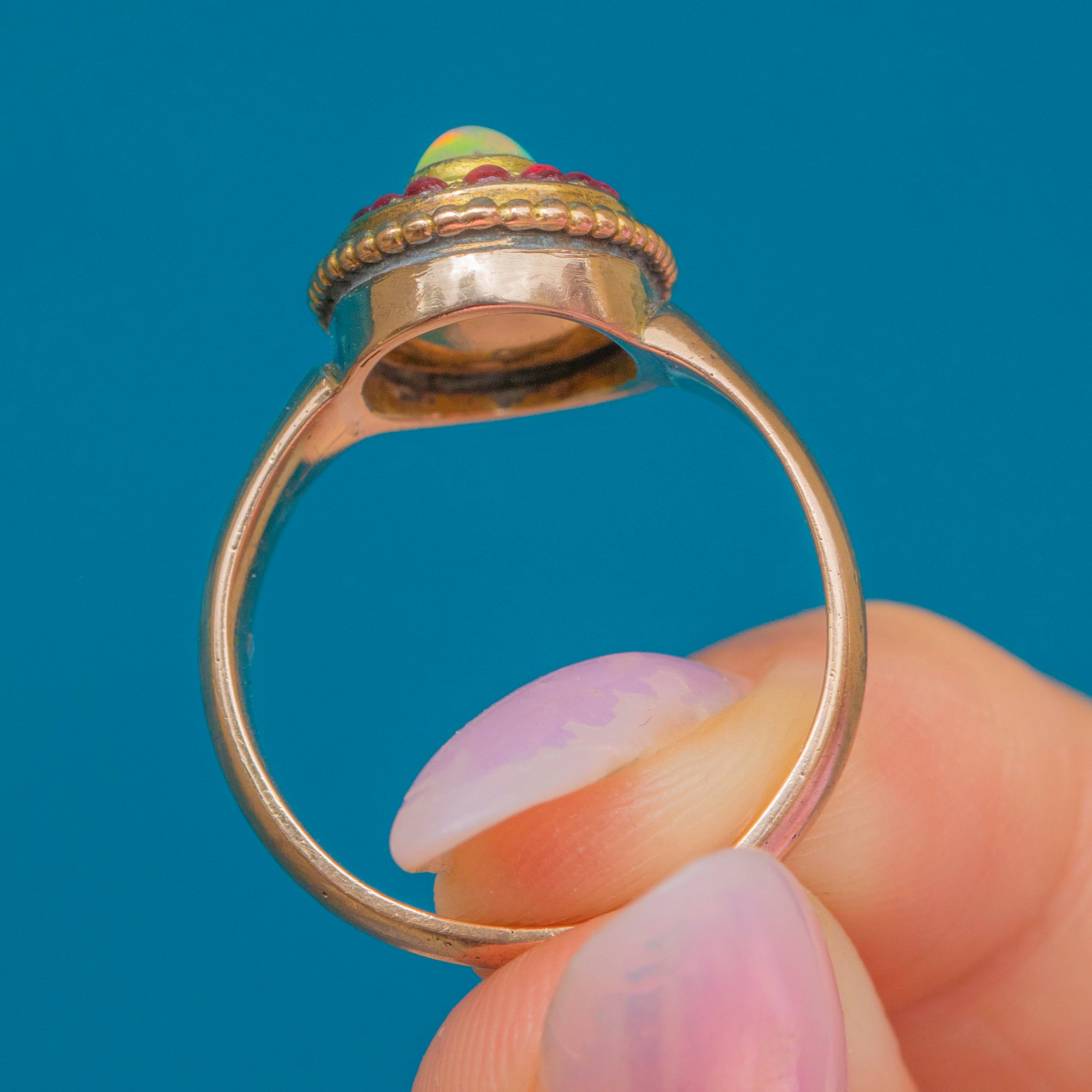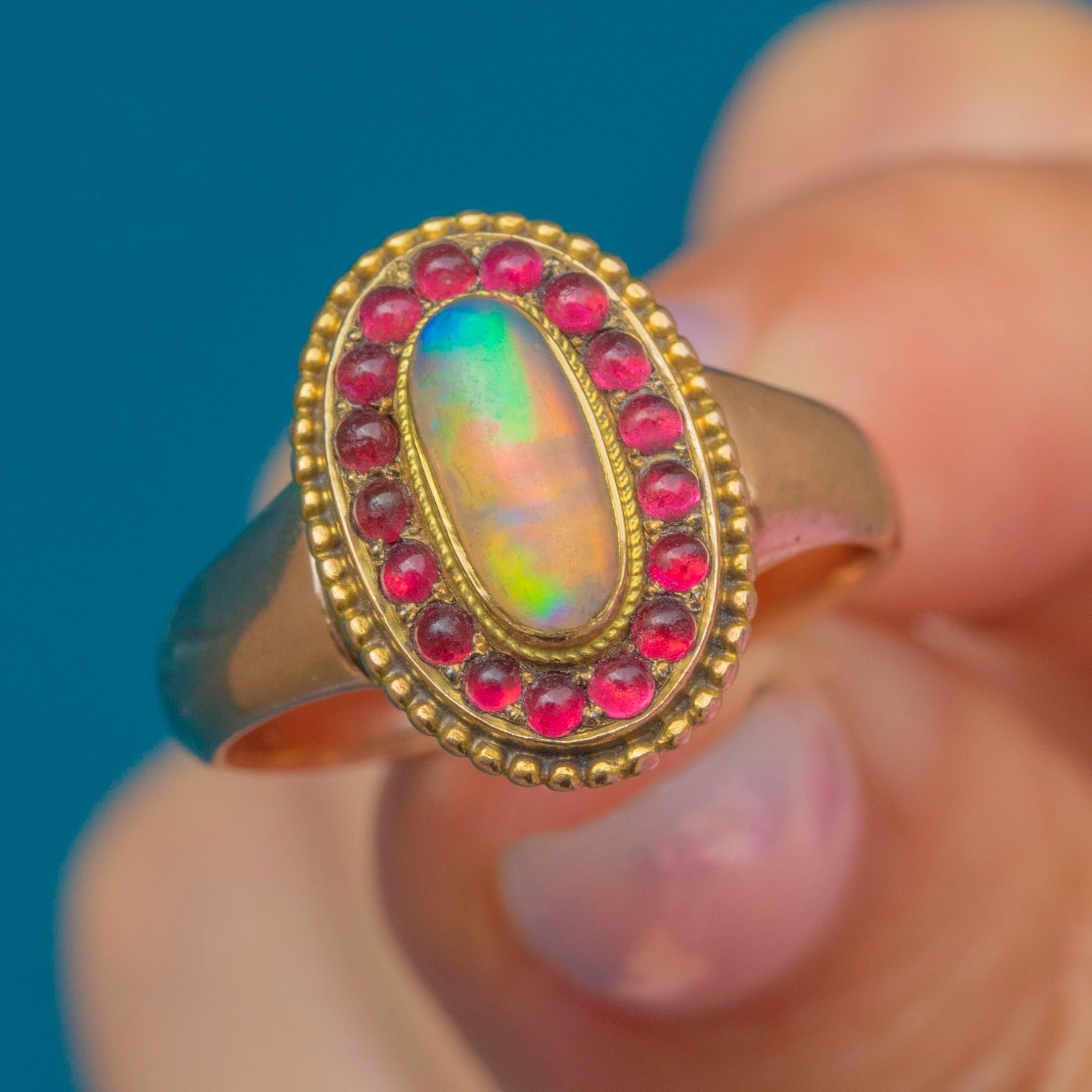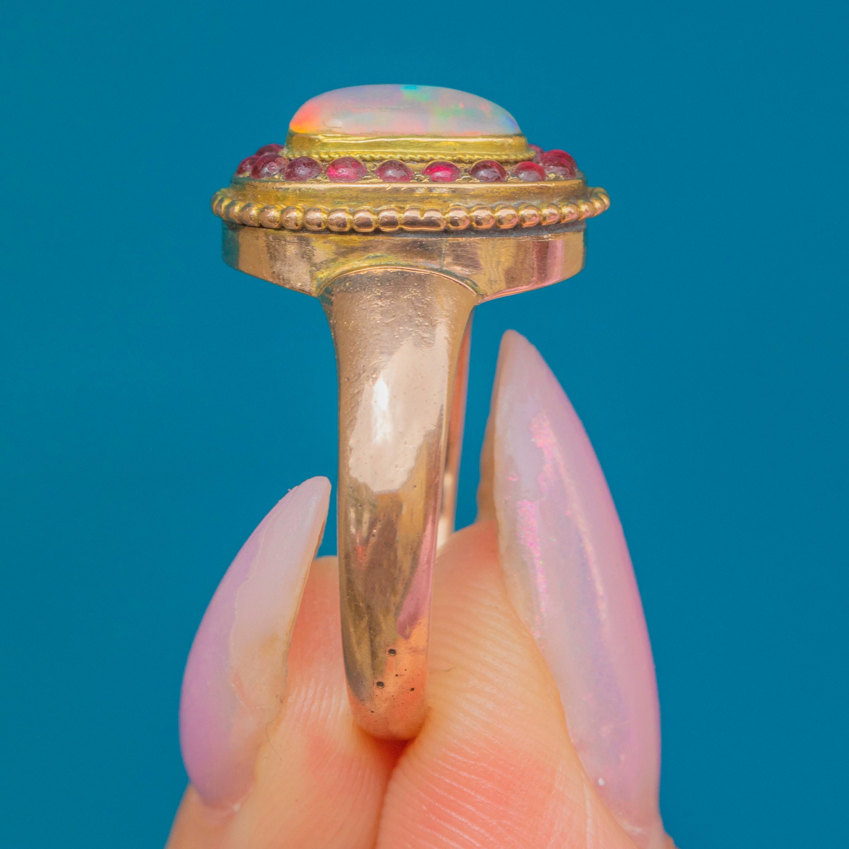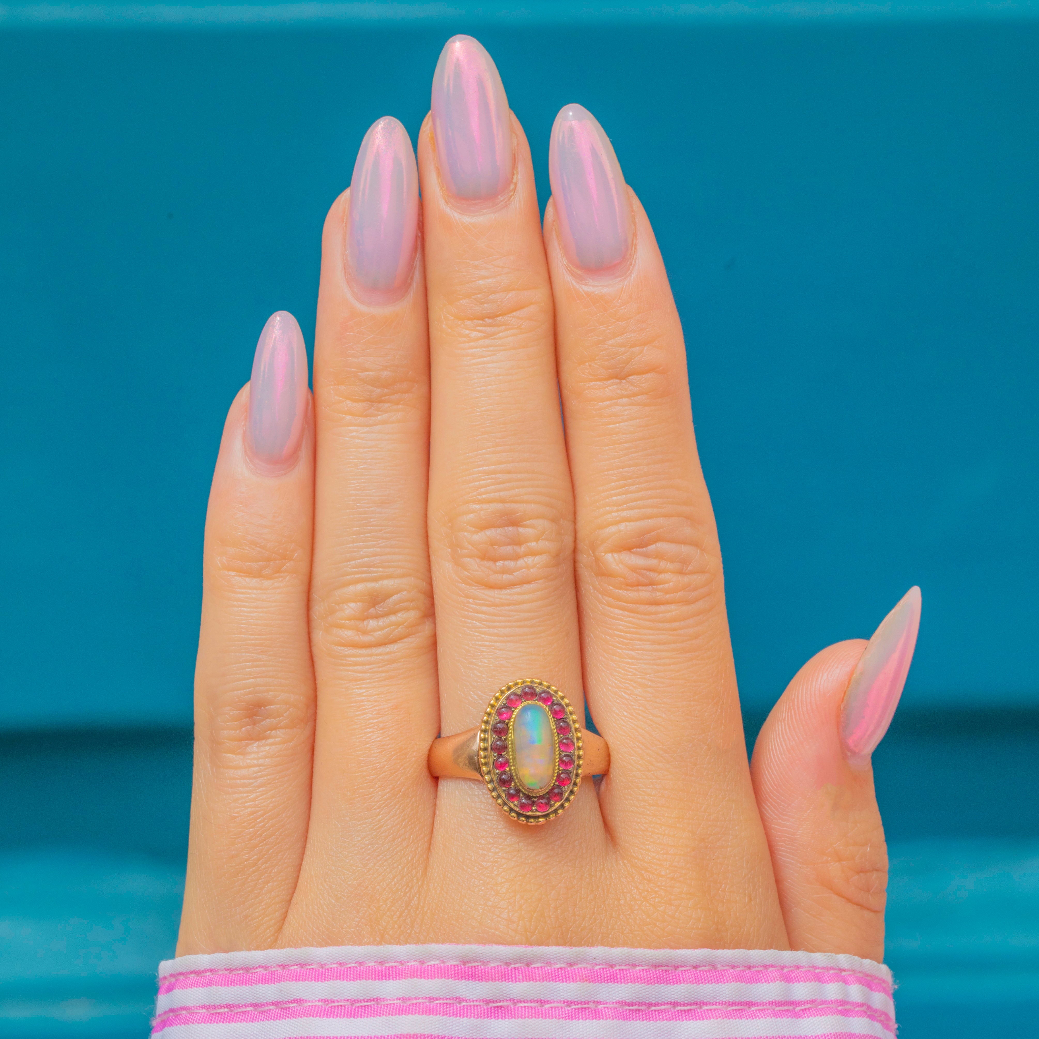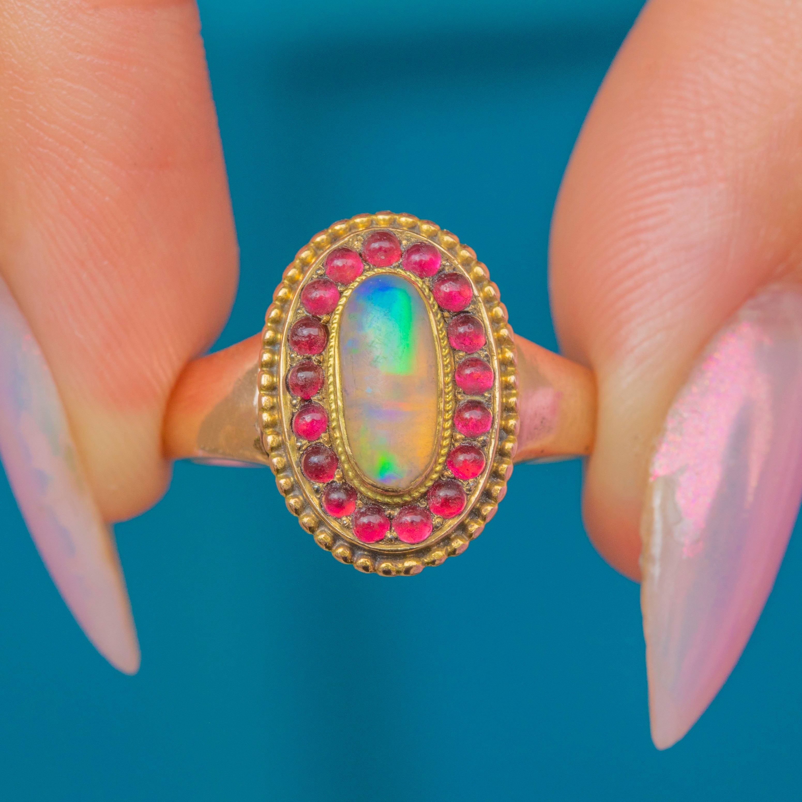 This striking and unusual Victorian ring is centred by a radiant Opal cabochon, projecting hypnotic blue, green, and lilac hues, and is encircled by a halo of vibrant pink Paste gems!