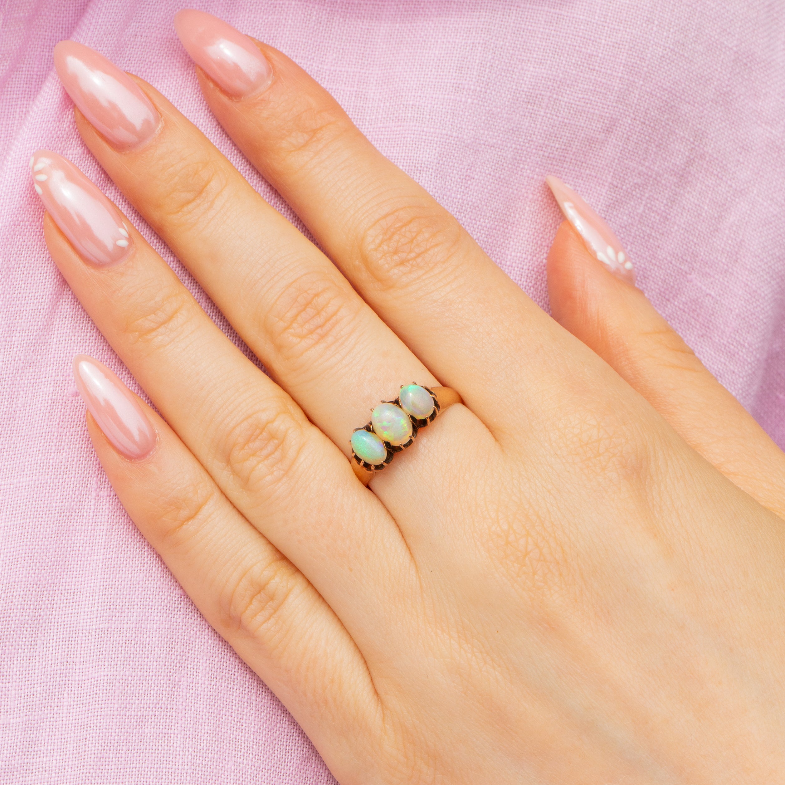 VERY GOOD. This antique 9ct Gold Opal trilogy ring is in very good condition. The Opals are so lovely, and securely set. The ring band is smooth, and wears super comfortably on the finger. There is some very light wear visible to the inside of the band commensurate with a ring of this age- there are two grooves on the inside of the band, but this is not visible when worn. There is a little scuff mark to the back of the band, but it's nothing that affects its overall appeal! The Opals are extremely vivid, solid and completely natural.