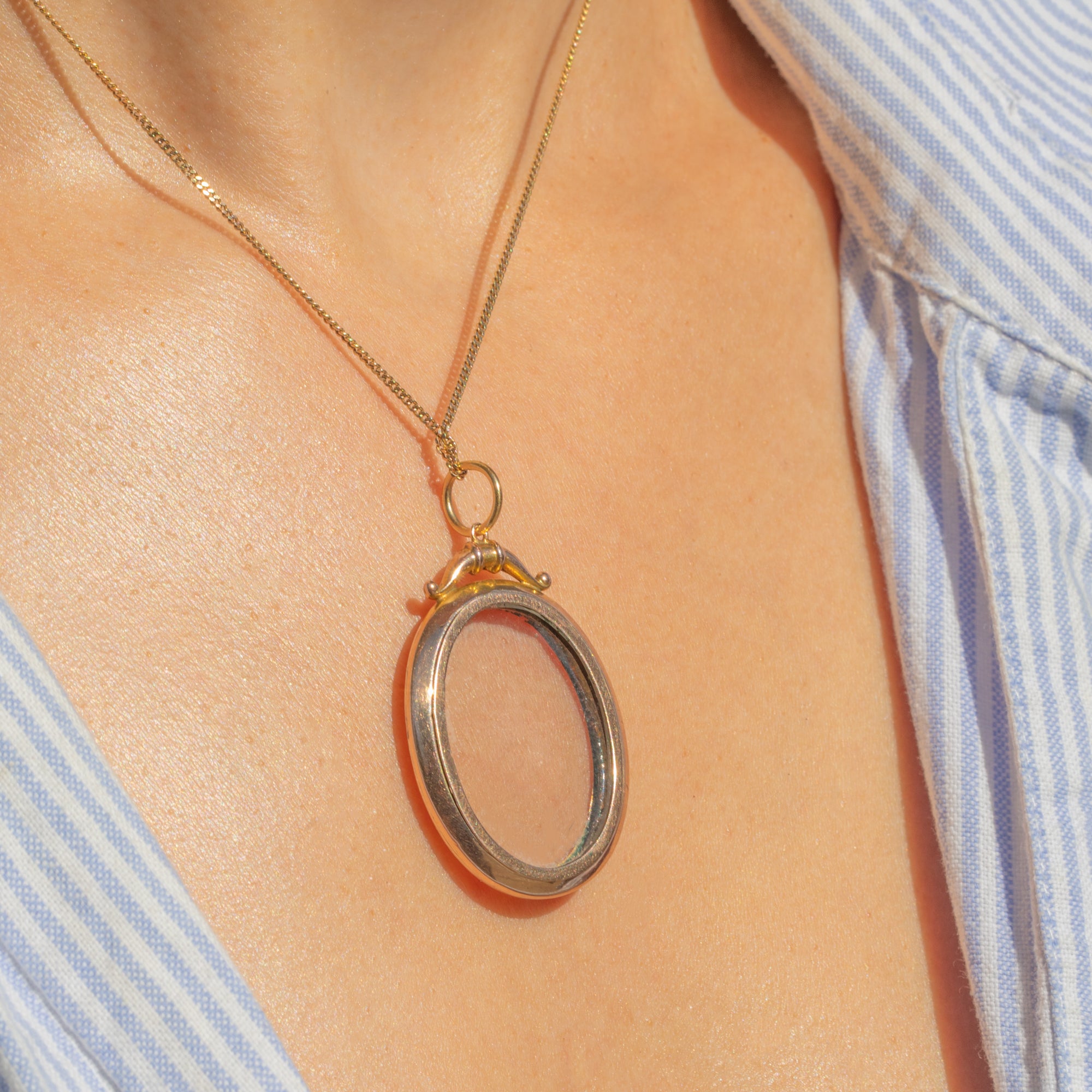 The solid 9ct Gold frame has developed a soft rosy hue over time, perfectly complementing the delicate, translucent glass. Complete with a decorative bale, this locket provides a lovely space for a cherished photograph to be displayed, or you can fill it with meaningful items like dried flowers, strands of hair, or other personal mementos.