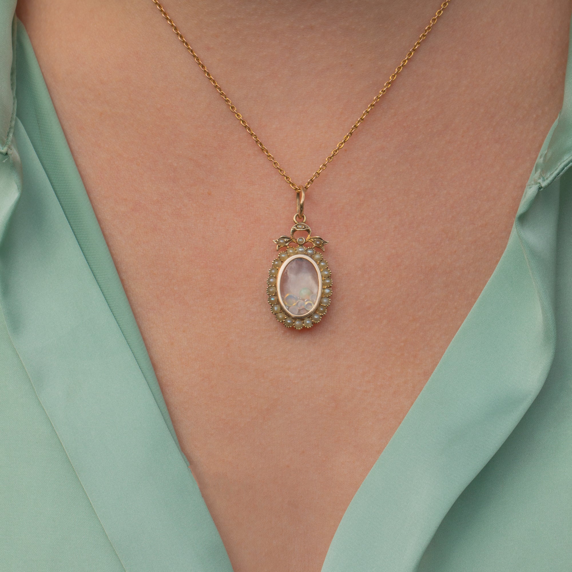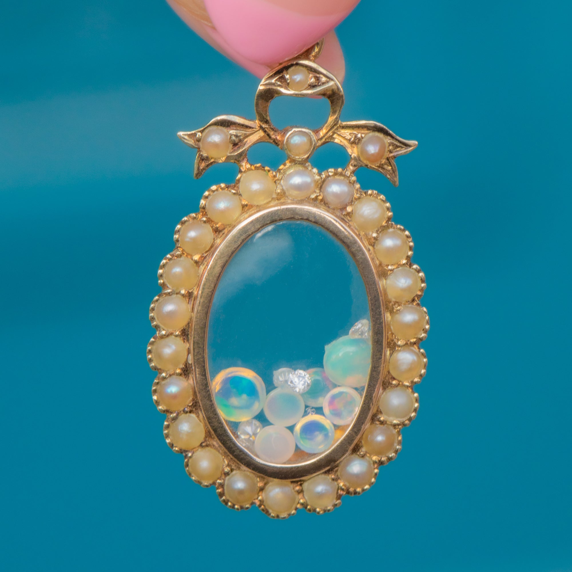 With a party of gems nestled inside her glass, the twinkling Diamonds, iridescent Opals and luminous Moonstones look sublime when they catch in the light. We adore how her plump Pearls brining femininity to this Edwardian locket, she will make a pretty addition to your antique jewellery collection!