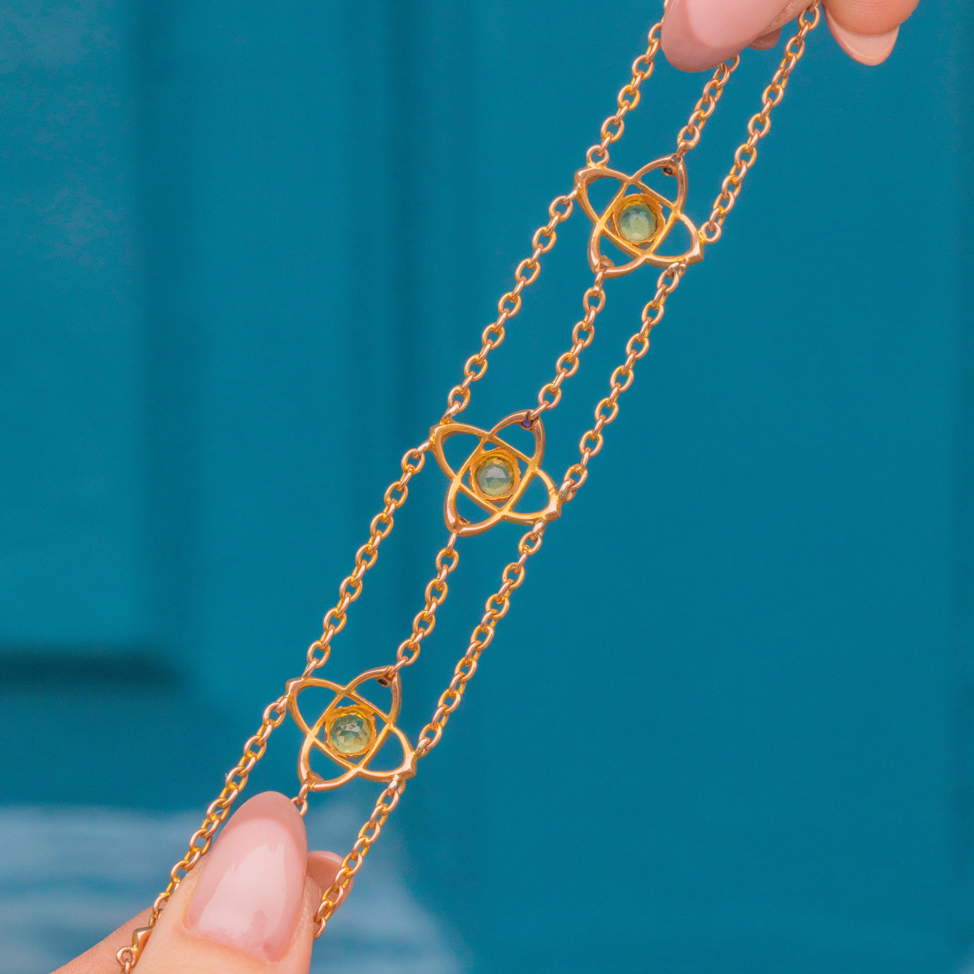 EXCELLENT. This antique 9ct Gold Peridot Ruby flower bracelet is in excellent condition. Her Peridots are bright and zingy, with no visible signs of wear. Her Ruby gemstones are also all present and securely set into their Gold settings. The links of the Gold chains are securely connected and have kept their form well. Her Heart padlock secures shut with a satisfying "click", providing secure and confident wear. All in all, she's a dream!