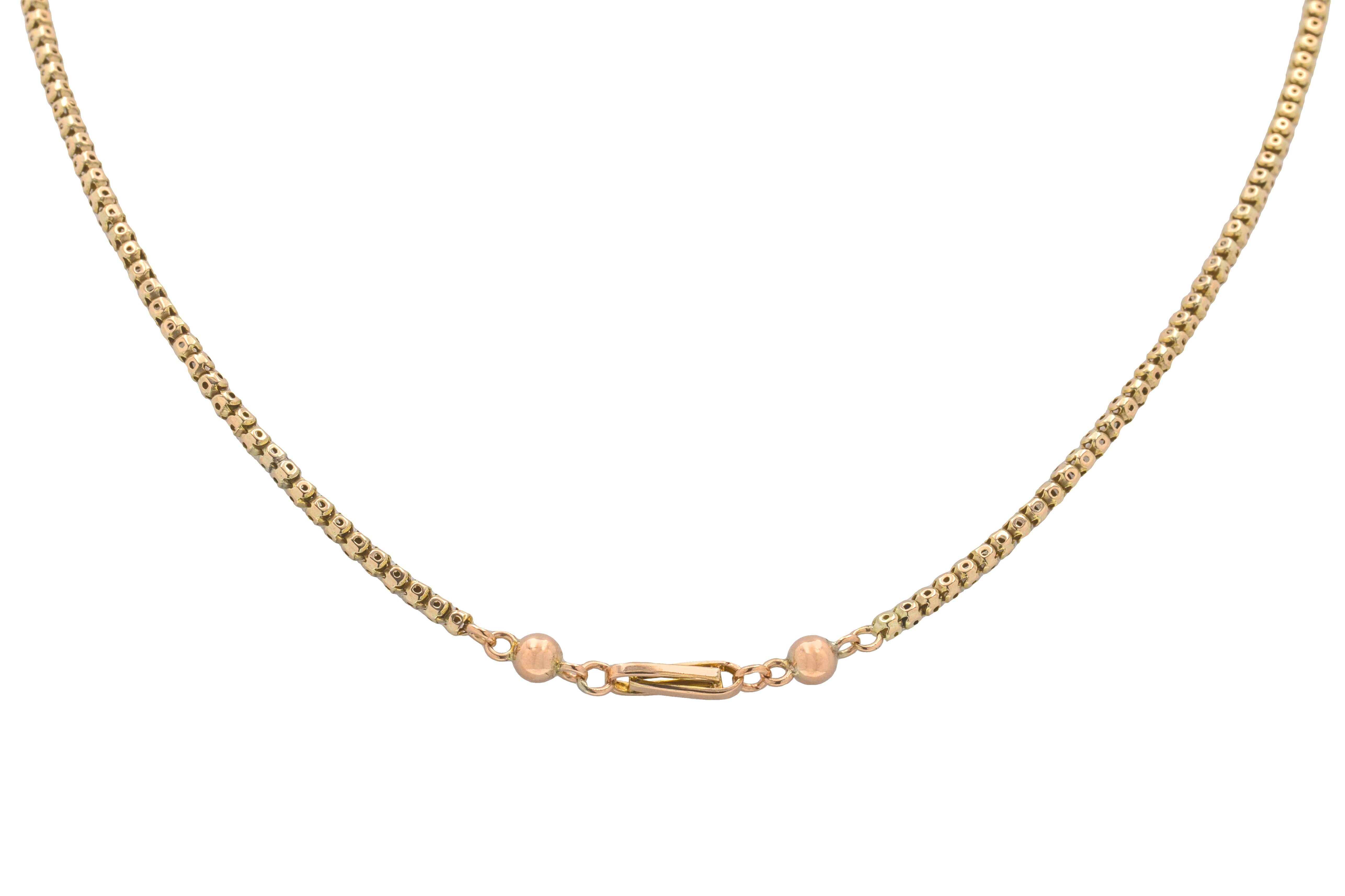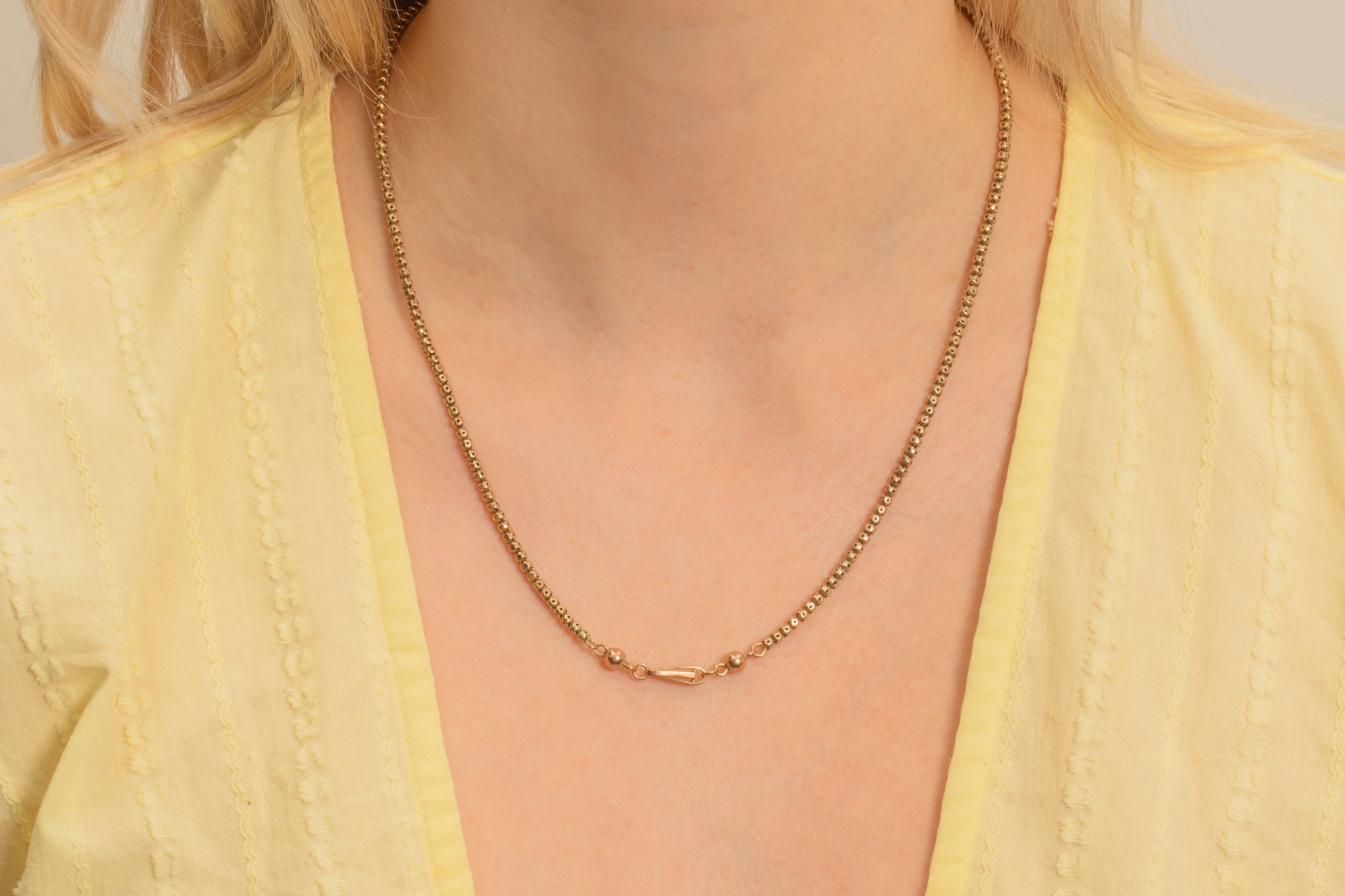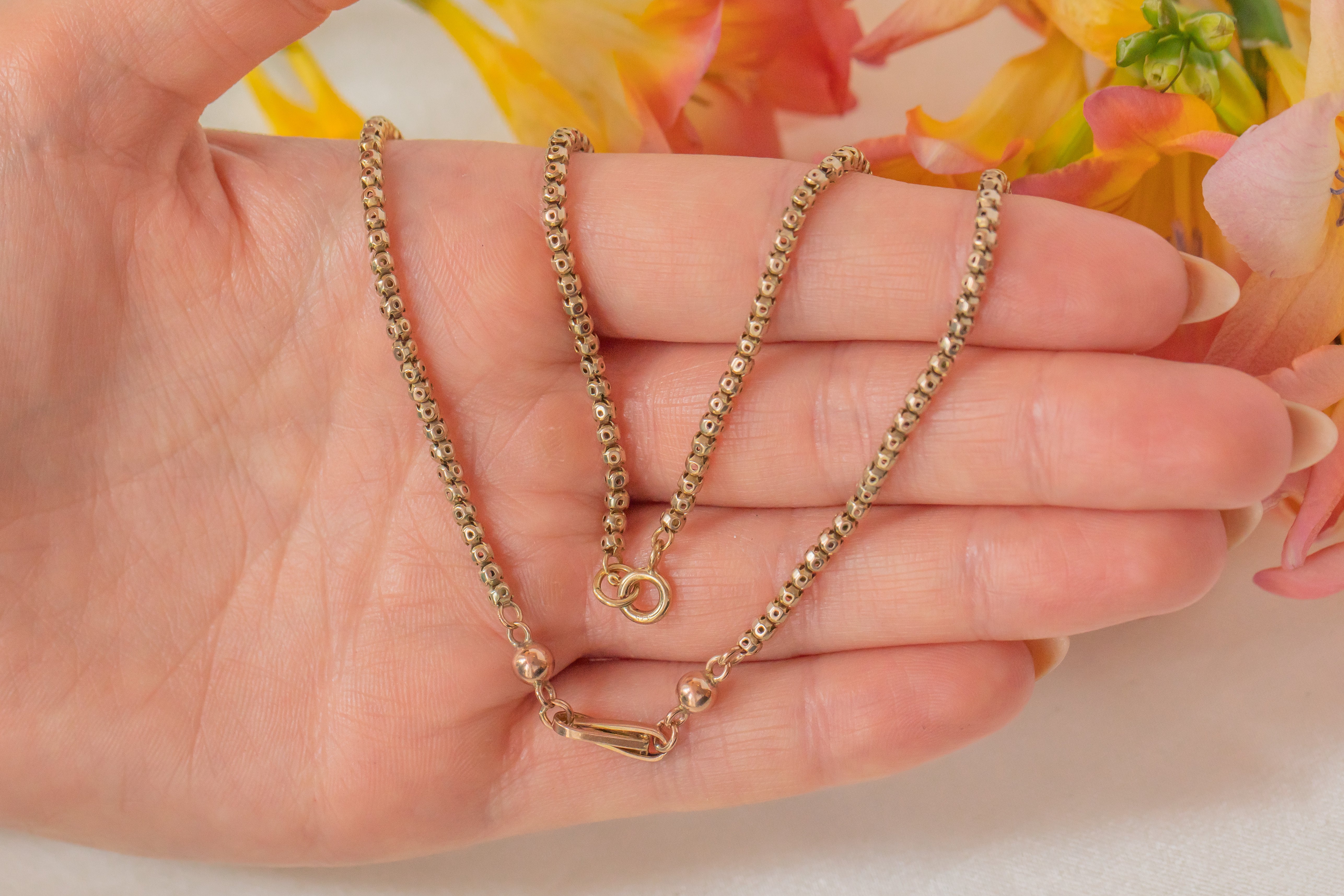 EXCELLENT. This antique 9ct Gold pierced chain is in excellent condition! Each pierced link is uniform and securely interlinked with the central ball and fetter detailing firmly affixed to the chain. The bolt ring is in perfect working condition so you can wear this piece with pride and confidence.