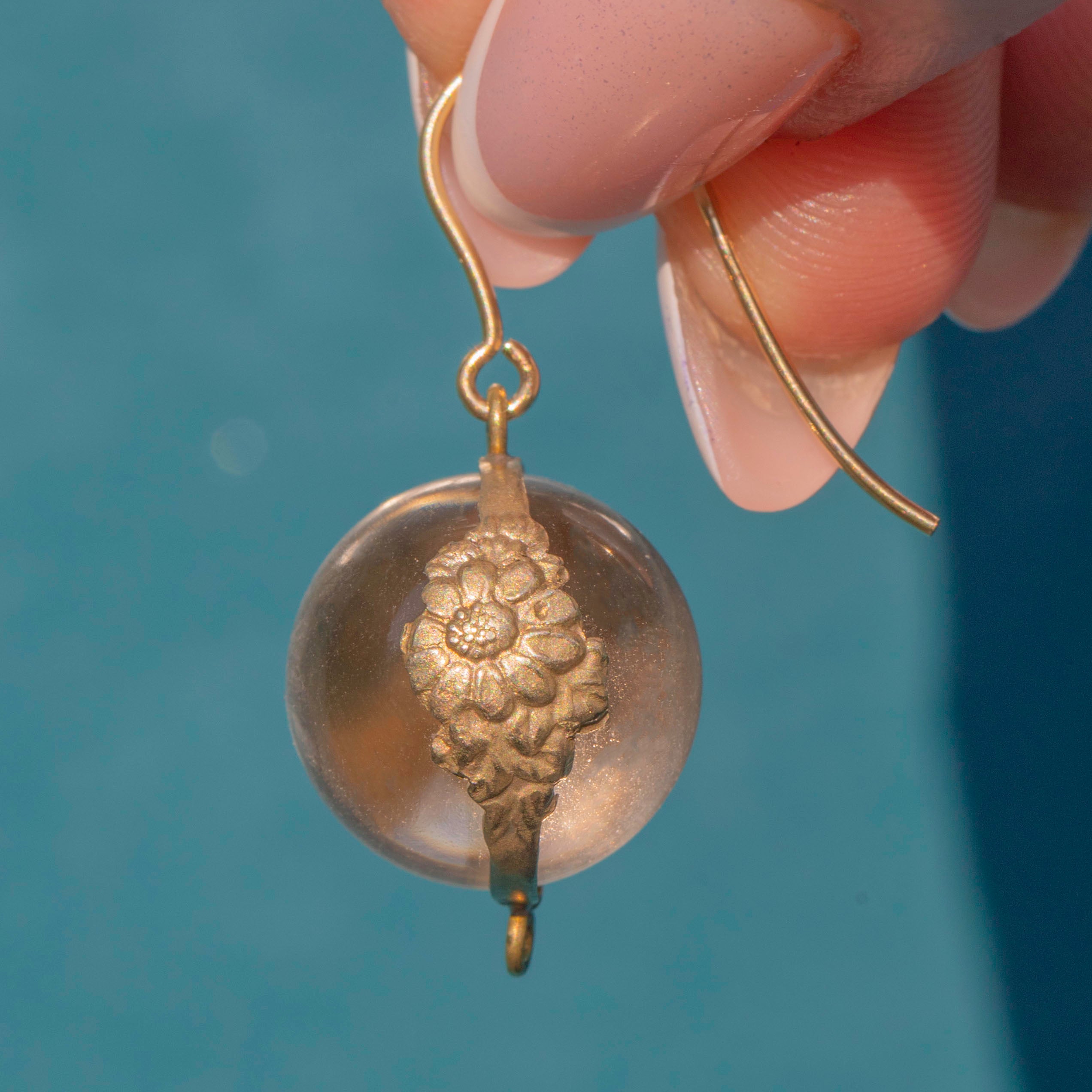 EXCELLENT/VERY GOOD: A superb pair of Antique 9ct Gold Pools of Light Rock Crystal Earrings, crafted for both elegance and versatility. Each Rock Crystal orb is beautifully smooth, free of chips or scuffs, and held firmly in its setting for lasting wear. Aside from some mild wear to the Silver floral settings, they are still wonderful which a gorgeous patina. What delight!