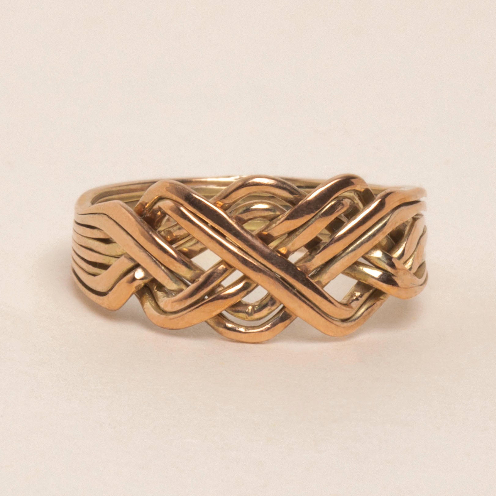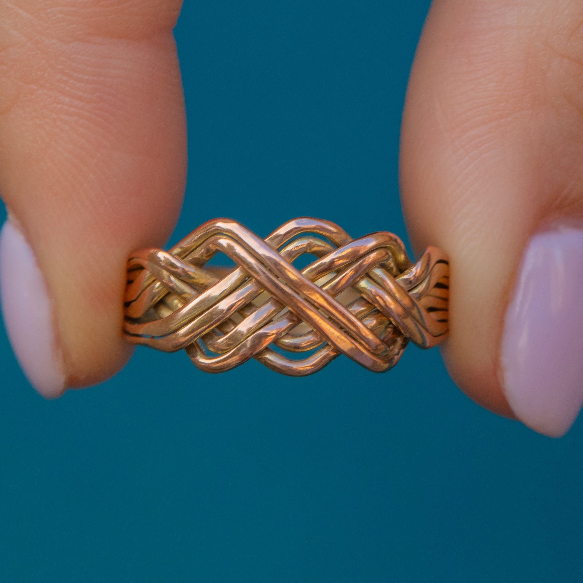VERY GOOD. This antique 9ct Gold puzzle ring is in very good condition. The intricate bands have stood the test of time and remained perfectly entwined, with only a small ding at the front noticeable under very close inspection. The 9ct Gold is buttery and while there is slight variation in the Gold tone at the back of the band, this is due to the strong soldering and cannot be seen when the ring is worn. Traditional puzzle rings comprise several individual bands linked together to form one ring, the bands on this ring have been soldered together making it more robust. This Victorian puzzle ring will make an eclectic addition to your antique jewellery collection!