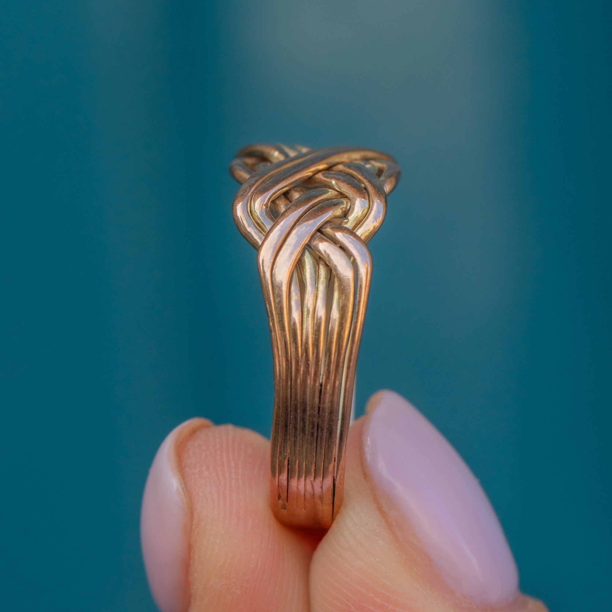 Prepare to be intrigued by this antique 9ct Gold puzzle ring! Dated to the Victorian era, this ring is formed with intricate subtle rosy-hued Golden bands entwined to represent the classic puzzle design.