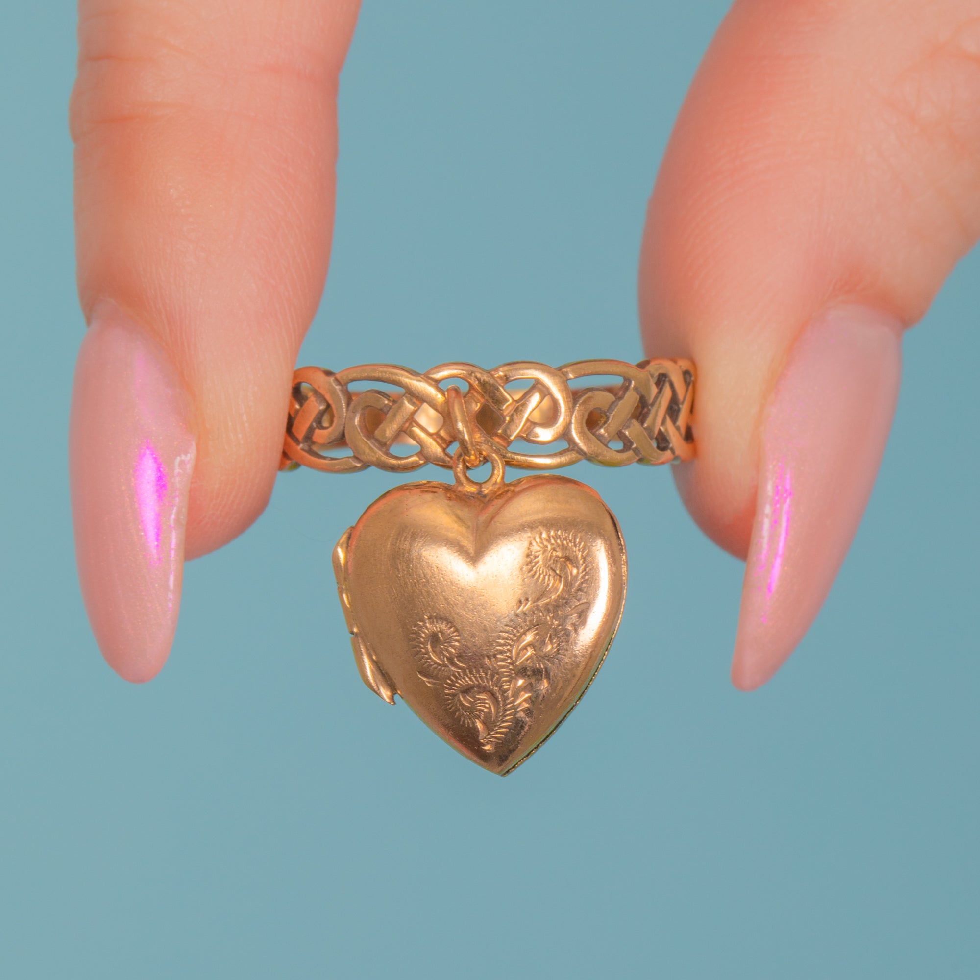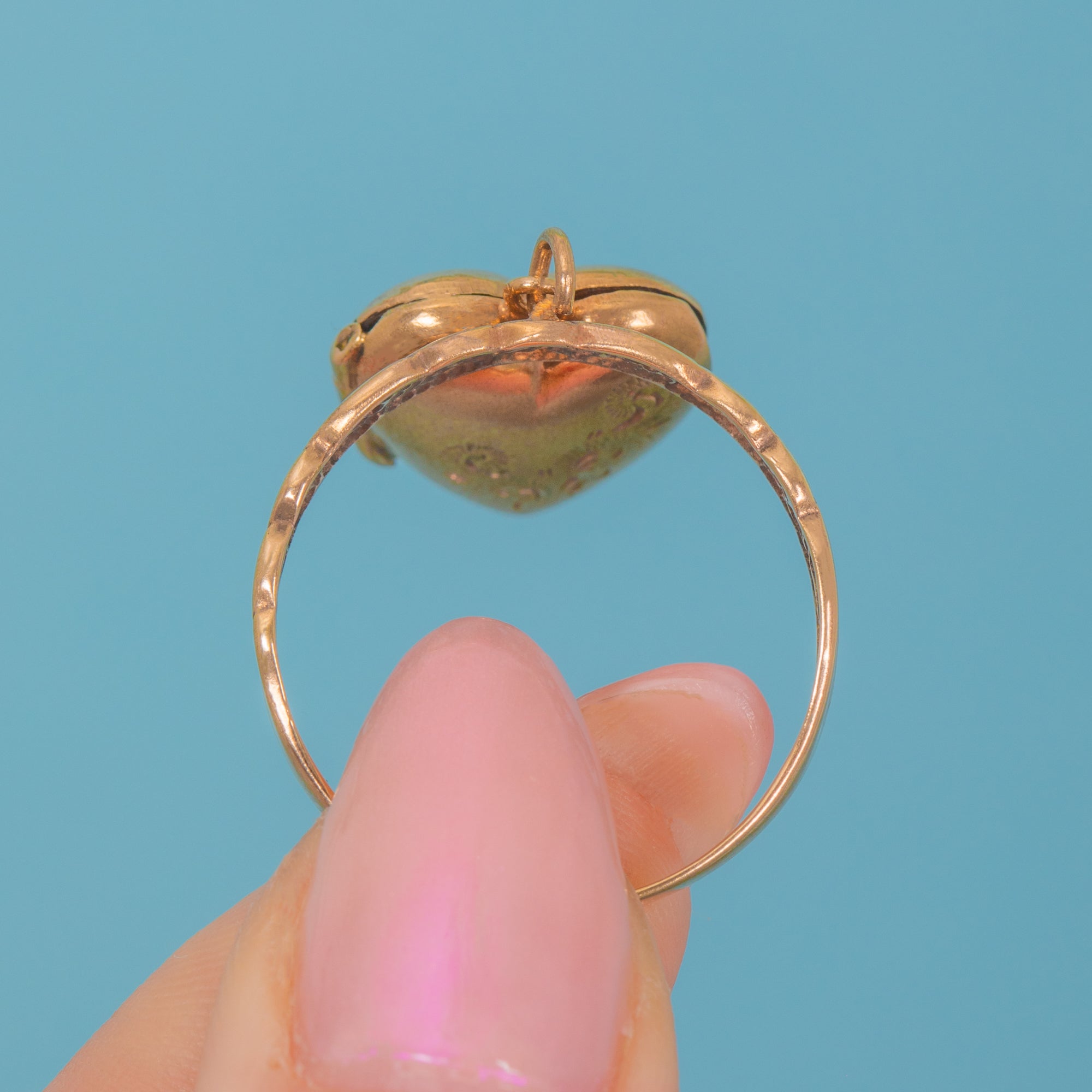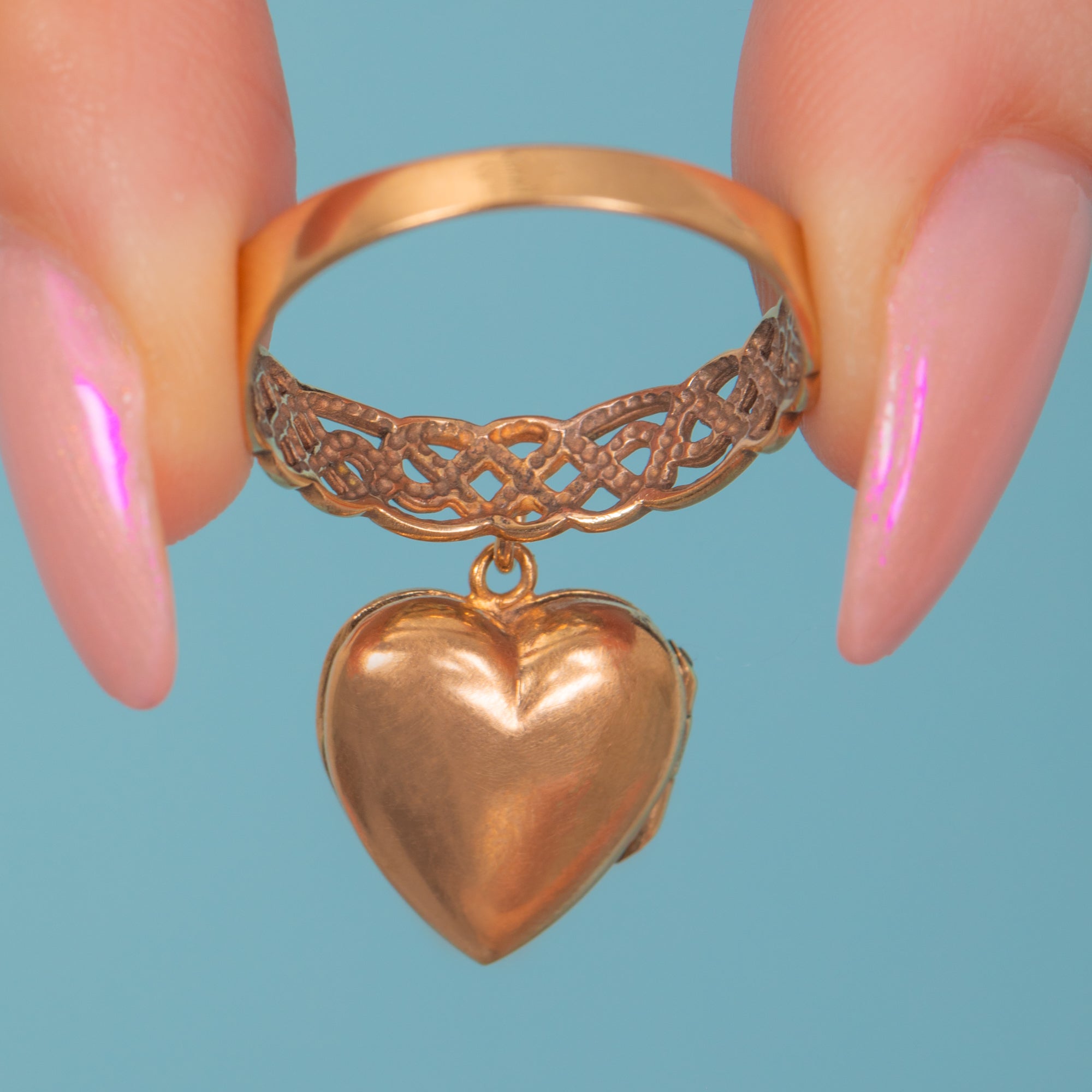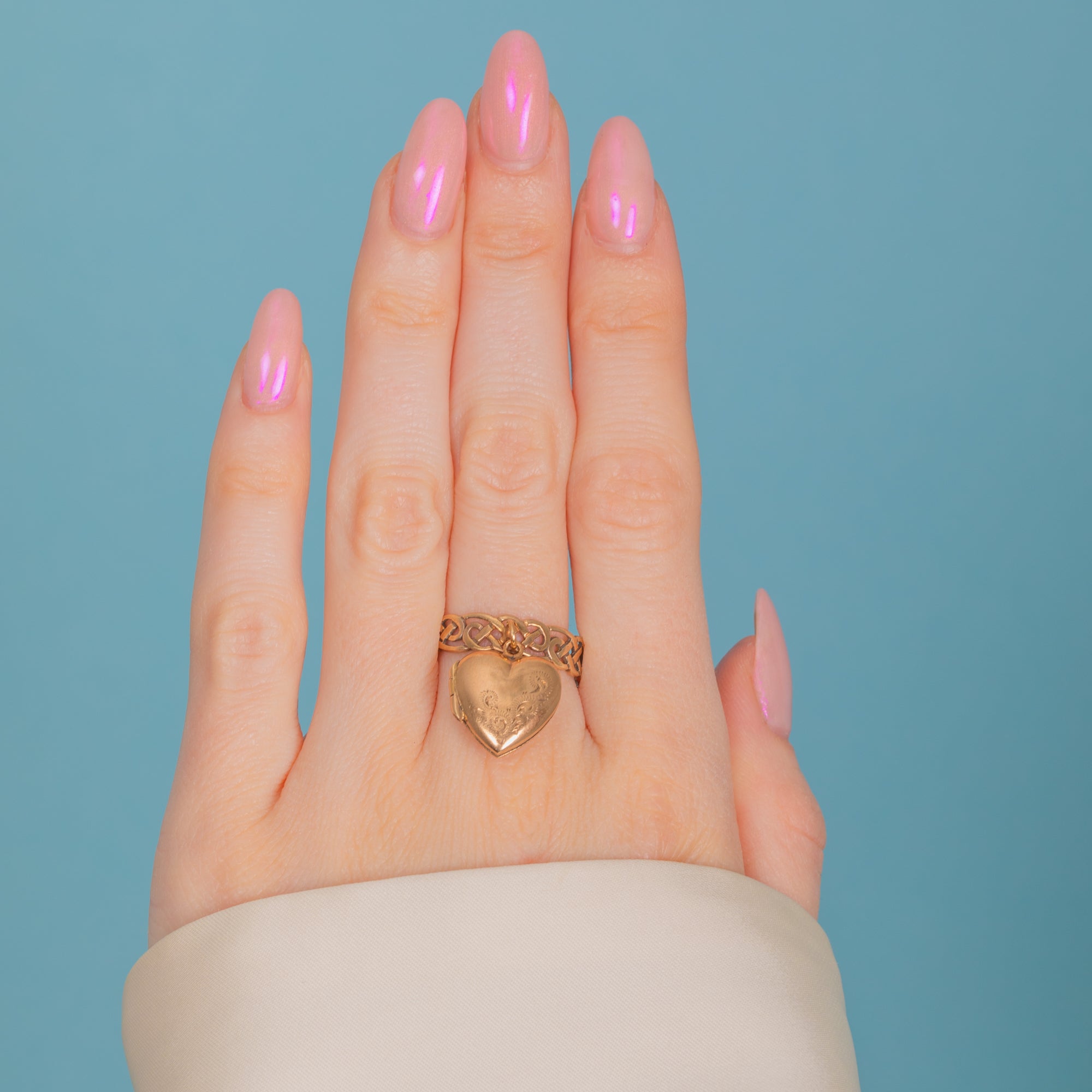 This antique 9ct Gold ring, complete with a romantic heart locket, is exquisite! Truly unique, her Edwardian features are whimsical and charming, with an intricately detailed band and engraved locket adding a touch of decadence.