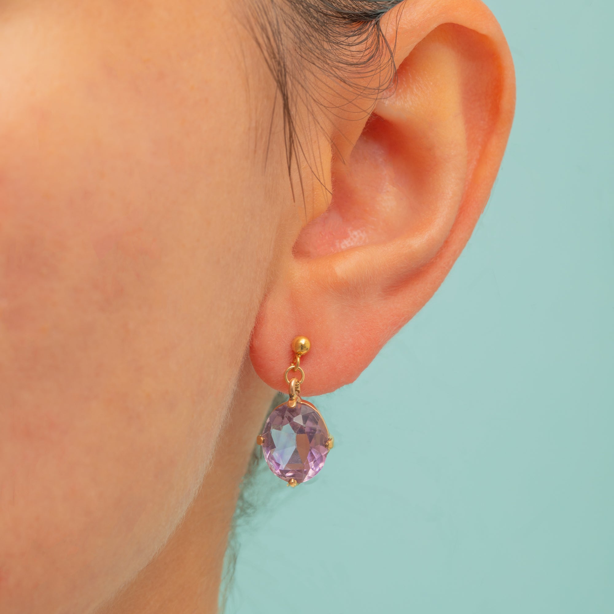 Suspending a plump Rose de France Amethyst, each earring radiates gorgeous pastel lilac hues as her gorgeously faceted gemstones catch the light. They are hugged by buttery 9ct Gold claws, with the warmth of the Gold complementing the soft lavender Amethysts beautifully.