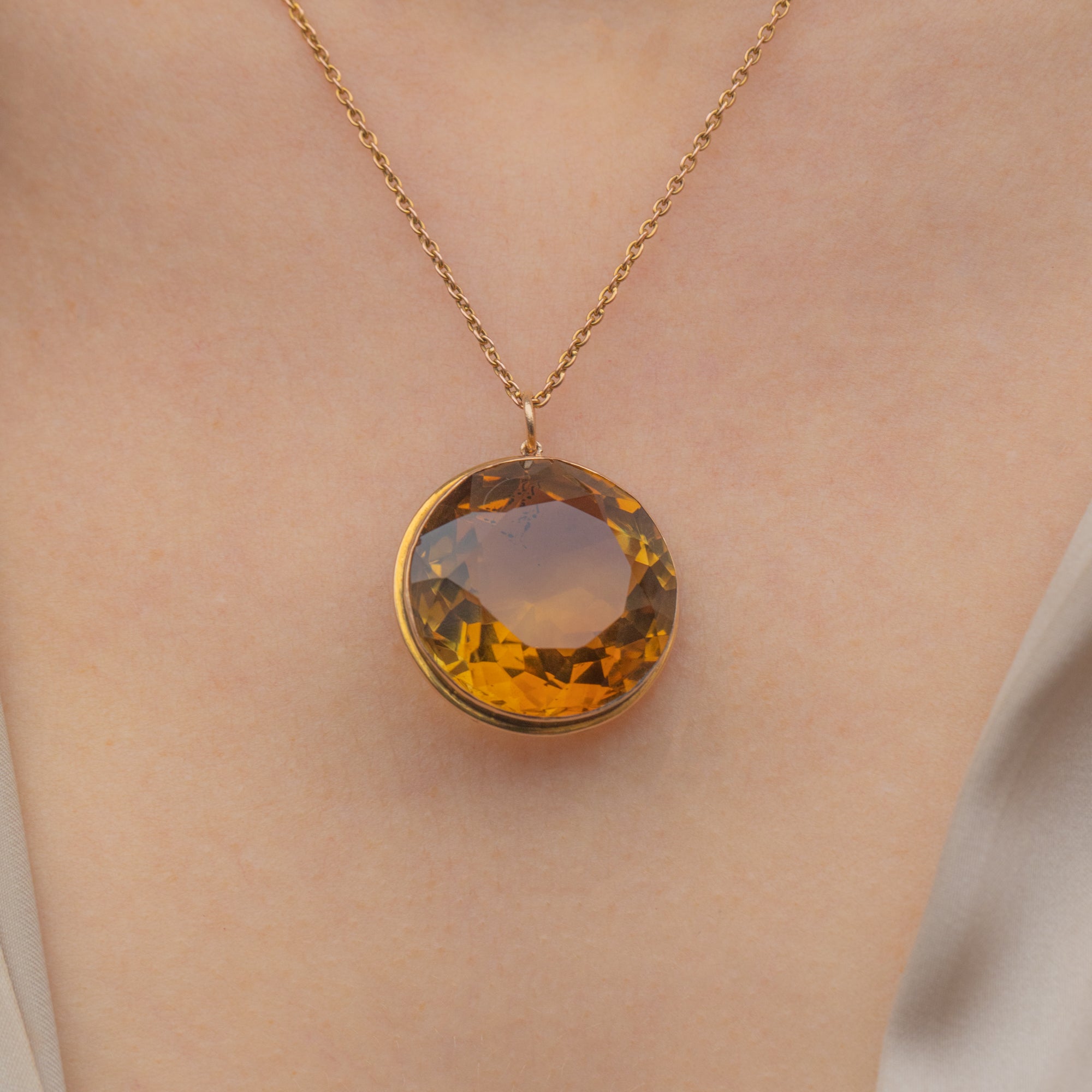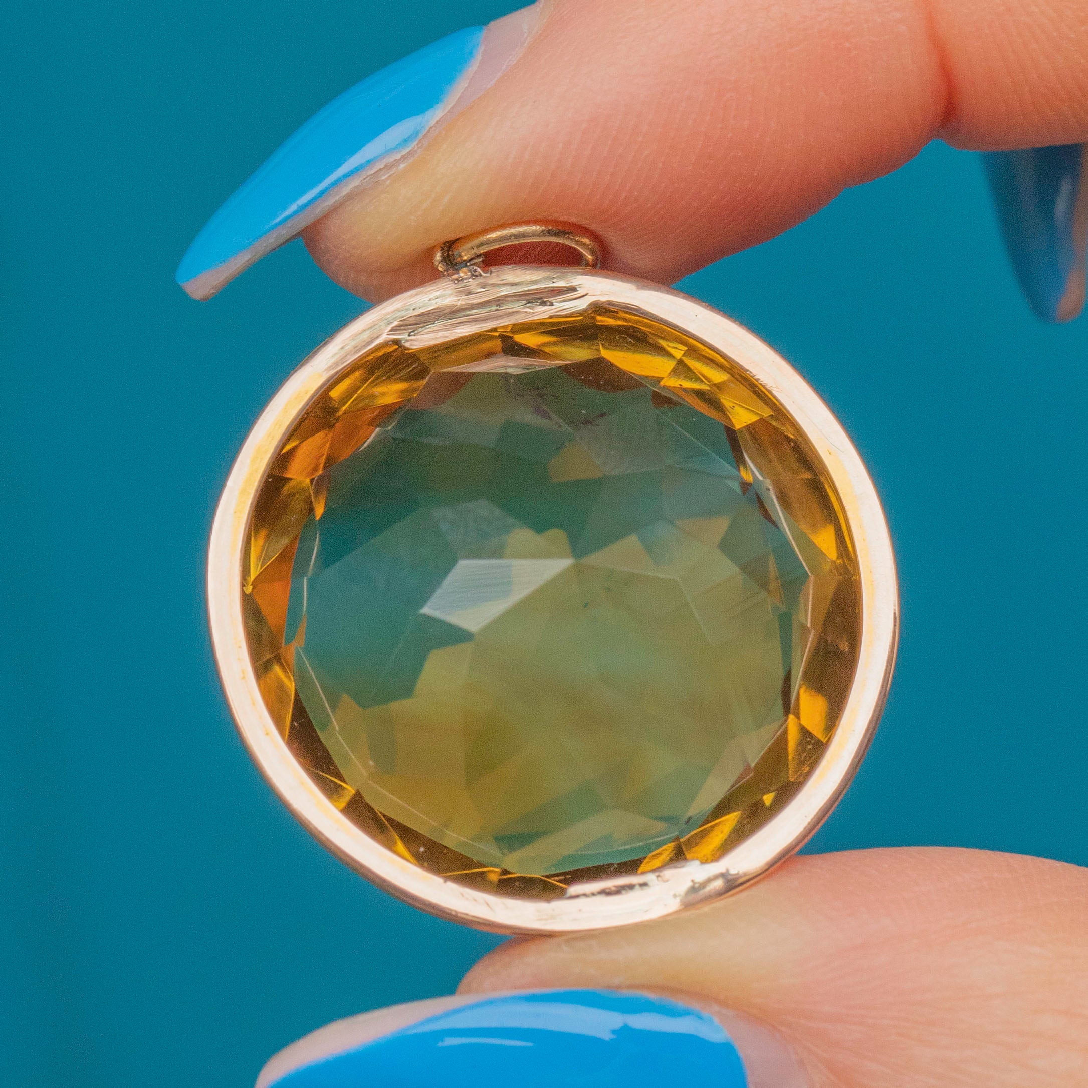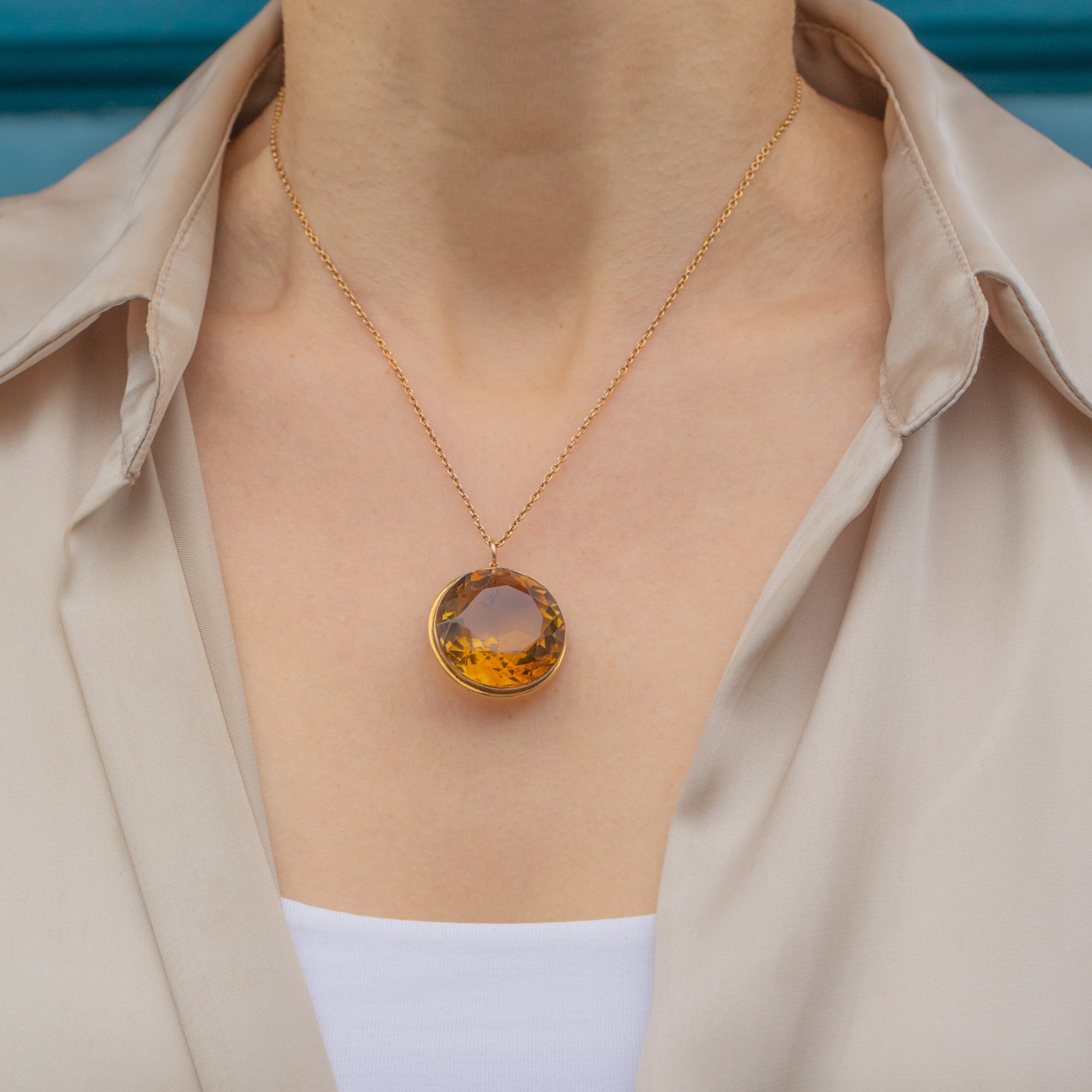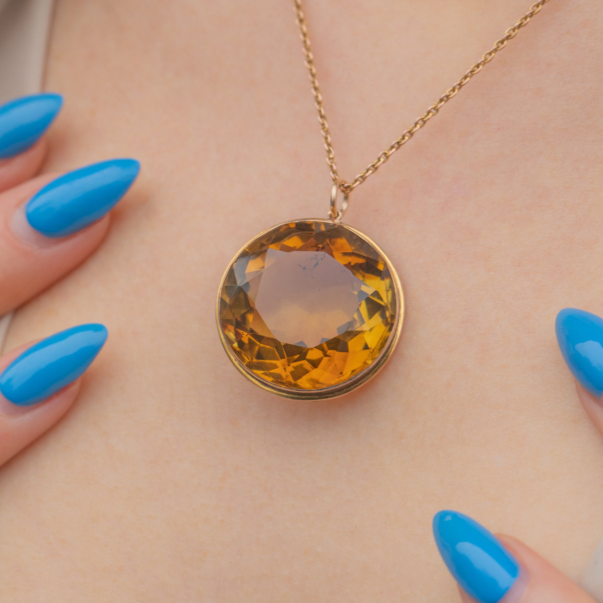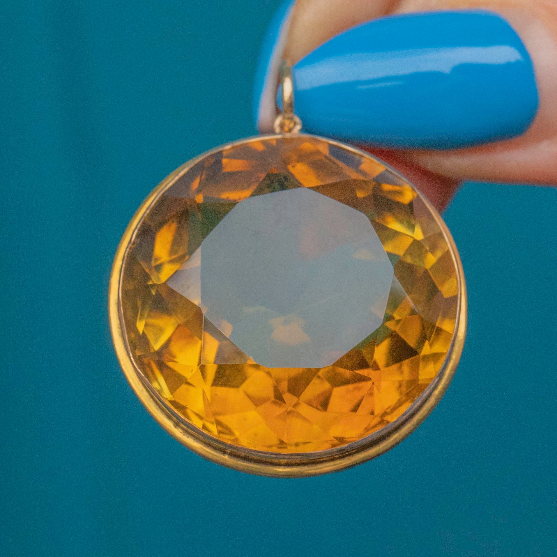 This antique 9ct Gold round Citrine pendant is the ultimate statement piece! The whopping 33.11ct Citrine packs a serious punch and has been exquisitely faceted, creating a spectacular display of golden glimmers as it catches the light.