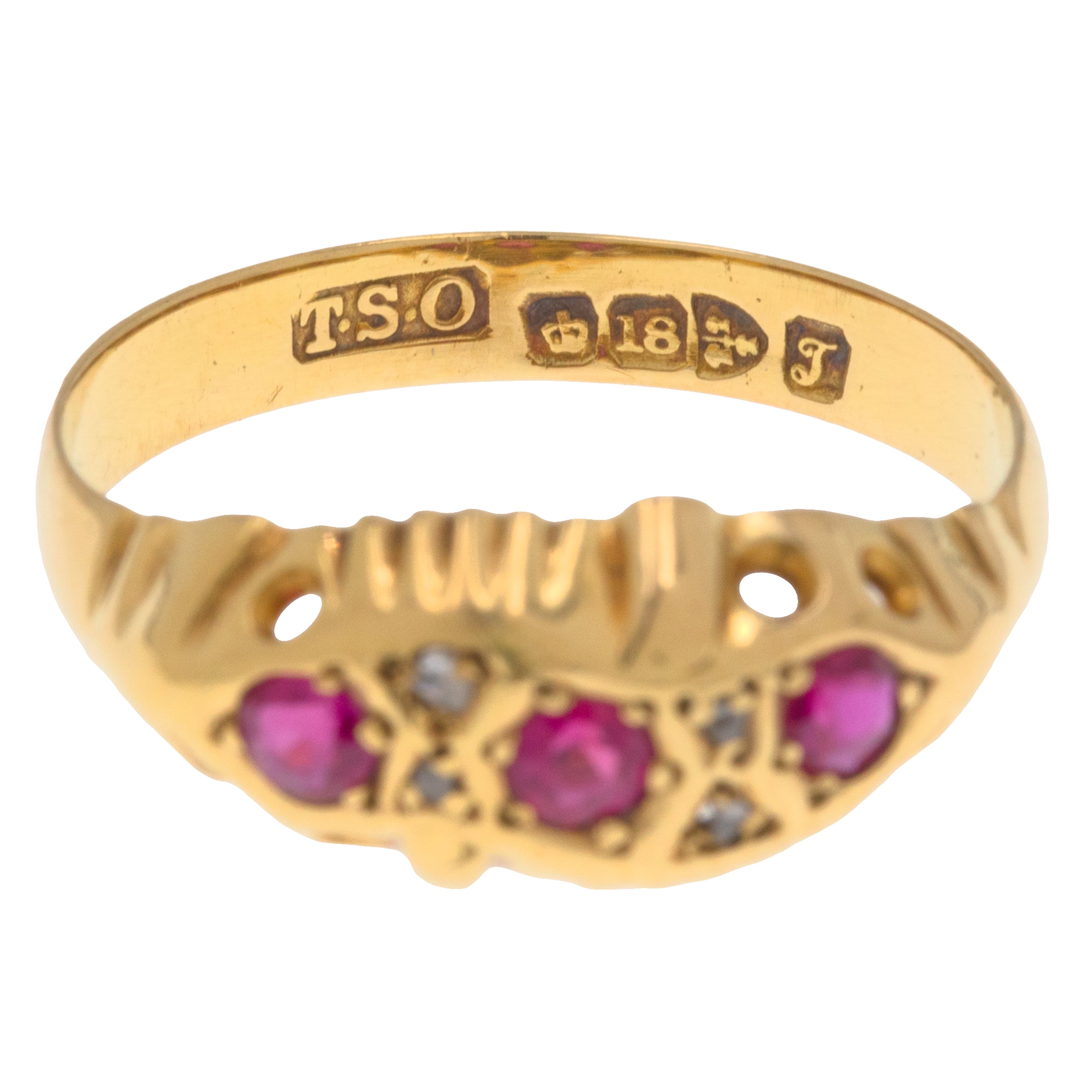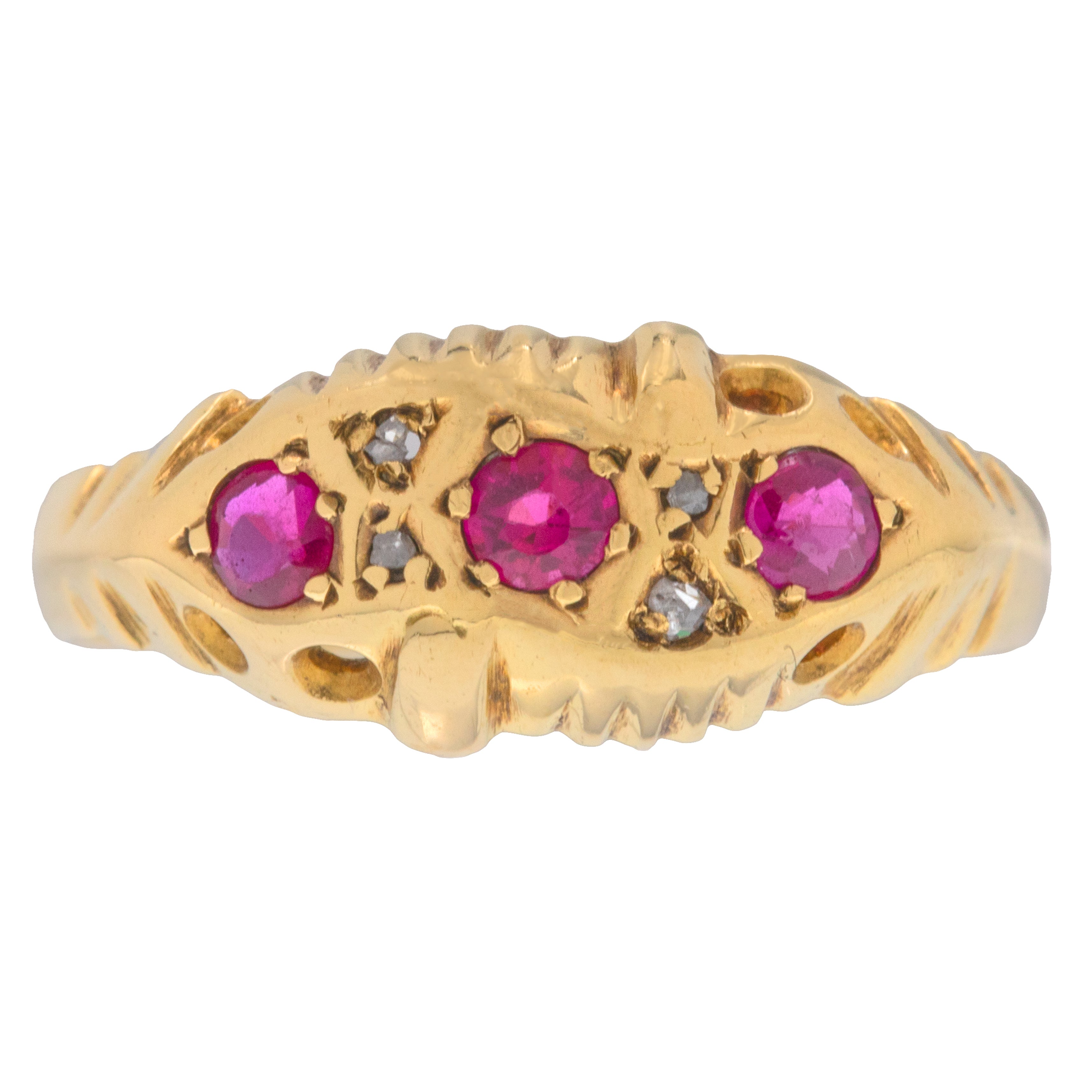 EXCELLENT. This antique 18ct Gold Ruby Diamond ring is in excellent condition throughout. The Gold is saturated and all of the details have remained crisp. The gemstones are all present and securely set, free from any chips or fleabites. With a full set of hallmarks on the inside of the band allowing us to accurately date her to 1919, this is a highly collectible ring ready to be adored for years to come!