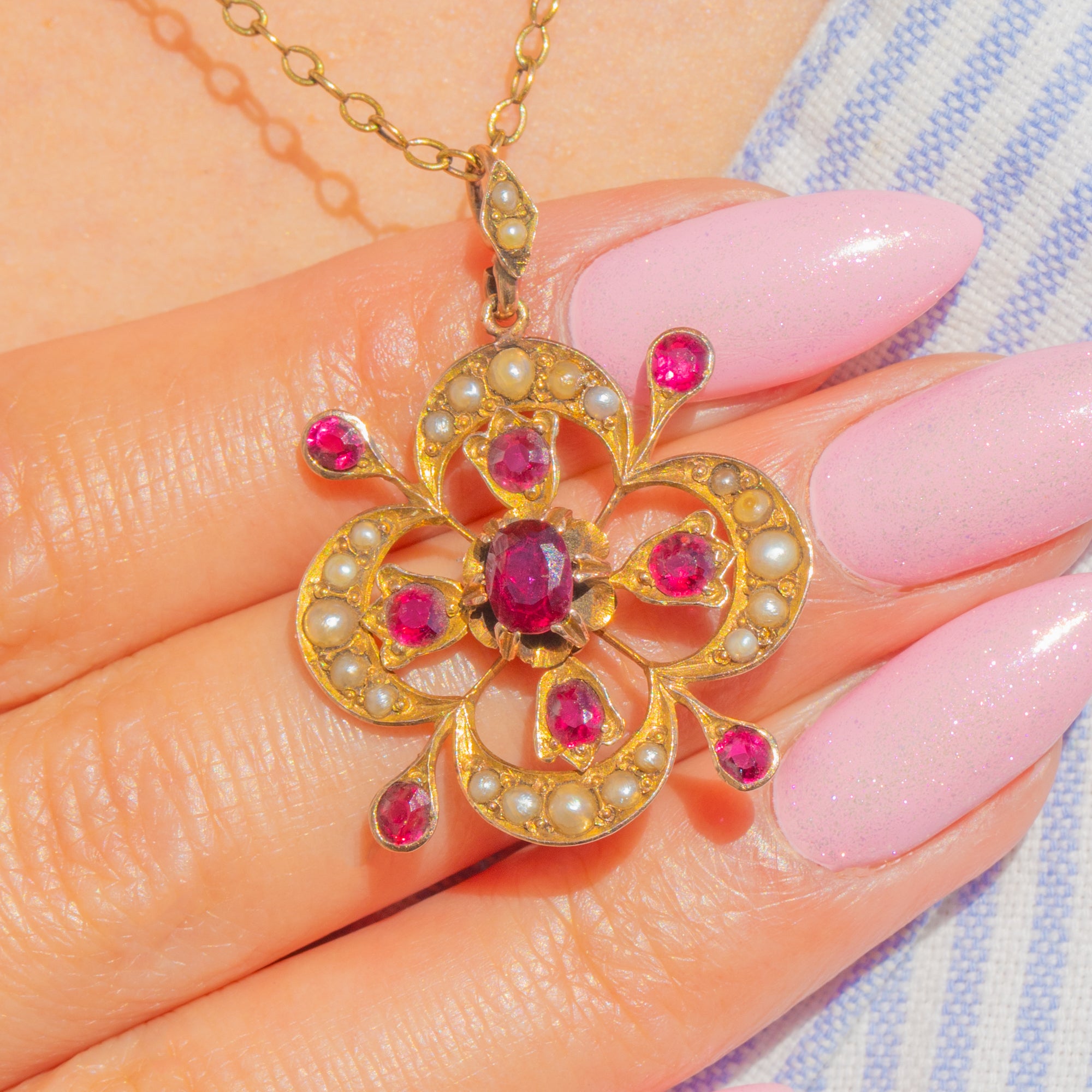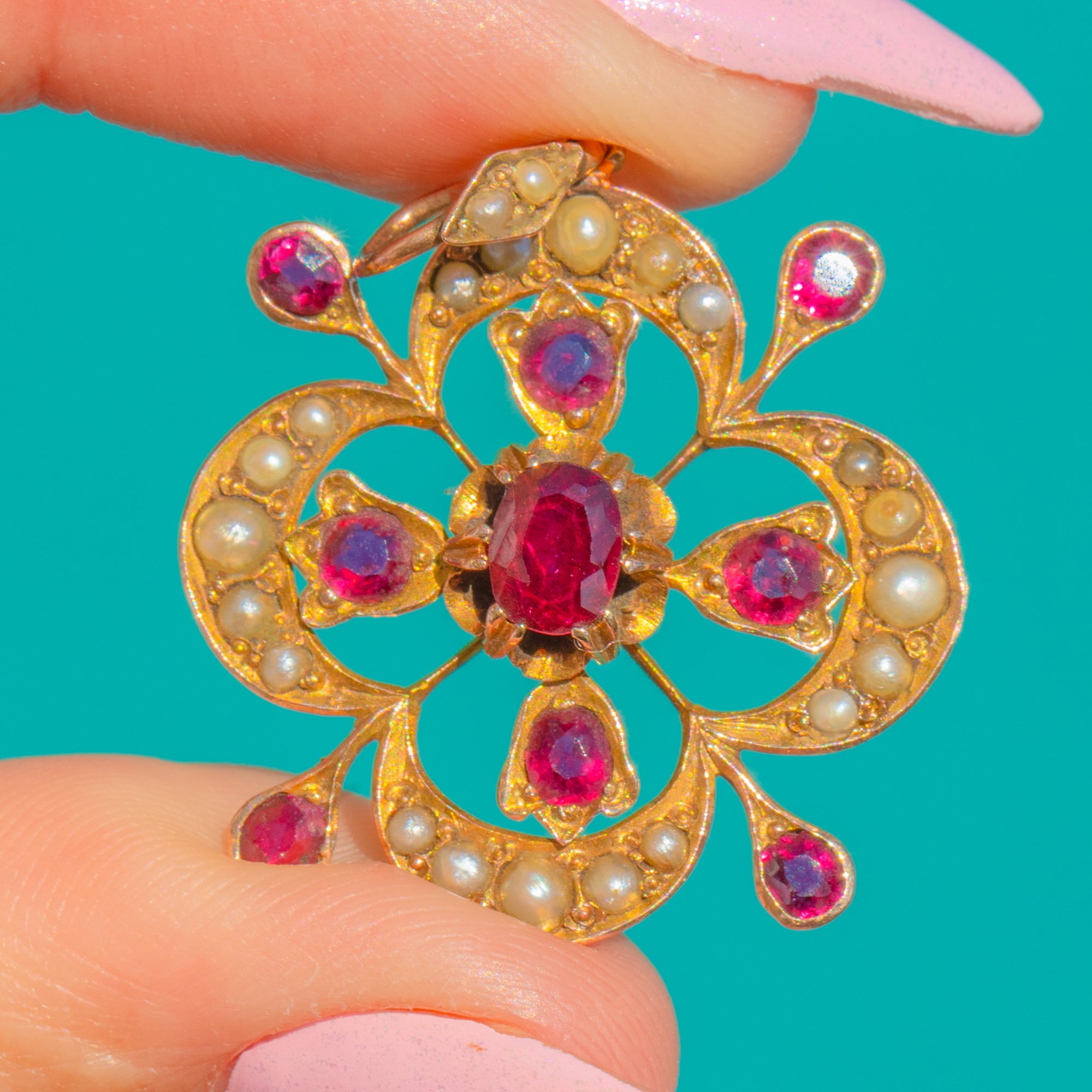 Beautifully made and full of late-19th-century charm, the balanced floral form and refined ornamentation make this an elegant choice for everyday luxury or a special occasion. The Rubies bring a lively pop of pink-red colour, while the Pearls add a gentle, antique lustre—timeless and endlessly wearable.