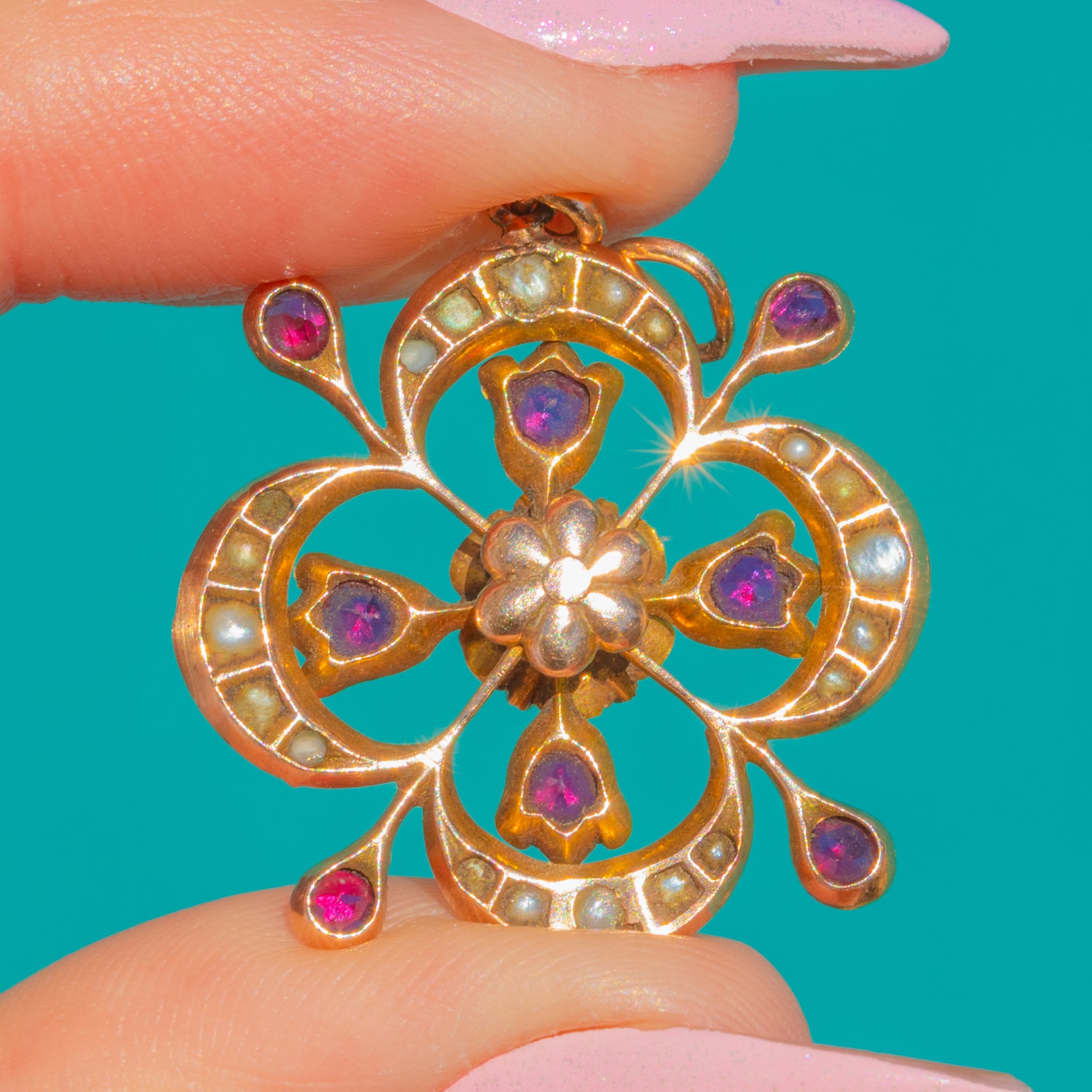 A romantic Victorian treasure, this 9ct Gold clover pendant blooms with vivid Natural Rubies and luminous Natural Pearls. The openwork quatrefoil silhouette is centred by a raised oval Ruby, with further Rubies radiating like petals and delicate Pearls tracing the curves for a softly glowing halo. Its warm Gold tone and fine detailing give the piece a graceful, heirloom presence.