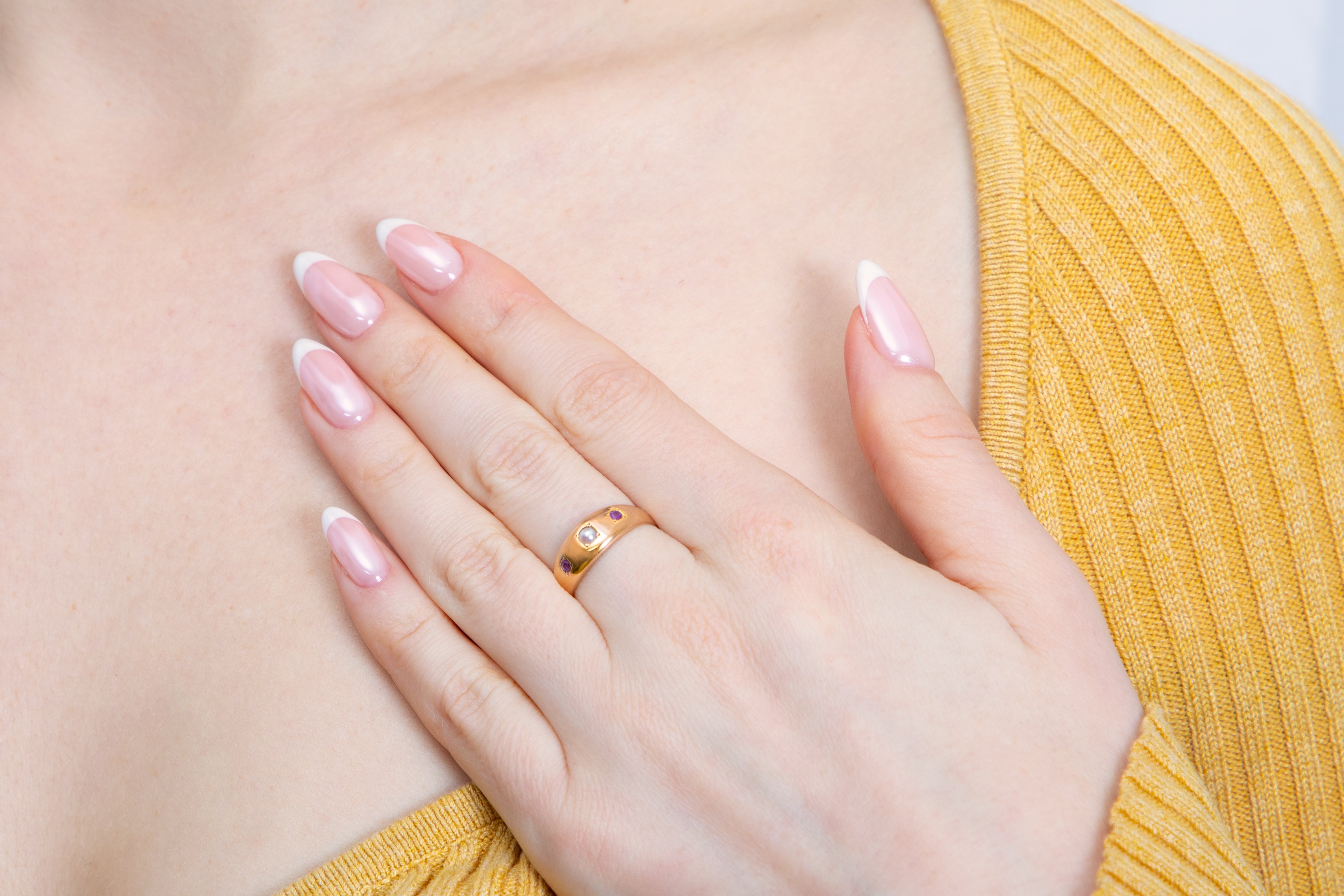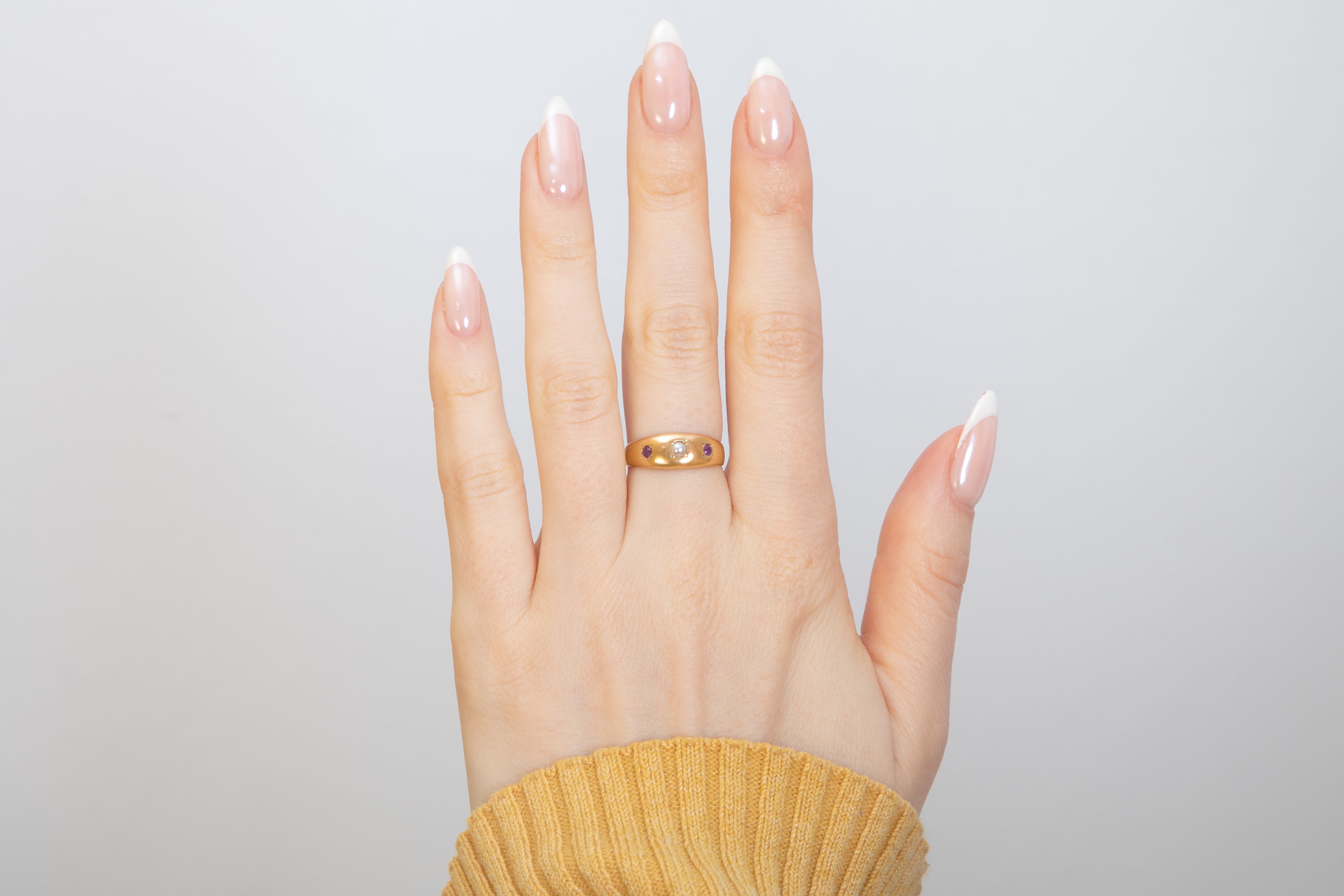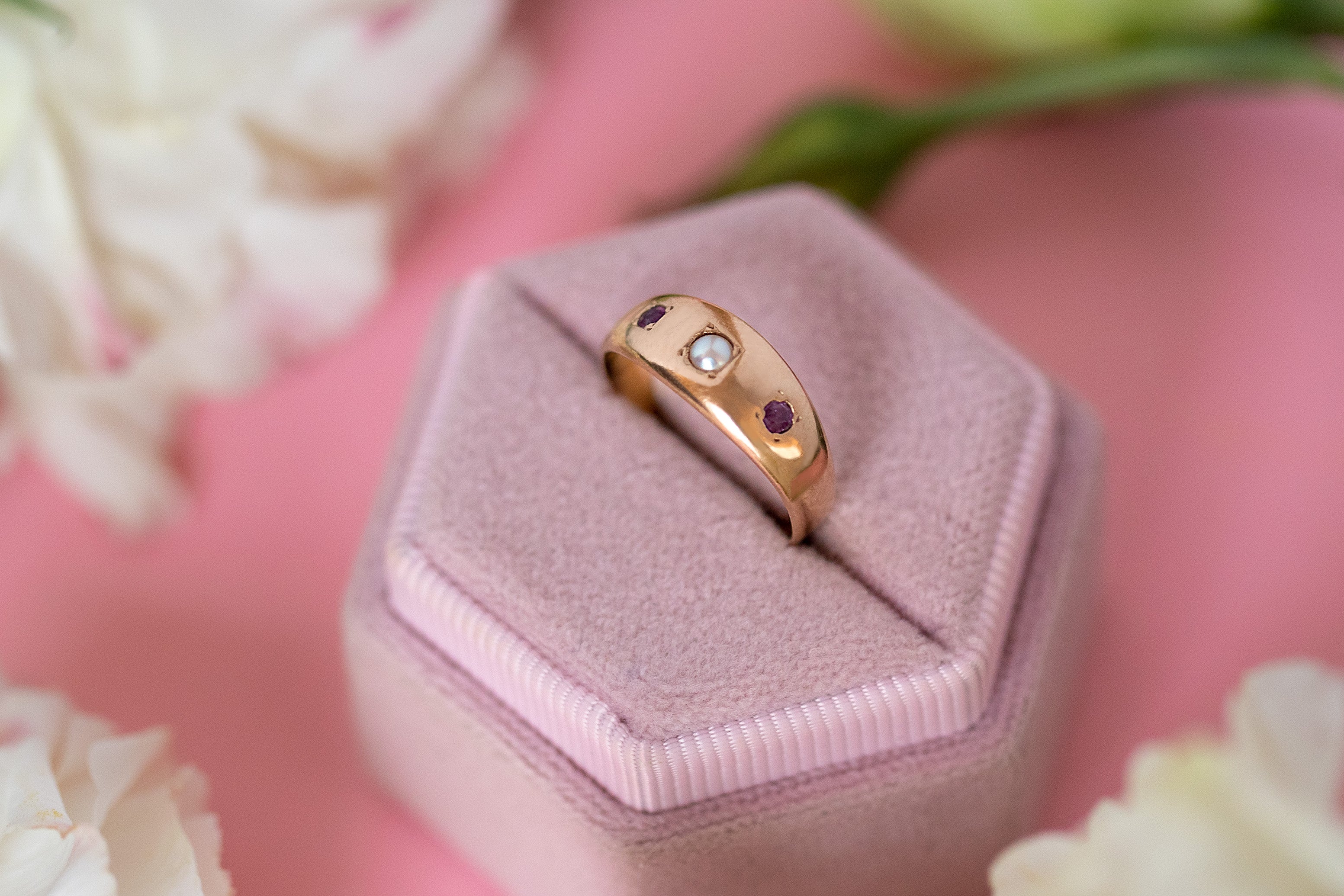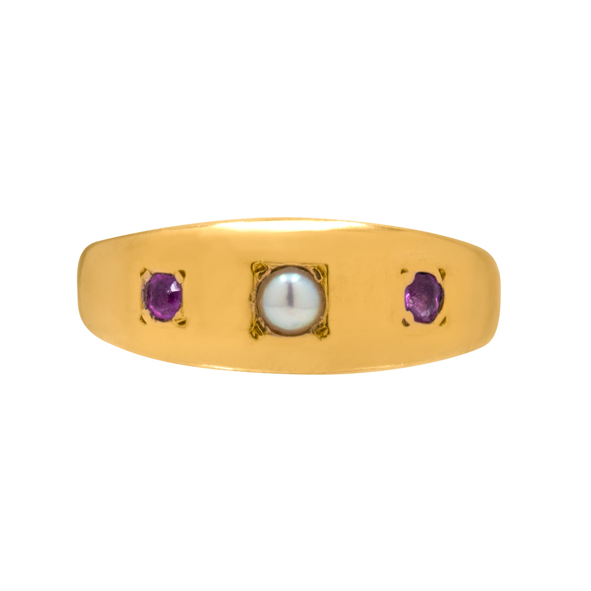This antique 9ct Gold Ruby Pearl Gypsy ring is a dream! Her buttery 15ct Gold homes a wondrous Pearl flanked by two fuchsia Rubies. A versatile piece, this Victorian trilogy ring is super stackable.
