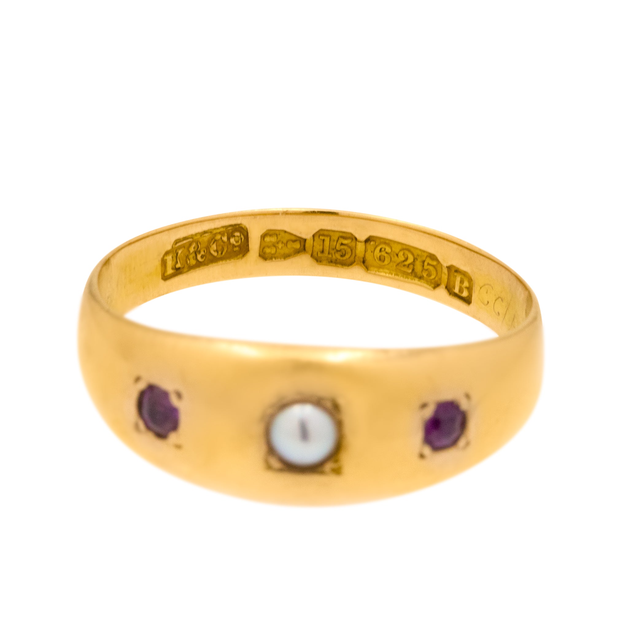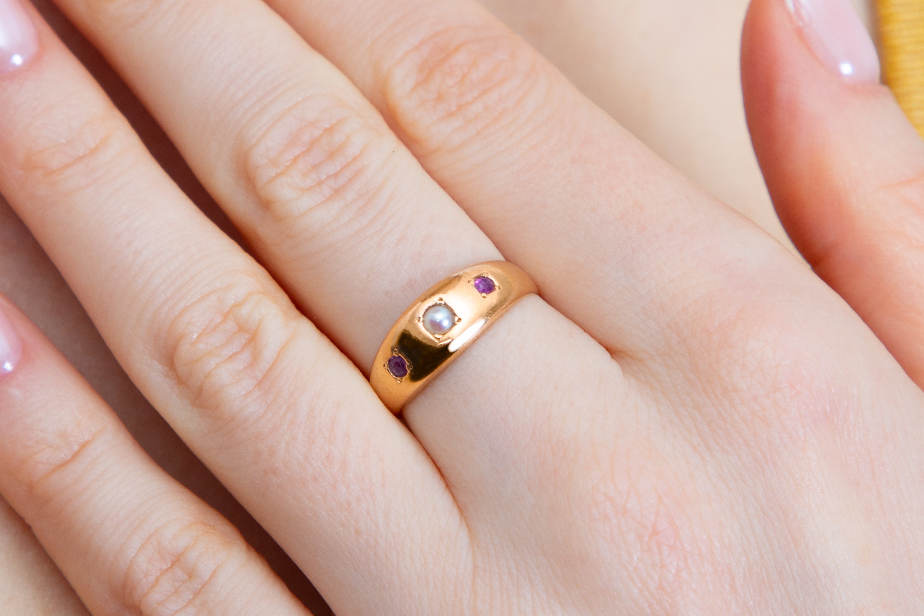 EXCELLENT: This antique 9ct Gold Ruby Pearl gypsy ring in in superb antique condition. She is Victorian, flaunting chunky & clear hallmarks. All gemstones sits secure, and her buttery band glides onto the hand like a dream! Dating back to 1885, her beauty has been well preserved, bar very minor signs of surface wear to the back of the band - there is little else to report!